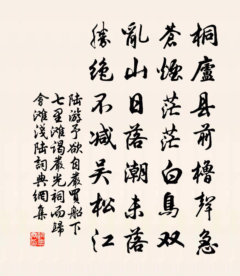 詩詞名句歷史字典書法欣賞書法字典國語詞典說文解字康熙字典古漢語字典標 題 作 者 詩 句 予欲自嚴買船下七里灘謁嚴光祠而歸會灘淺陸作者:陸游 朝代:宋代原文桐廬縣前櫓聲急,蒼煙茫茫白鳥雙。亂山日落潮未落,勝絕不減吳松江。詩詞問答問:《予欲自嚴買船下七里灘謁嚴光祠而歸會灘淺陸》的作者是誰?答:陸游問:該詩寫於哪個朝代?答:宋代問:陸游的名句有哪些?答:陸游名句大全書法欣賞予欲自嚴買船下七里灘謁嚴光祠而歸會灘淺陸書法作品詩文賞析原題:予欲自嚴買船下七里灘謁嚴光祠而歸會灘淺陸行至桐廬始能泛江因得絕句詩詞推薦和子直聞運使兵部駐節京口寄呈如晦陳襄〔宋代〕南徐新政煥秋陽,九日登臨喜觴。送酒客尋方外士,觀風人是省中郎。千家弦管聞謠俗,萬頃湖山入燕堂。使節未桐廬方正父家藏唐翰林畫白芍藥予來領郡事因范仲淹〔宋代〕治亂興衰甚可嗟,徒憐水調訴榮華。開元盛事今何在,尚有霓裳寄此花。送張交代琮趙蕃〔宋代〕歷數旴江士,推君父子間。夷途有霄漢,蹇步乃荊蠻。薦牘方爭上,交情勿重攀。無緣更州縣,小試亦編刪。初春苦寒久不到雙溪成長句書懷王炎〔宋代〕老去頗多病,苦寒摧折之。袍繭非不溫,不能護清羸。 * 穩附火,蓄縮如凍龜。西山有桃李,借問惟枯枝。好花月夜有懷陳子昂〔唐代〕美人挾趙瑟,微月在西軒。寂寞夜何久,殷勤玉指繁。清光委衾枕,遙思屬湘沅。空簾隔星漢,猶夢感精魂。夢遊洛中十首蔡襄〔宋代〕白馬寺前冠蓋盛,送行賓友盡英豪。耿丞血染邊場草,留得聲名日月高。登真觀遺履池張嵲〔宋代〕古柏參天鶴不歸,空餘池水澹清暉。當時遺舄今安在,應作雙鳧過水飛。越人以幕養花因游其下二首王安石〔宋代〕尚有殘紅已可悲,更憂回首隻空枝。莫嗟身世渾無事,睡過春風作惡時。孫參政知命帖贊岳珂〔宋代〕古稱君相不言命。執國大政,而猶拳拳於富貴功名之競。其言雖獨應,予猶以為病。贈別史堯弼〔宋代〕江湖聞遠役,風雨弄扁舟。邂逅逢吾子,周旋寫我憂。雲瞻三峽晦,波動五湖秋。恨別休驚鳥,相忘已兩鷗。老學庵北窗雜書陸游〔宋代〕茅齋遙夜養心君,靜處工夫自策勛。正喜殘香伴幽獨,鴉鳴窗白又紛紛。西風釋文珦〔宋代〕西風落葉間,孤客有餘閒。寒水皆歸壑,秋雲不離山。鶻翻枯草去,鴉帶夕陽還。幽趣何人共,柴門只自關。石麒麟馬之純〔宋代〕石虎石羊還石人,此間獨有石麒麟。定應側近藏陵墓,仗此威靈護鬼神。一石琢成高且大,兩頭相望儼如真。參天古禪人乞語釋亮〔宋代〕底事完全亘古今,何勞特地偏參尋。草鞋蹋破知端的,悔涉山川恨轉深。次趙有翼簡徐聖可元韻曾協〔宋代〕已向幽居賦晚清,欲經絕壁訪神清。不憂五柳荒松菊,敢嘆三閭帶杜蘅。愧無風月三千首,賴有絲桐一再行。誰似郊廟歌辭。周宗廟樂舞辭。明德舞佚名〔唐代〕惟彼岐陽,德大流光。載造周室,澤及遐荒。於鑠聖祖,上帝是皇。乃聖乃神,知微知彰。新廟奕奕,豐年穰穰。冬夜姚侍御宅送李廓少府無可〔唐代〕王事圭峰下,將還禁漏余。偶歡新歲近,惜別後期疏。雪罷見來吏,川昏聊整車。獨吟多暇日,應寄柏台書。武陵春向滈〔宋代〕長記酒醒人散後,風月滿江樓。樓外煙波萬頃秋。高檻冷颼颼。想見雲鬟香霧濕,斜墜玉搔頭。兩處相思一樣愁。水龍吟 登滕王閣張野〔元代〕畫檐叢翠凌霄,暮雲還送西山雨。千年陳跡,一時勝概,東南賓主。佩玉鳴鑾,西風吹入,江聲柔艫。漫登臨贏得賜劉能真三首宋高宗〔宋代〕太白巃嵷東南馳,眾嶺環合青分披。煙雲厚薄皆可愛,木石疏密自相宜。陽春已歸鳥語樂,溪水不動魚行遲。生民名句推薦江帶峨眉雪,川橫三峽流。李白《經亂離後天恩流夜郎憶舊遊書懷贈江夏韋太守良宰》 舉棋不定,不勝其耦。左丘明《左傳·襄公·襄公二十五年》 登舟望秋月,空憶謝將軍。李白《夜泊牛渚懷古》 撥雪尋春,燒燈續晝。暗香院落梅開後。毛滂《踏莎行·元夕》 百花頭上開,冰雪寒中見。辛棄疾《生查子·重葉梅》 軍中宜劍舞,塞上重笳音。張說《幽州夜飲》 一時輕信人言語.自有明人話不平。馮夢龍《警世通言·卷四》 青山橫北郭,白水繞東城李白《送友人》 半盞屠蘇猶未舉,燈前小草寫桃符。陸游《除夜雪》 翠華想像空山里,玉殿虛無野寺中。杜甫《詠懷古蹟五首·其四》