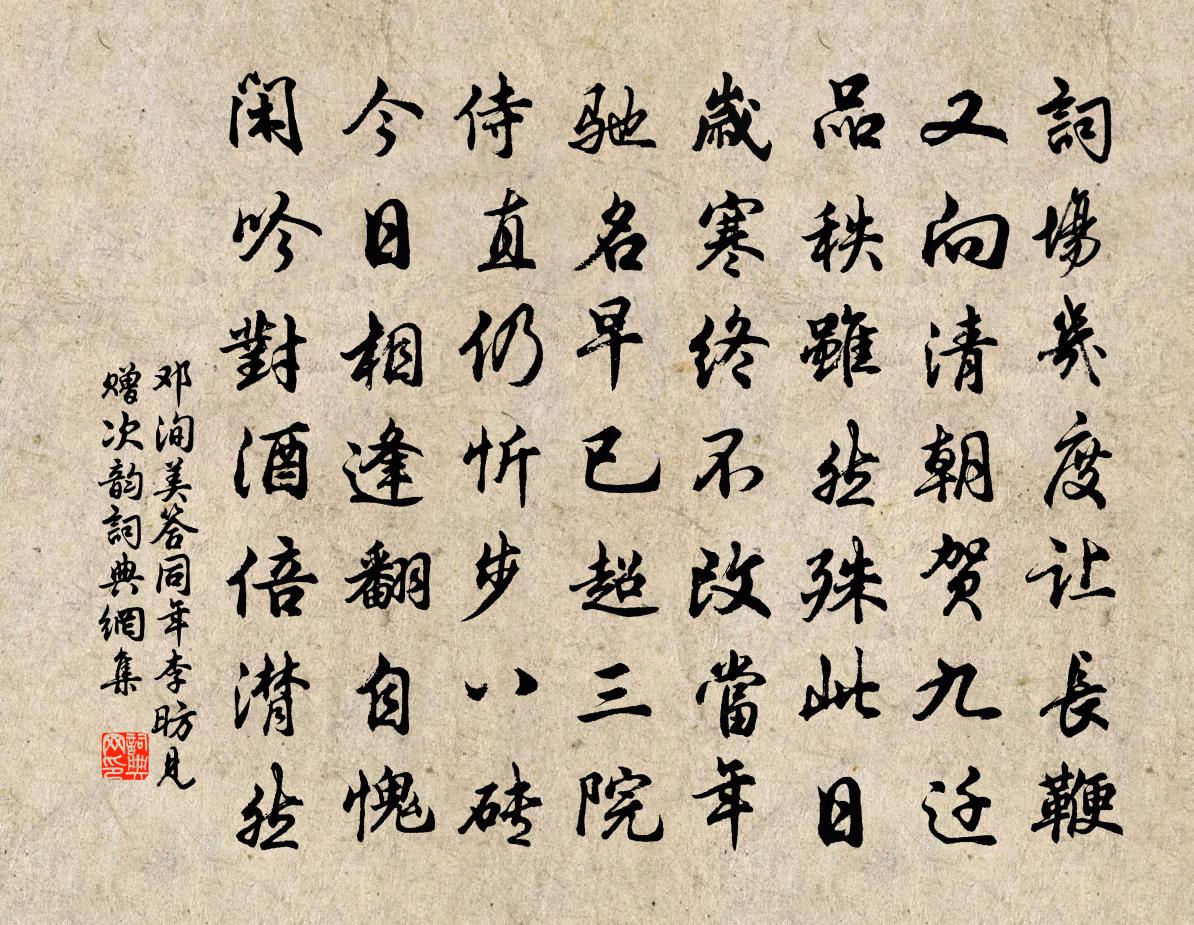 詩詞名句歷史字典書法欣賞書法字典國語詞典說文解字康熙字典古漢語字典標 題 作 者 詩 句 答同年李昉見贈次韻作者:鄧洵美 朝代:唐代答同年李昉見贈次韻原文詞場幾度讓長鞭,又向清朝賀九遷。品秩雖然殊此日,歲寒終不改當年。馳名早已超三院,侍直仍忻步八磚。今日相逢翻自愧,閒吟對酒倍潸然。詩詞問答問:答同年李昉見贈次韻的作者是誰?答:鄧洵美問:答同年李昉見贈次韻寫於哪個朝代?答:唐代問:答同年李昉見贈次韻是什麼體裁?答:七律鄧洵美答同年李昉見贈次韻書法欣賞答同年李昉見贈次韻書法作品注釋全唐詩:卷734-8詩詞推薦傳言玉女(許永之以水仙、瑞香、黃香梅、幽蘭同坐,名生四和,即席賦此)楊無咎〔宋代〕小院春長,整整繡簾低軸。異葩幽艷,滿千瓶百斛。珠鈿翠佩,塵襪錦籠環簇。日烘風和,奈何芬馥。鳳髓龍津,晚步清暉不見主人題竹間陳文蔚〔宋代〕飽食無餘事,逍的散步行。清暉人不見,鷗鷺自相迎。嘉禾百詠紅薇逕張堯同〔宋代〕漸放秋風晚,花無爛漫香。淺深紅似錦,散影在滄浪。白牡丹白居易〔唐代〕白花冷澹無人愛,亦占芳名道牡丹。應似東宮白贊善,被人還喚作朝官。哭長孫侍御(一作杜誦詩。以下為杜甫補遺)杜甫〔唐代〕道為謀書重,名因賦頌雄。禮闈曾擢桂,憲府舊乘驄。流水生涯盡,浮雲世事空。唯餘舊台柏,蕭瑟九原中。堤上偶成乾隆〔清代〕運河轉漕達都京,策馬春風堤上行。九里崗臨御黃壩,曾無長策只心驚。華州榜寄諸門生薛昭緯〔唐代〕時君過聽委平衡,粉署華燈到曉明。開卷固難窺浩汗,執衡空欲慕公平。機雲筆舌臨文健,沈宋章篇發詠清。自笑酬王十八見寄白居易〔唐代〕秋思太白峰頭雪,晴憶仙遊洞口雲。未報皇恩歸未得,慚君為寄北山文。讀樂天集戲作五絕蘇轍〔宋代〕樂天投老刺抗蘇,溪石胎禽載舳艫。我昔不為二千石,四方異物固應無。不飲贈官妓杜牧〔唐代〕芳草正得意,汀洲日欲西。無端千樹柳,更拂一條溪。幾朵梅堪折,何人手好攜。誰憐佳麗地,春恨卻淒淒。醉後贈馬四孟浩然〔唐代〕四海重然諾,吾嘗聞白眉。秦城遊俠客,相得半酣時。又借前韻見意黃庭堅〔宋代〕招潮瘦惡無永味,海鏡鑯毫只強顏。想見霜臍當大嚼,夢回雪壓摩圍山。次韻劉友鶴端午三首高斯得〔宋代〕昔經屈原坂,寒湍下悲鳴。又渡汨羅江,{左氵右往}記曾輸誠。慨彼幽亂國,成此湘纍名。雕胡不受膩,淆予膳洞仙歌(重九藥市)京鏜〔宋代〕三年錦里,見重陽藥市。車馬喧闐管弦沸。笑籬邊孤寂,台上疏狂,爭得似,此日西南都會。痴兒官事了,樂與民登金山寺齊己〔唐代〕四面白波聲,中流翠嶠橫。望來堪目斷,上徹始心平。鳥向天涯去,雲連水國生。重來與誰約,題罷自吟行。次洪內相雙竹韻三首裘萬頃〔宋代〕嬋娟兩枝翠可掬,絕勝白璧南金雙。留與先生作椽筆,詩壇八面受人降。沁園春雷應春〔宋代〕問訊茶故園,今茶如之何,茶還勝昔無茶。想舊耘蘭蕙,依然蔥茜,新栽楊柳,亦已扶疏。韭本千畦,芋根一畝,廣列女四首劉克莊〔宋代〕前有條桑女子,後有茶蕊夫人。潔以自媒為婦,賢於奉表稱臣。吳傳朋遊絲帖歌劉子翬〔宋代〕園清無瑕二三月,時見遊絲轉空闊。誰人寫此一段奇,著紙春風吹不脫。紛紜糾結疑非書,安得龍蛇如許癯。神縱從子滌濯寒納涼樓鑰〔宋代〕楊柳陰陰映粉牆,密雲藏雨晚來涼。高荷欲出欄幹上,笑挹紅英吸淨香。名句推薦遙想獨游佳味少,無方騅馬但鳴嘶。蘇轍《懷澠池寄子瞻兄》 相顧無言,惟有淚千行。蘇軾《江城子·乙卯正月二十日夜記夢》 白日不到處,青春恰自來。袁枚《苔》 三歲為婦,靡室勞矣。夙興夜寐,靡有朝矣。佚名《氓》 桃未芳菲杏未紅,沖寒先已笑東風。曹雪芹《紅樓夢·第五十回》 使殺生之機,奪予之要在大臣,如是者侵。韓非及後人《韓非子·三守》 楚江湄,湘娥乍見,無言灑清淚周密《繡鸞鳳花犯·賦水仙》 鄉思不堪悲橘柚,旅遊誰肯重王孫。譚用之《秋宿湘江遇雨》 鴛鴦密語同傾蓋,且莫與、浣紗人說。張炎《疏影·詠荷葉》 風勁角弓鳴,將軍獵渭城。王維《觀獵》