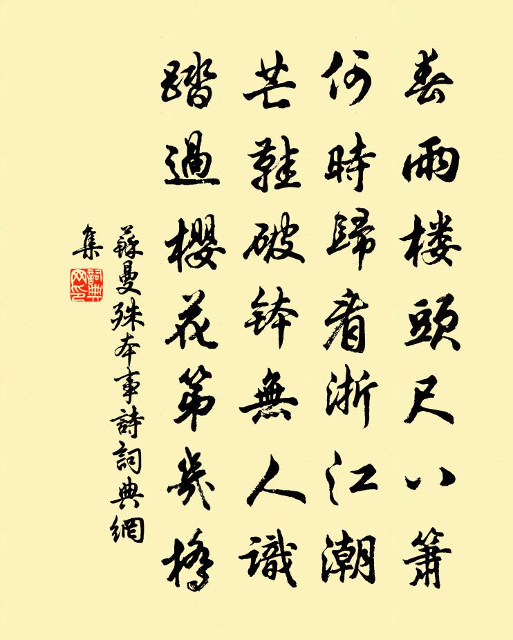 詩詞名句歷史字典書法欣賞書法字典國語詞典說文解字康熙字典古漢語字典標 題 作 者 詩 句 本事詩作者:蘇曼殊 朝代:近現代本事詩原文春雨樓頭尺八簫,何時歸看浙江潮? 芒鞋破缽無人識,踏過櫻花第幾橋。 詩詞問答問:本事詩的作者是誰?答:蘇曼殊問:本事詩寫於哪個朝代?答:近現代問:本事詩是什麼體裁?答:七絕書法欣賞本事詩書法作品詩詞推薦煎茶成彥雄〔唐代〕岳寺春深睡起時,虎跑泉畔思遲遲。蜀茶倩個雲僧碾,自拾枯松三四枝。春歸俞桂〔宋代〕晴天氣淑濃如酒,引得狂蜂路亦迷。獨立欄乾凝望處,賣花人在畫橋西。題裴二十一新園(一作題裴固新園,又作裴周)皇甫冉〔唐代〕東郭訪先生,西郊尋隱路。久為江南客,自有雲陽樹。已得閒園心,不知公府步。開門白日晚,倚杖青山暮。果熟竹王睿〔唐代〕庭竹森疏玉質寒,色包蔥碧盡琅玕。翠筠不樂湘娥淚,斑籜堪裁漢主冠。成韻含風已蕭瑟,媚漣凝淥更檀欒。此君驀山溪王哲〔元代〕人人不省,日日光陰急。*路是輪迴,前途事、暗中似漆。觀公風貌,俊格最青春,多清淨,少貪求,善事休交失逍遙詠宋太宗〔宋代〕千年福壽自由人,萬象星羅仰在身。寶馬不教龜鱉乳,嘉禾須問谷田神。根株種植華池內,藥鼎煎催運火勻。混沌南歌子(道中直重九)趙長卿〔宋代〕此日知何日,他鄉憶故鄉。亂山深處過重陽。走馬吹花、無復少年狂。 * 擎枝重,紅茱濕露香。扁舟隨雁過瀟湘包家園陽枋〔宋代〕眾綠爭齊敷夏蔭,老紅猶自駐春妝。間紅浪綠俱休問,爭似岩松一色蒼。和劉後村梅花百詠方蒙仲〔宋代〕梅嘆知音少曠夔,政須我輩與伸眉。逋仙詩勝多多許,咀嚼無令一字遺。觀音岩陳岩〔宋代〕一性圓時萬境通,三生綺念墮真空。如今舉眼無非佛,身在光明法界中。西江月丘崈〔宋代〕恰好輕篷短棹,絕勝錦纜牙檣。一聲橫笛起微茫。十里紅蓮步障。小待山頭吐月,何妨說劍杯長。更看風露洗湖光秋蓮劉因〔元代〕瘦影亭亭不自容,淡香杳杳欲誰通?不堪翠減紅銷際,更在江清月冷中。擬欲青房全晚節,豈知白露已秋風。盛衰外孫文驥與可學士之孫也予親教之學作詩俊發蘇轍〔宋代〕已矣石室老,奄然三十年。遺孫生不識,妙理定誰傳。孔汲仍聞道,賈嘉終象賢。文章猶細事,風節記高堅。南遊圖唐寅〔明代〕江上春風吹嫩榆,扶琴送子曳長裙。相逢若有知音者,隨地芟茅好結廬。吉老手刃凶人為母報仇詩以紀之喻良能〔宋代〕臥冰叱馭全忠孝,王氏多賢今古同。公乎孝行驚創見,落落豈特漢晉風。凶人夜半發丘隴,敢爾 * 不畏公。古來冷日過驪山(一作孟遲詩)趙嘏〔唐代〕冷日微煙渭水愁,翠華宮樹不勝秋。霓裳一曲千門鎖,白盡梨園弟子頭。寒食趙友直〔宋代〕人道芳辰載酒行,予心翻起古今情。紙錢燒罷歸來後,猶有原頭杜宇聲。謁新漢州範文叔度正〔宋代〕巴岳東峰下,舂陵別駕蹤。陳編新德業,陋質古心胸。雅得千秋契,那知並世逢。樂哉開後覺,乞我一中庸。夕月十首佚名〔宋代〕白藏在序,享惟其時。躬即明壇,禮惟載祗。斟以瑤爵,神靈燕娭。歆聲顧德,錫我蕃釐。雪後曉過八盤嶺詣東宮謝受左司告二首楊萬里〔宋代〕扶業梢上上朝暾,起早行遲卻載奔。玉作宮城三萬雉,呼僮換馬入金門。名句推薦漠漠梨花爛漫,紛紛柳絮飛殘。陳允平《紅林擒近·壽詞·滿路花》 將者,上不制於天,下不制於地,中不制於人。尉繚《尉繚子·兵談》 使人有乍交之歡,不若使人無久處之厭。陳繼儒《小窗幽記·集醒篇》 龍吟虎嘯一時發,萬籟百泉相與秋李頎《聽安萬善吹觱篥歌》 夢回芳草思依依,天遠雁聲稀。李煜《喜遷鶯·曉月墜》 夜月一簾幽夢,春風十里柔情。秦觀《八六子·倚危亭》 湖上春既早,田家日不閒。丘為《題農父廬舍》 憶君迢迢隔青天,昔日橫波目,今作流淚泉。李白《長相思·其二》 秋江帶雨,寒沙縈水,人瞰畫閣愁獨。史達祖《八歸·秋江帶雨》 明主之道,必明於公私之分韓非及後人《韓非子·飾邪》