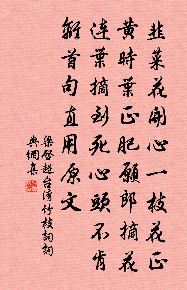 詩詞名句歷史字典書法欣賞書法字典國語詞典說文解字康熙字典古漢語字典標 題 作 者 詩 句 台灣竹枝詞作者:梁啓超 朝代:清代台灣竹枝詞原文韭菜花開心一枝,花正黃時葉正肥。願郎摘花連葉摘,到死心頭不肯離。首句直用原文。詩詞問答問:台灣竹枝詞的作者是誰?答:梁啓超問:台灣竹枝詞寫於哪個朝代?答:清代梁啓超台灣竹枝詞書法欣賞台灣竹枝詞書法作品詩文賞析晚涼步墟落,輒聞男女相從而歌,譯其辭意,惻惻然若不勝《谷風》、《小弁》之怨者。乃掇拾成什,為遺黎寫哀云爾。詩詞推薦秋晚雜書三十首方回〔宋代〕世稱陶謝詩,陶豈謝可比。池草固未雕,階藥已頗綺。如唐號元白,白豈元可擬。中有不同處,要與分朴詭。鄭圃送友人南下歐陽修〔宋代〕河橋別柳減春條,隔浦挐音聽已遙。千里羹蓴夸敵酪,滿池滮稻欲鳴蜩。東風楚岸神靈雨,殘月吳波上下潮。如吊扶南曲歌詞五首王維〔唐代〕翠羽流蘇帳,春眠曙不開。羞從面色起,嬌逐語聲來。早向昭陽殿,君王中使催。堂上青弦動,堂前綺席陳。齊歌贊朝陽穿破衲待月了殘經釋法薰〔宋代〕日晷已殂,我經未了。掩卷立須臾,冰壺掛森杪。送趙吏部釋善珍〔宋代〕健才事聲名,撫案走百吏。法家冠柱文,好以殺為戲。要留百年思,莫令一時畏。近時攀轅民,未必皆民意。朅來吳汝弌〔宋代〕嶺上朅來弄明月,千里銀光寒不缺。蝦{左蟲右麻}魍魎走死盡,直數秋毫上金闕。心如此月月如心,嗒然獨據無浣溪沙吳潛〔宋代〕春岸春風荻已芽。推排春事到蘆花。只應推上鬢邊華。投老未歸真左計,久陰得霽且舒懷。紅紅白白有殘葩。謁金門·花過雨李好古〔宋代〕花過雨。又是一番紅素。燕子歸來銜繡幕。舊巢無覓處。誰在玉樓歌舞。誰在玉關辛苦。若使胡塵吹得去。東風侯挽曹侍郎方岳〔宋代〕諸老各凋零,公乎獨典刑。草堂春得句,雪戶夜談經。歲月頭從白,江山眼共青。斯文今已矣,天亦自冥冥。題雪峰因大夢頂相李昴英〔宋代〕終朝咬菜根,那得許精神。自笑形為贅,從渠畫不真。閒雲留片影, * 化千身。大夢何時覺,痴人問木人。頌古釋道顏〔宋代〕半夜墨漆黑,捉得一個賊。點火照來看,元是王大伯。上邵尚書郭印〔宋代〕康節名天下,流芳到子孫。素風門戶遠,皇極典型存。存邑紛戎馬,十年辭帝閽。家艱俄茹苦,國難更堪論。上念霅溪夜宴詩(屈大夫歌)水神〔唐代〕鳳鶱鶱以降瑞兮,患山雞之雜飛。玉溫溫以呈器兮,因砆砆之爭輝。當侯門之四辟兮,墐嘉謨之重扉。既瑞器而無金陵雜興二百首蘇泂〔宋代〕東冶亭東轉半山,栽松庵外萬琅玕。重來鍾阜同僧話,回顧城中幾客閒。次韻沈千里玉山道中風寄韓元吉〔宋代〕霜晴懷玉自生煙,寒色淒淒過雁邊。路轉湘南知幾日,山連楚尾又窮年。相期雞黍情歡甚,惜別塵埃意黯然。馬上同潘丈游東平瀑陳宓〔宋代〕天公特地放初晴,許我聯鑣琬琰行。新著茅亭憑到晚,難將一字扁佳名。十二月二十一日贈沃令張嵲〔宋代〕訟庭無事長苔衣,臥聽松風白晝遲。紙帳亂紋龜殼皺,道衫深綠鶴翎垂。麈犀揮處論前史,香篆銷時理秘辭。官事句裴次元〔唐代〕積高依郡城,迥拔凌霄漢。摸魚兒 題熊伯宜藏梅花捲子張翥〔元代〕記西湖、水邊曾見,查牙老樹如此。冰痕冷沁苔枝雪,的*數花才試。天也似。愛玉質、清高不久閒紅紫。孤山處四字令周密〔宋代〕眉消睡黃,春凝淚妝。玉屏水暖微香,聽蜂兒打窗。箏塵半妝,綃痕半方。愁心欲訴垂楊,奈飛紅正忙。名句推薦道之以政,齊之以刑,民免而無恥。孔子弟子《論語·為政篇》 治民無常,唯治為法。韓非及後人《韓非子·心度》 勞心者治人,勞力者治於人。孟子《孟子·滕文公章句上·第四節》 談虛語玄,不覺日之將夕; 登涉山水,不知老之將至。房玄齡《晉書·載記·第十四章》 送君如昨日,檐前露已團。江淹《古離別》 雞聲茅店月,人跡板橋霜。溫庭筠《商山早行》 可憐報國無路,空白一分頭。楊炎正《水調歌頭·登多景樓》 殘酒憶荊高,燕趙悲歌事未消。陳維崧《南鄉子·邢州道上作》 元嘉草草,封狼居胥,贏得倉皇北顧。辛棄疾《永遇樂·京口北固亭懷古》 東門之楊,其葉牂牂。佚名《東門之楊》