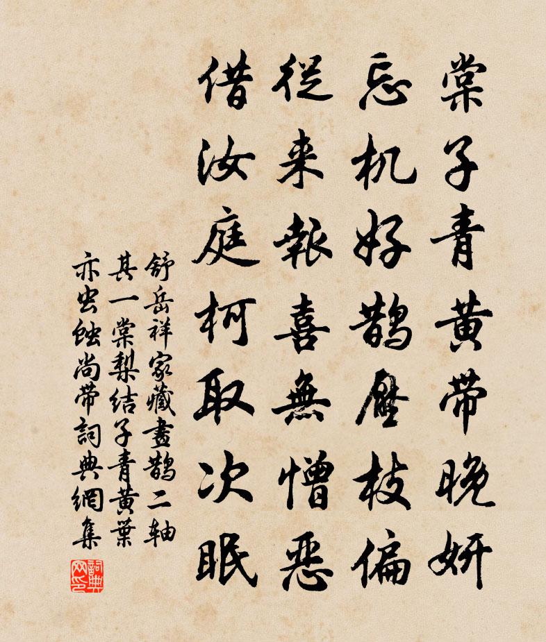 詩詞名句歷史字典書法欣賞書法字典國語詞典說文解字康熙字典古漢語字典標 題 作 者 詩 句 家藏畫鵲二軸其一棠梨結子青黃葉亦蟲蝕尚帶作者:舒岳祥 朝代:宋代原文棠子青黃帶晚妍,忘機好鵲壓枝偏。從來報喜無憎惡,借汝庭柯取次眠。詩詞問答問:《家藏畫鵲二軸其一棠梨結子青黃葉亦蟲蝕尚帶》的作者是誰?答:舒岳祥問:該詩寫於哪個朝代?答:宋代書法欣賞家藏畫鵲二軸其一棠梨結子青黃葉亦蟲蝕尚帶書法作品詩文賞析【原題】:家藏畫鵲二軸其一棠梨結子青黃葉亦蟲蝕尚帶晚花有鵲眠枝上枝若垂垂不勝者其一作欹竹一莖有鵲把竹磔螳螂而食之葉若振振而動搖者筆意精妙非黃筌不能也詩詞推薦琴調相思引周邦彥〔宋代〕生碧香羅粉蘭香。冷綃緘淚倩誰將。故人何在,煙水隔瀟湘。花落燕□春欲老,絮吹思浪日偏長。一些兒事,何處早春西湖閒遊,悵然興懷,憶與微之同賞,因白居易〔唐代〕上馬復呼賓,湖邊景氣新。管弦三數事,騎從十餘人。立換登山屐,行攜漉酒巾。逢花看當妓,遇草坐為茵。西日游野航次元應韻三首李流謙〔宋代〕平地坐我帆檣中,翠峰出沒工為容。輕鷗舞晴水照影,蒼蛟吼浪雪薄胸。漁舠系月江一曲,樵斧斫雪山幾重。詩翁宿灃曲僧舍溫庭筠〔唐代〕東郊和氣新,芳靄遠如塵。客舍停疲馬,僧牆畫故人。沃田桑景晚,平野菜花春。更想嚴家瀨,微風盪白蘋。春晚登郡樓邵博〔宋代〕久客無歡意,經時只倦遊。落花猶解舞,飛絮太侵愁。日暮聞吹角,春歸獨倚樓。平生湖海原,幽興滿扁舟。飲石洞酒戲作陸游〔宋代〕酣酣霞暈力通神,澹澹鵝雛色可人。一笑破除垂老日,滿懷搖盪隔年春。梅花的的吹初破,楊柳纖纖染未勻。醉倒偈頌一百零九首釋可湘〔宋代〕世事悠悠,美景難留。不可寢於長夜,須來共賞中秋。天宇淨,桂花浮。一片月生海,幾家人上樓。山居雜詩九十首曹勛〔宋代〕蓬蓽久不居,乍歸欣故情。落葉聚蛛網,殘莎鬧蛩聲。跡與朝市遠,夢隨風月清。從此眠食間,蕭散安可得石州慢 和黃一峰秋興張雨〔元代〕落日空城,禾黍夜深,砧杵才歇。怪他蘿薜*衣,風露潤滋涼浹。清愁多少,只消目送飛鴻,五弦已是心悲咽。把挽江公三首陳棣〔宋代〕憶昔羈棲日,唯公跡分親。呼盧銀燭夜,琢句錦囊春。碁敵爭先勁,弓號命中頻。向來行樂地,無復見斯人。梅林春信李侗〔宋代〕積雪千林凍欲摧,倚欄日日望春回。天公為我傳訊息,故遣梅花特地開。漁歌子佚名〔宋代〕一任孤舟正又斜。乾坤何路指生涯。拋歲月,臥煙霞。在處江山便是田人夜歸梅堯臣〔宋代〕田收野更迥,墟里隔煙陂。荒徑已風急,獨行唯犬隨。荊扉候不掩,稚子望先知。自是一生樂,何須閭井為。送高才卿出守嘉定魏了翁〔宋代〕十年誰遣不寧侯,麇奔鳥散十七州。余州蹙蹙能幾許,史君今作載酒游。諸公飲儁已濡首,眼前百事不掛口。震風路上寄銀匙與阿龜白居易〔唐代〕謫宦心都慣,辭鄉去不難。緣留龜子住,涕淚一闌乾。小子須嬌養,鄒婆為好看。銀匙封寄汝,憶我即加餐。送丁卿季吏部赴召楊萬里〔宋代〕吾州史君五十年,不曾召節來日邊。老夫送人作太守,不曾送人上九天。玉皇去年選丁寬,遣求螺浦蘇煢鱞。玉皇水龍吟 次韻王本中賦樓子芍藥張翥〔元代〕寶樓十二玲瓏,仙家只在雲間住。金盤舞罷,羅裙襞皺,乘風欲去。畫檻移春,彩鸞銜信,幾番延佇。看釵莛疊萼頌古三十九首釋道樞〔宋代〕一番雨過一番晴,蠶眼已開桑眼青。鵓鳩樹頭啼不已,百舌黃鸝相共鳴。湖州崔郎中曹長寄三癖詩自言癖在詩與琴酒…四韻以謝之劉禹錫〔唐代〕視事畫屏中,自稱三癖翁。管弦泛春渚,旌旆拂晴虹。酒對青山月,琴韻白蘋風。會書團扇上,知君文字工。菩薩蠻(春晚二首)梅窗〔宋代〕點點花飛春恨淺。淺恨春飛花點點。鶯語似多情。情多似語鶯。戀春增酒勸。勸酒增春戀。顰損翠蛾新。新蛾翠損名句推薦不可以一時之譽,斷其為君子;不可以一時之謗,斷其為小人。馮夢龍《警世通言·卷四》 以言取士,士飾其言,以行取人,人竭其行。姚察、姚思廉《梁書·本紀·卷一》 峻法,所以凌過游外私也;嚴刑,所以遂令懲下也。韓非及後人《韓非子·有度》 秦中已久烏頭白,卻是君王未備知。李商隱《人慾》 人生百年有幾,念良辰美景,休放虛過。元好問《驟雨打新荷》 壚邊人似月,皓腕凝霜雪。韋莊《菩薩蠻·人人盡說江南好》 還作一段相思,冷波葉舞愁紅,送人雙槳。吳文英《解蹀躞·醉雲又兼醒雨》 雁濕行無次,花沾色更鮮。李世民《詠雨》 小桃枝下試羅裳,蝶粉斗遺香。陳子龍《訴衷情·春遊》 風住塵香花已盡,日晚倦梳頭。李清照《武陵春·春晚》