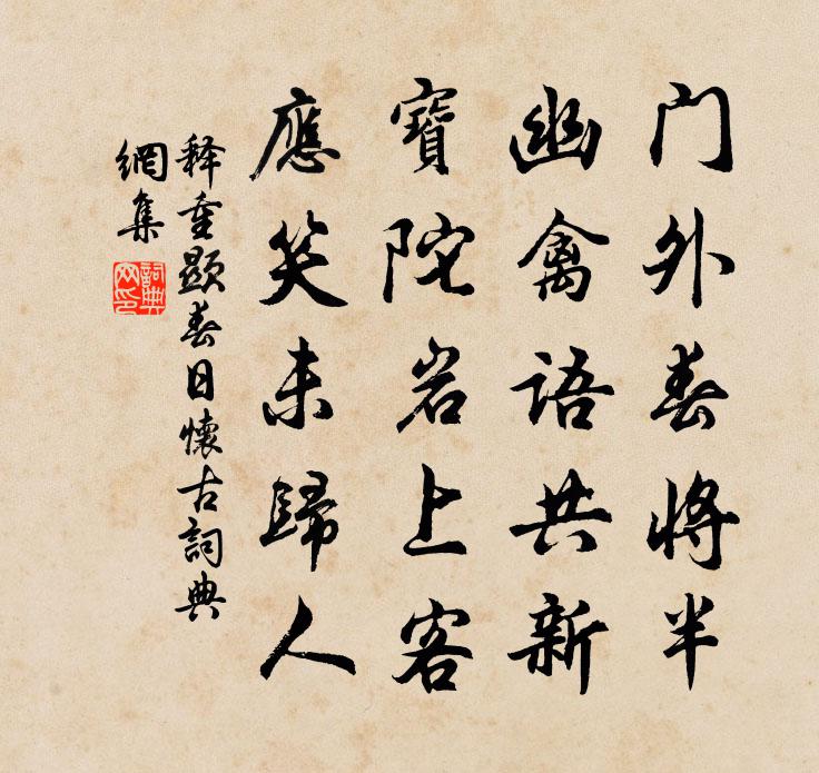 詩詞名句歷史字典書法欣賞書法字典國語詞典說文解字康熙字典古漢語字典標 題 作 者 詩 句 春日懷古作者:釋重顯 朝代:宋代春日懷古原文門外春將半,幽禽語共新。寶陀岩上客,應笑未歸人。詩詞問答問:春日懷古的作者是誰?答:釋重顯問:春日懷古寫於哪個朝代?答:宋代釋重顯春日懷古書法欣賞春日懷古書法作品詩詞推薦二月十日夜雨起書曾移忠禾譜後趙蕃〔宋代〕去年秋旱冬尤劇,一雪不能濡土瘠。立春日雨雖應時,到今闕然又幾日。遊人但欣春物榮,農夫痛心田未耕。我因謁金門周紫芝〔宋代〕春雨細。開盡一番桃李。柳暗曲闌花滿地。日高人睡起。綠浸小池春水。沙暖鴛鴦雙戲。薄倖更無書一紙。畫樓愁句邢恕〔宋代〕涓水帶西城,城高敞郡亭。皇佑五年三月乙巳齊大風海水暴上壽光千乘兩黃庶〔宋代〕鹽民沒利家海隅,奔走末業田園蕪。天意似遣陽侯驅,卷水沃殺煎海爐。怒濤百尺不及逋,老幼十五其為魚。耕夫木皮口紀事為故沔戎帥何進賦也程公許〔宋代〕驅車木皮口,地接嘉陵市。山種郁盤紆,草木慘憔悴。昔在歲辛卯,大將何憨子。行營與賊遇,力戰遂死此。道逢西溪子毛文錫〔唐代〕昨夜西溪游賞,芳樹奇花千樣。鎖春光,金尊滿,聽弦管。嬌妓舞衫香暖。不覺到斜暉,馬馱歸。送丘宗卿博士出守嘉禾以視民如傷為韻呂祖謙〔宋代〕折肱稱良醫,識病由身傷。開府事如麻,豈盡昔所嘗。平生老農語,易置復難忘。麥黃要經雪,橘黃要經霜。發豫章後二首趙蕃〔宋代〕楓林滅沒橘林多,酒戶漁家奈若何。剩欲與渠論久住,一官老矣尚奔波。三次前韻二首陳著〔宋代〕花本傷時不肯香,酒無賒處亦空忙。便逢花酒如何醉,回首淒煙鎖景陽。龍洞張嵲〔宋代〕靈洞何年水亂流,試尋危棧訪丹丘。此時景物迷三島,當日神龍跨九州。白晝瀑流方訝雨,炎天嵐氣忽驚秋。憧憧夜窗陸游〔宋代〕性中汝本具光明,蔽障除時道自成。手刈茆苫數椽屋,身鉏菜煮一杯羹。天人迭勝誰能測,禍福無常不待評。惟有上元夜送沈伯時赴南康山長孫銳〔宋代〕十載從游吾道南,山齋苜蓿澹於甘。飛魚想得三台兆,待雪空餘□丈函。席冷幾番馴白鹿,羅傳此夜賦黃柑。太平滴滴金楊無咎〔宋代〕相逢未盡論心素。早容易、背人去。憶得歌翻斷腸句。更惺惺言語。萋萋芳草迷南浦。正風吹、打船雨。靜聽愁聲宿山中田家翁森〔宋代〕欹坐頹檐醉濁醪,松油燒盡夜蕭騷。兒童十歲能吹笛,嘹亮一聲出月高。次韻酬率翁方岳〔宋代〕戍樓夢不到中州,杜牧新愁亦倦遊。留得荷鋤雙手在,山寒芋栗要人收。惜雙雙/惜分飛趙鼎〔宋代〕度隴信音誰與寄。腸斷江南千里。深雪前村里。一枝昨夜傳芳意。冷蕊暗香空旖旎。也應是、春來憔悴。風度將誰詠史徐九皋〔唐代〕亡國秦韓代,榮身劉項年。金槌擊政後,玉斗碎增前。聖主稱三傑,明離保四賢。已申黃石祭,方慕赤松仙。覽董評事思歸之什因以詩贈劉禹錫〔唐代〕幾年油幕佐征東,卻泛滄浪狎釣童。欹枕醉眠成戲蝶,抱琴閒望送歸鴻。文儒自襲膠西相,倚伏能齊塞上翁。更說醉中酬殷協律白居易〔唐代〕泗水亭邊一分散,浙江樓上重遊陪。揮鞭二十年前別,命駕三千里外來。醉袖放狂相向舞,愁眉和笑一時開。留君秋胡行曹植〔魏晉〕歌以詠言。大魏承天璣。名句推薦曲屏先暖鴛衾慣,夜寒深、都是思量。吳文英《風入松·為友人放琴客賦》 一江煙水照晴嵐,兩岸人家接畫檐,芰荷叢一段秋光淡張養浩《水仙子·詠江南》 有天命者任自為之,不汝禁也。脫脫《宋史·本紀·卷三》 尊前故人如在,想念我、最關情。周邦彥《綺寮怨·上馬人扶殘醉》 君子不以冥冥墮行。張廷玉《明史·列傳·卷三十七》 與朋友交,言而有信。孔子弟子《論語·學而篇》 夫子循循然善誘人孔子弟子《論語·子罕篇》 笑十三楊柳女兒腰,東風舞。岳珂《滿江紅·小院深深》 轉眼葵肌初繡,又紅欹欄角。陳維崧《好事近·分手柳花天》 蚊蟲遭扇打,只因嘴傷人!佚名《增廣賢文·下集》