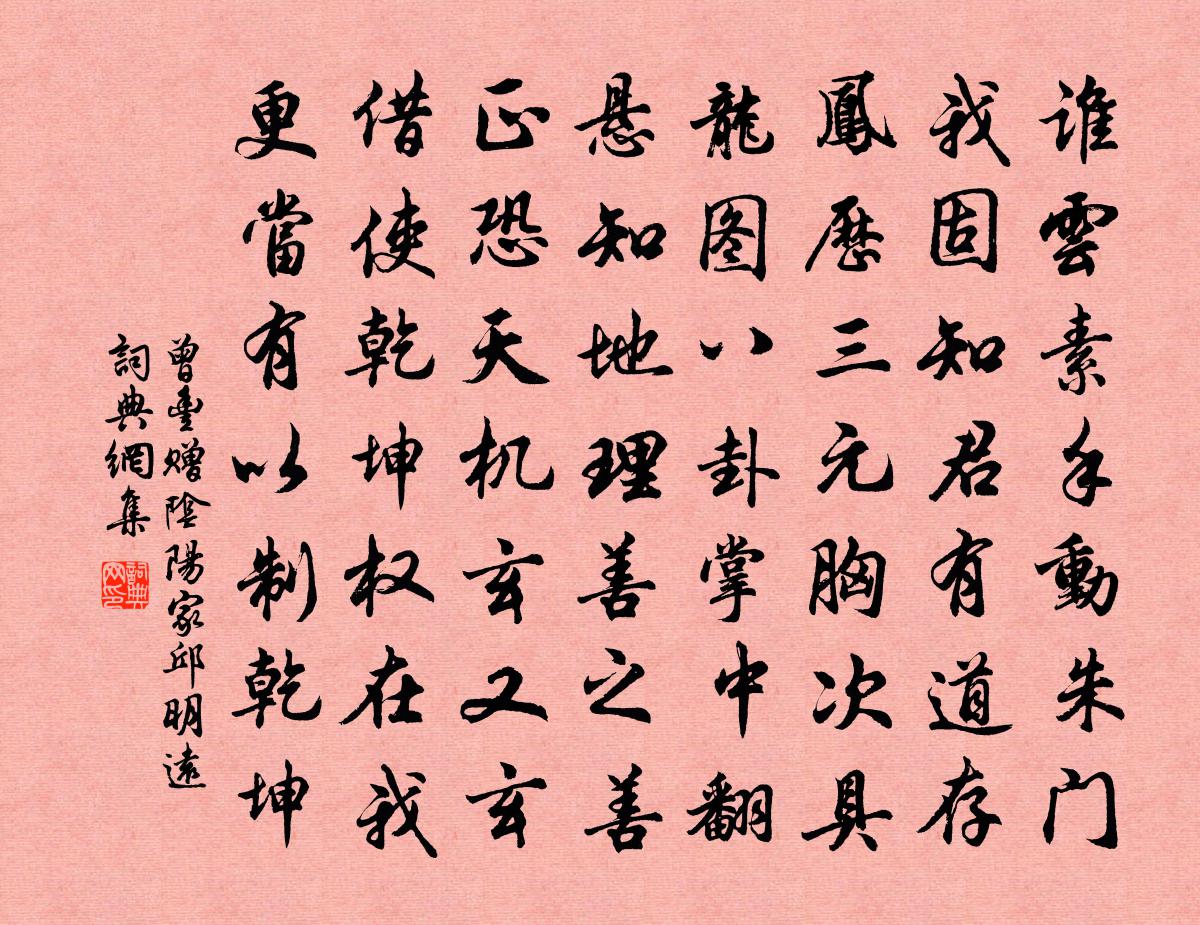 詩詞名句歷史字典書法欣賞書法字典國語詞典說文解字康熙字典古漢語字典標 題 作 者 詩 句 贈陰陽家邱明遠作者:曾豐 朝代:宋代贈陰陽家邱明遠原文誰雲素手動朱門,我固知君有道存。鳳歷三元胸次具,龍圖八卦掌中翻。懸知地理善之善,正恐天機玄又玄。借使乾坤權在我,更當有以制乾坤。詩詞問答問:贈陰陽家邱明遠的作者是誰?答:曾豐問:贈陰陽家邱明遠寫於哪個朝代?答:宋代曾豐贈陰陽家邱明遠書法欣賞贈陰陽家邱明遠書法作品詩詞推薦圩田二首楊萬里〔宋代〕古來圩岸護堤防,岸岸行行種綠楊。歲久樹根無寸土,綠楊走入水中央。滿江紅(次韻徐使君癸亥燈夕)劉克莊〔宋代〕笳鼓春城,處處有、豐年語笑。渾忘卻、金蓮前導,青藜下照。白雪唱來遍寡和,朱顏老去難重少。羨遨頭、四十次韻王簽判二首陳造〔宋代〕五鬼侵陵兩鬢蒼,振窮掃白分無妨。酒徒叢里投名懶,詩社中間趁課忙。塵暗鳳笙空自嘆,風驚雁字不能行。向君和陸成父司戶過淮陰縣韻三首袁說友〔宋代〕誰雲追信屬酇侯,政為高皇意欲留。歲晚不疑雲夢計,那知在業已興劉。六月二十六日夜夢赴季長招飲陸游〔宋代〕少城駿馬逐春風,二十年間萬事空。清夢都忘雙鬢改,繡筵還喜一尊同。烏巾掩冉簪花重,羯鼓敲鏗列炬紅。安得嘉定府汪元量〔宋代〕郡樓著眼蜀天寬,分得巴江水一灣。大小峨眉相對立,梨花山接海棠山。水調歌頭周權〔元代〕亭小可容膝,真似寄鷯枝。客來休訝迫窄,老子只隨宜。鳧鶴短長莫問,鵬*逍遙自適,何暇論成虧。萬事一尊酒邊戍詩蕭衍〔南北朝〕秋月出中天。遠近無偏異。共照一光輝。各懷離別思。思山居一十首。憶村中老人春酒(有劉、楊二叟善釀)李德裕〔唐代〕二叟茅茨下,清晨飲濁醪。雨殘紅芍藥,風落紫櫻桃。巢燕銜泥疾,檐蟲掛網高。閒思春谷事,轉覺宦途勞。鏡齋相士求詩二首姚勉〔宋代〕鵠袍待對滿京華,剛許癯儒作探花。性淡不知花可探,班頭獨立紫宸衙。櫻桃石延年〔宋代〕蔗漿寒上器,羊酷冰中廚。細碎榴非匹,尋常荔可奴。還當生林下,筍食廢朝餔。泊松江(一作許渾詩,題作夜泊松江渡寄友人)杜牧〔唐代〕清露白雲明月天,與君齊棹木蘭船。南湖風雨一相失,夜泊橫塘心渺然。江北莊取米到作飯香甚有感陸游〔宋代〕我昔從戎清渭側,散關嵯峨下臨賊,鐵衣上馬蹴堅冰,有時三日不火食,山蕎畲粟雜沙磣,黑黍黃穈如土色,飛霜挽何見山二首羅公升〔宋代〕大父平生友,惟公意莫違。山嵇欣月托,張許竟同歸。光岳留英笑,陽秋見是非。終天臣子淚,今日重沾衣。女竹枝歌陳杰〔宋代〕南園一株雨前茶,阿婆手種黃玉芽。今年團欒且同摘,明年大姊阿誰家。前之十首次詩釋行海〔宋代〕十五遊方今五十,異鄉偏感故鄉春。吳檣語燕頻留客,楚谷蠻鶯苦喚人。柳癭冷懸芳信雨,花須暖污阿香塵。如今嚴光徐鈞〔宋代〕故人風誼可態忘,辭祿無嫌故態狂。仁義一言非小補,此身何必佐岩廊。秋晚張耒〔宋代〕日轉秋庭樹影斜,風來粉蝶勝悲笳。只應宋玉秋來夢,常在牆東阿子家。出定力院作王安石〔宋代〕江上悠悠不見人,十年塵垢夢中身。殷懃為解丁香結,放出枝間自在春。經孺子亭觀龍井趙蕃〔宋代〕寒泉百尺幾秋春,祠禱流傳信若神。何事古先殊昧此,為霖顧取築岩人。名句推薦無田似我猶欣舞,何況田間望歲心。曾幾《蘇秀道中》 鳥銜野田草,誤入枯桑里。李白《樹中草》 如是滅度無量無數無邊眾生。實無眾生得滅度者。鳩摩羅什譯《金剛經·大乘正宗》 芙蓉老秋霜,團扇羞網塵。李白《中山孺子妾歌》 樹木何蕭瑟,北風聲正悲。曹操《苦寒行》 傷心千里江南,怨曲重招,斷魂在否?吳文英《鶯啼序·春晚感懷》 若到江南趕上春,千萬和春住。王觀《卜運算元·送鮑浩然之浙東》 客路相逢難,為樂常不足。蘇軾《送頓起》 上不臣天子,下不事諸侯;慎靜而尚寬,強毅以與人,博學以知服;近文章砥厲廉隅;雖分國如錙銖,不臣不仕。戴聖《禮記·儒行》 海內風塵諸弟隔,天涯涕淚一身遙。杜甫《野望》