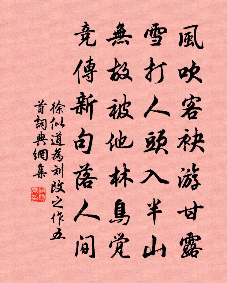詩詞名句歷史字典書法欣賞書法字典國語詞典說文解字康熙字典古漢語字典標 題 作 者 詩 句 為劉改之作五首作者:徐似道 朝代:宋代為劉改之作五首原文風吹客袂游甘露,雪打人頭入半山。無故被他林鳥覺,競傳新句落人間。詩詞問答問:為劉改之作五首的作者是誰?答:徐似道問:為劉改之作五首寫於哪個朝代?答:宋代徐似道為劉改之作五首書法欣賞為劉改之作五首書法作品詩詞推薦演雅方岳〔宋代〕蒼鷹守株待兔,白鷺臨淵羨魚。鳲鳩婦嘆於室,蝸牛亦愛吾廬。哭花韓偓〔唐代〕曾愁香結破顏遲,今見妖紅委地時。若是有情爭不哭,夜來風雨葬西施。桃園憶故人/桃源憶故人仇遠〔宋代〕薴蘿山下花藏路。只許流鶯來去。吹落梨花無數。香雪迷官渡。浣紗溪淺人何許。空對碧雲凝暮。歸去春愁如霧。觀建安七子詩胡宏〔宋代〕作文發妙理,經國厲遠圖。游目建安中,才子足歡娛。王劉與應阮,精神可交輸。西南落漢日,揚益奮兩隅。山河次韻奉答諸公汪大猷〔宋代〕衰年已過縱心期,安得聰明及往時。既老固應全晚節,雖貧豈暇計留資。元非矯飾求為異,自是行藏要合宜。曾記次韻吳宣義三徑懷友黃庭堅〔宋代〕佳眠未知曉,屋角聞晴哢。萬事頗忘懷,猶牽故人夢。采蘭秋蓬深,汲井短綆凍。起看冥飛鴻,乃見天宇空。甚念挽羅慶元劉克莊〔宋代〕昔與先君子,同時宰建溪。晚看康樂鳳,亦割武城雞。幼嗣萊妻立,新阡樂令遺。傷心埋玉早,□□遠難攜。雪李鹹用〔唐代〕上帝無私意甚微,欲教霖雨更光輝。也知出處花相似,可到貧家影便稀。雲漢風多銀浪濺,崑山火後玉灰飛。高樓春日鄭剛中〔宋代〕朝來弄日花頭密,暗裡窺春柳眼多。任是老人情意薄,個般時節奈愁何。陳方回〔宋代〕倏忽還如晉滅吳,六朝宮殿永榛蕪。千嬌玉座酣醽醁,一命青絲系轆轤。早使閣中無貴嬪,未應闕下有蠻奴。他時九日贈司空文明李端〔唐代〕我有惆悵詞,待君醉時說。長來逢九日,難與菊花別。摘卻正開花,暫言花未發。奔亡道中其三李白〔唐代〕談笑三軍卻。交遊七貴疏。仍留一隻箭。未射魯連書。會嚴陵邵德芳同舍邀宿玄同齊道舊有作林景熙〔宋代〕市槐夢忽醒,喬柯落風雨。何人斧為薪,遺根尚依土。緬懷赤煒初。郁若翠蛟舞。其下有橋門,雍雍冠帶聚。萬物酒泉子 春波煙雨(在嘉禾東春波門外)吳鎮〔元代〕一掌春波,矗矗*帆鬧如市,昔年煙雨最高樓。幾度暮雲收。三賢古蹟通歧路。*堵玲瓏插濠罟。荷花裊裊間菰蒲次韻賁長老史浩〔宋代〕露地當年說白牛,反令後學莫能由。足行香陌無窮轍,家在清江欲盡頭。罣礙頓除猶是病,因緣未了且乘流。此山薌岩山居孟夏二十絕舒岳祥〔宋代〕獨鳥怨遙夜,冷螢明遠陂。且弄碧蘿月,莫問出山期。清商怨·葭萌驛作陸游〔宋代〕江頭日暮痛飲。乍雪晴猶凜。山驛淒涼,燈昏人獨寢。 鴛機新寄斷錦。嘆往事、不堪重省。夢破南樓,綠雲堆一秋陰至近村陸游〔宋代〕村店閒尋酒,筇枝廋倚肩。雲齊龍捲雨,野曠鶴盤天。露井飄桐後,清觴泛菊前。欲歸還小立,搔首意悠然。探春慢姜夔〔宋代〕予自孩幼從先人宦於古沔,女須因嫁焉。中去復來幾二十年,豈惟姊弟之愛,沔之父老兒女子亦莫不予愛也。丙午臥龍山程師孟〔宋代〕聞說林泉便訪尋,平田一逕上孤岑。榕陰落處宜千客,荔子生時直萬金。盡放遲回官舍近,不妨閒坐石門深。四邊名句推薦君子之言寡而實,小人之言多而虛。劉向《說苑·談叢》 使能,國之利也。左丘明《左傳·文公·文公六年》 晝出耘田夜績麻,村莊兒女各當家。范成大《夏日田園雜興·其七》 喜怒不形於色。房玄齡《晉書·列傳·第十九章》 豆雨聲來,中間夾帶風聲。蔣捷《聲聲慢·秋聲》 翠貼蓮蓬小,金銷藕葉稀。李清照《南歌子·天上星河轉》 綠蓑江上秋聞笛,紅袖樓頭夜倚欄。曹雪芹《香菱詠月·其三》 搴帷拜母河梁去,白髮愁看淚眼枯。黃景仁《別老母》 絳雪生涼,碧霞籠夜,小立中庭蕪地。吳文英《拜星月慢·林鐘羽姜石帚以盆蓮數十置中庭宴客其中》 在善用,不在眾。宋祁、歐陽修、范鎮、呂夏卿等《新唐書·列傳·卷三十六》