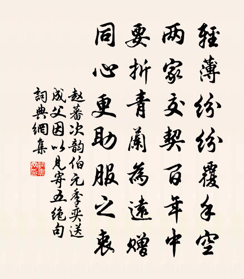 詩詞名句歷史字典書法欣賞書法字典國語詞典說文解字康熙字典古漢語字典標 題 作 者 詩 句 次韻伯元季奕送成父因以見寄五絕句作者:趙蕃 朝代:宋代原文輕薄紛紛覆手空,兩家交契百年中。要折青蘭為遠贈,同心更助服之衷。詩詞問答問:《次韻伯元季奕送成父因以見寄五絕句》的作者是誰?答:趙蕃問:該詩寫於哪個朝代?答:宋代書法欣賞次韻伯元季奕送成父因以見寄五絕句書法作品詩詞推薦十月桃張元乾〔宋代〕年華催晚,聽尊前偏唱,沖暖欺寒。樂府誰知,分付點化金丹。中原舊遊何在,頻入夢、老眼空潸。撩人冷蕊,渾八音歌二首答黃魯直晁補之〔宋代〕金丹妙通靈,子有遺世術。石髓不成餐,閔予多滯骨。絲聲紡事暮,搗聲寒事來。竹葉將菊花,及時同一杯。匏器寄懷二十首趙蕃〔宋代〕晏齋生理比何如,破硯今來亦已枯。珍重此君為耐久,澹然相對只清癯。偈頌七十八首釋正覺〔宋代〕衲僧只麽是家風,隱顯磨礱入混融。歸子返擲全歸火,羚羊掛角不同功。和山谷賦黃迪墨竹韻釋寶曇〔宋代〕平生黃太史,翰墨四海知。風流過修竹,自棄或若遺。豈伊歲寒質,似我槃礴時。此君不解語,風雨扶持之。夜窗句晏殊〔宋代〕山留盤瓠跡,洞有秦人書。擬九頌通德門程公許〔宋代〕馳余馬兮南北,慨永懷兮故國。豈喬木兮吾名,繄世臣兮取則。許史兮金張,煜煜兮煌煌。薰天兮富貴,達觀兮秕行至金牛驛寄興元渤海尚書李商隱〔唐代〕樓上春雲水底天,五雲章色破巴箋。諸生個個王恭柳,從事人人庾杲蓮。六曲屏風江雨急,九枝燈檠夜珠圓。深慚寄題王亞夫檢正不啻足齋楊萬里〔宋代〕既得宮隴,復望宮蜀,未求宮寶劍先求玉。秦相後車一千谷,唐相宮八百斛。黃金肘邛駕黃鵠,身前佞佛身後福。鄰僧以木龕養蜂一日墜地僧見密燎煙薰蜂蜂大王洋〔宋代〕採花供課能滿庾,不自營巢庇風雨。壘土削板非愛君,君自歸之若安堵。一聲衙集律令嚴,兩股挾持筋力苦。棟宇春日閒居薛能〔唐代〕權門多見薄,吾道豈終行。散地徒憂國,良時不在城。花繁春正王,茶美夢初驚。賴有茲文在,猶堪暢此生。紹興祀岳鎮海瀆四十三首佚名〔宋代〕水星之精,播液發靈。不發於河,既介以清。翼翼興薦,椒糈芬聲。載止載留,爰弛翠旌。將至徽川道中花李彌遜〔宋代〕平生愛山老山間,行山怕盡去復還。茲游深入眾山囿,一日看盡平生山。頗聞黃山最奇秀,紫翠六六堆孱顏。端如六月十六夜觀月翌早紀所見成長謠樓鑰〔宋代〕海雲涌立雙鐵出,明月正在山中間。初疑渼陂藍田出水面,又似長風吹度玉門關。須臾雲過月愈上,太虛點綴從飛哭王達善舒岳祥〔宋代〕一叟經年瘧,肅然強飯蔬。殘花清供後,瘦竹苦吟余。女授伏生業,兒工阿買書。曾無一紙別,疑信問何如。書事二首劉克莊〔宋代〕空空都沒一行書,行行徒矜九尺軀。面上帶妖真可恥,腳中有鬼不容扶。末年鐵拐傳仙訣,他日金錐抉冢珠。泉下欣欣亭李大異〔宋代〕門外青山收暮雨,林間歸路出行人。鷓鴣勸我早歸去,擬斫釣筒收紫筠。仙人石徐圓老〔宋代〕花開炫紅霞,景接長春壑。終古斯石存,蒼苔涴雙腳。安得洞仙來,重遊跨白鶴。廬江道中二首王阮〔宋代〕老大添身倦,飄零減性豪。路塵知旱苦,山瘦覺秋高。若有持衡分,慚無汗馬勞。九原如可作,公瑾笑吾曹。游山鄧肅〔宋代〕花柳年來不忍春,出郊聊複寫憂熏。天因御史欲飛雨,山為文公卻霽雲。寸舌不須論理亂,一犁安得遂耕耘。憑君名句推薦瘦影自臨春水照,卿須憐我我憐卿。馮小青《怨》 盡道豐年瑞,豐年事若何羅隱《雪》 人怕出名豬怕壯曹雪芹《紅樓夢·第八十三回》 軍井成而後飲,軍食熟而後飯,軍壘成而後舍,勞佚必以身同之。尉繚《尉繚子·戰威》 眾鳥高飛盡,孤雲獨去閒。李白《獨坐敬亭山》 長袖善舞,多錢善賈。韓非及後人《韓非子·五蠹》 激氣已能驅粉黛,舉杯便可吞吳越。史達祖《滿江紅·中秋夜潮》 胡人吹笛戍樓間,樓上蕭條海月閒。高適《和王七玉門關聽吹笛 / 塞上聞笛》 一者階於道,幾於神。姜子牙《六韜·文韜·兵道》 苦雨思白日,浮云何由卷。李白《玉真公主別館苦雨贈衛尉張卿二首》