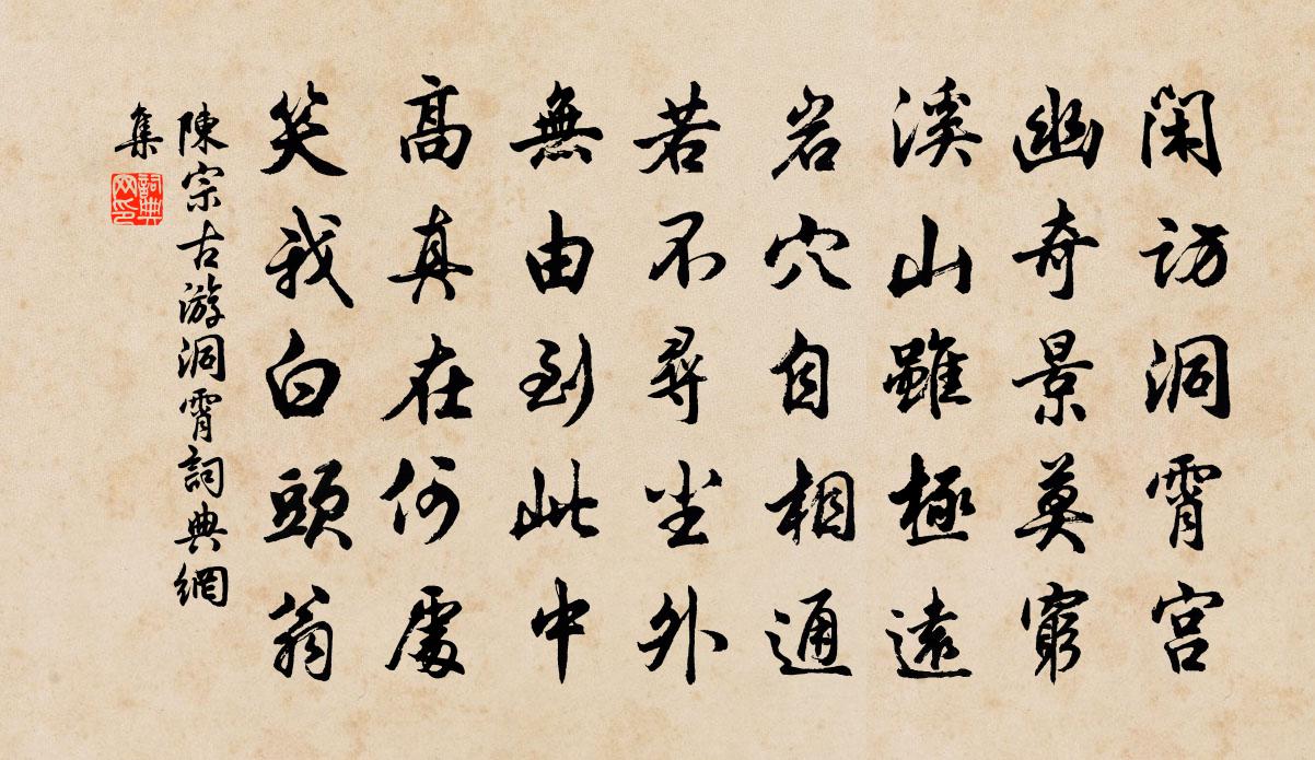 詩詞名句歷史字典書法欣賞書法字典國語詞典說文解字康熙字典古漢語字典標 題 作 者 詩 句 游洞霄作者:陳宗古 朝代:宋代游洞霄原文閒訪洞霄宮,幽奇景莫窮。溪山雖極遠,岩穴自相通。若不尋塵外,無由到此中。高真在何處,笑我白頭翁。詩詞問答問:游洞霄的作者是誰?答:陳宗古問:游洞霄寫於哪個朝代?答:宋代陳宗古游洞霄書法欣賞游洞霄書法作品詩詞推薦題尤使君郡圃十二詩君子堂李庚〔宋代〕文簡為州時,不求赫赫譽。溫恭君子儒,豈弟民父母。黃堂能幾年,清風靄千古。願公踵前修,特此相明主。偈頌五十一首釋道沖〔宋代〕釋迦出世拏空塞空,達磨西來將錯就錯。帶累後代兒孫,一例隨處卜度。休卜度,四海浪平,百川潮落。聽藍溪僧為元居士說維摩經孟郊〔唐代〕古樹少枝葉,真僧亦相依。山木自曲直,道人無是非。手持維摩偈,心向居士歸。空景忽開霽,雪花猶在衣。洗然東岑趙方〔宋代〕讀書茅屋白雲岑,日月如流老欲侵。岑傍松杉栽萬樹,於茲十載已成林。開元寺佛缽詩皮日休〔唐代〕帝青石作綠冰姿,曾得金人手自持。拘律樹邊齋散後,提羅花下洗來時。乳麋味斷中天覺,麥麨香消大劫知。從此更漏子盧祖皋〔宋代〕玉鉤裁,羅襪淺。心事漫拈針線。釵半,鬢慵梳。新來消瘦無。江南路。花無數。春夢不知何處。簾影轉,瞑禽瑞鶴仙·贈官妓周韻鄭聞〔宋代〕醉歸來,不悟人間天上,雲雨難尋舊跡。但餘香、暗著羅衾,怎生忘得。江樓二首韓偓〔唐代〕夢啼嗚咽覺無語,杳杳微微望煙浦。樓空客散燕交飛,江靜帆飛日亭午。魚是魚苦筍香味新,楊柳酒旗三月春。風奉和幸長安故城未央宮應制宋之問〔唐代〕漢王未息戰,蕭相乃營宮。壯麗一朝盡,威靈千載空。皇明悵前跡,置酒宴群公。寒輕彩仗外,春發幔城中。樂思冬日雜興趙蕃〔宋代〕憒憒若有失,岑岑殊未佳。枯藜茅屋靜,高枕竹窗斜。冬日誰雲短,吾生幸有涯。薰爐微結篆,茗盌細浮花。句錢易〔宋代〕綠章封事緘初啟,青鳳求凰尾乍開。頌古三十八首釋從瑾〔宋代〕棚前夜半弄傀儡,行動威儀去就全。子細思量無道理,裡頭畢竟有人牽。次韻如晦木犀因寄其從父性之老同舍戴表元〔宋代〕詩力如弓不易張,煩襟且覺對花涼。玲瓏南雪晴秋樹,淅窣西風夜月香。消得玉人歌古談,許誰金屋斗清狂。風流即事陸游〔宋代〕禿尾驢嘶小市門,側蓬帆過古城村。此生感慨知何限?斗酒新豐不足論。憶幼子(字驥子,時隔絕在鄜州)杜甫〔唐代〕驥子春猶隔,鶯歌暖正繁。別離驚節換,聰慧與誰論。澗水空山道,柴門老樹村。憶渠愁只睡,炙背俯晴軒。四怨三愁五情詩十二首。四情曹鄴〔唐代〕檳榔自無柯,椰葉自無陰。常羨庭邊竹,生筍高於林。句佚名〔唐代〕吟中雙鬢白,笑里一生貧。(見《詩史》)行香子 原誤作南香子 此下原有虞美人重陽飲佚名〔宋代〕一個蒼蠅,飛入腥盆。顧甜時、直入中心去,忘了抬身。沾其足,沾其翅,喪其形。我好嗟吁,怎不動心。甜中有人貴有精神吟邵雍〔宋代〕人貴有精神,精神多不醇。有精神而醇,為第一等人。不醇無義理,是非隨怒喜。怒以是為非,喜以非為是。怒是和天寧因上人次韻王之道〔宋代〕日月漂流一鳥過,別來心跡病維摩。是非孰辨聊分謗,誕信相譏要止訛。搖落獨憐松不改,澄清嘗見海無波。句中名句推薦陰晴圓缺都休說,且喜人間好時節。徐有貞《中秋月·中秋月》 盧家少婦鬱金堂,海燕雙棲玳瑁梁。沈佺期《古意呈補闕喬知之 / 古意 / 獨不見》 箴者,針也,所以攻疾防患,喻針石也。劉勰《文心雕龍·銘箴》 白雁亂飛秋似雪,清露生涼夜。吳西逸《清江引·秋居》 喃喃教言語,一一刷毛衣。白居易《燕詩示劉叟》 苦恨年年壓金線,為他人作嫁衣裳。秦韜玉《貧女》 我見君來,頓覺吾廬,溪山美哉。辛棄疾《沁園春·和吳尉子似》 樹頭幽鳥,對調新語,語罷雙飛卻。顧德輝《青玉案·春寒惻惻春陰薄》 昔我往矣,楊柳依依。佚名《採薇》 好夢欲成還又覺,綠窗但覺鶯啼曉。施耐庵《蝶戀花·一別家山音信杳》