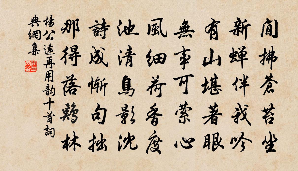 詩詞名句歷史字典書法欣賞書法字典國語詞典說文解字康熙字典古漢語字典標 題 作 者 詩 句 再用韻十首作者:楊公遠 朝代:宋代再用韻十首原文閒拂蒼苔坐,新蟬伴我吟。有山堪著眼,無事可縈心。風細荷香度,池清鳥影沈。詩成慚句拙,那得落雞林。詩詞問答問:再用韻十首的作者是誰?答:楊公遠問:再用韻十首寫於哪個朝代?答:宋代楊公遠再用韻十首書法欣賞再用韻十首書法作品詩詞推薦西江月朱敦儒〔宋代〕澹澹薰風庭院,青青過雨園林。銅駝陌上舊鶯聲。今日江邊重聽。落帽酒中有趣,題橋琴里無心。香殘瀋水縷煙輕老嘆一首劉克莊〔宋代〕少豪扛鼎復搴旗,倏忽才情已竭衰。今無百斤金買賦,古有九千縑作碑。毛錐盡禿難藏老,麈尾高懸合授誰。他日句杜甫〔唐代〕君看牆頭桃樹花,儘是行人眼中血。 日華書自通州來言其同僚多唱酬袁說友〔宋代〕題輿贏得錦囊歸,酬唱西崑事可追。久不陪君三日文,政須咽子百篇詩。寧甘咄咄痴兒事,稍愧紛紛俗吏為。我亦心竟恁地歌白玉蟾〔宋代〕我生不信有神仙,亦不知有大羅天。那堪見人說蓬萊,掩面卻笑渠風顛。七返還丹多不實,往往將謂人虛傳。世傳句袁樞〔宋代〕溫黃前後並,殿下不須行。對月趙蕃〔宋代〕風清勝夏暑,月薄借秋光。坐覺還神觀,心期隔帝鄉。滿階蛩送感,何許笛飛涼。盤礴俄成久,軒然睡倚牆。八聲甘州呂勝己〔宋代〕自秋來、多病意無聊,不作渭山游。想蘭菊凋疏,松筠茂密,亭館清幽。四望遙山萬疊,疊疊翠光浮。人道蓬萊島台州郡齋雜詠十二首參雲亭尤袤〔宋代〕昔賢已跨鶴,故跡餘參雲。舊德慨雲遠,乾霄氣仍存。青山宿霧卷,喬木蒼煙昏。尚想來游處,笙簫中夜聞。寓嘆陸游〔宋代〕有位方憂失,無家豈念歸。賢愚竟誰得?今昨兩皆非。世事無長算,人情忽駭機。細思如意處,惟有釣魚磯。喜雪投王守趙蕃〔宋代〕千騎朝禮仙佛祠,玉花夜散答誠思。守惟民慮知何德,天不人違固可知。擬效聯詩家契闊,念將乘興體清羸。歌呼病癒小健戲作陸游〔宋代〕入市歸村不跨驢,蠅頭細字夜鈔書。身安自勝閒官職,不是虛名暗折除。送憲使江寺簿赴召程公許〔宋代〕沃野三千里,春風十六城。顧憂寧易釋,遣送定非輕。憶昔光華賦,隨軒老稚迎。根株探吏蠹,疴癢察人情。漢納春日湖上高翥〔宋代〕乘興行新路,凝情獨老翁。馬蹄春草上,人影夕陽中。飛絮沿湖白,殘花染浪紅。晚歸雲氣合,雙槳破空濛。望東湖五首袁燮〔宋代〕世上功名姑置之,微茫心事要深思。水光月色精神好,長使襟懷似此時。蠶婦辭陳普〔宋代〕東鄰採桑婦,西鄰養蠶女,年年役役為蠶苦。桐花如雪麥如雲,鳴鳩醉椹 * 雨。踏踏登竹梯,山煙鎖春樹。不管感雁來紅釋永頤〔宋代〕落落雲中雁,亭亭階下草。草心將變紅,雁聲來已早。霜風日夜催,對此忘吾老。玲瓏葉數層,次第顏色好。燕脂與宗上人同飲陳藻〔宋代〕同年同月又同時,邂逅僧房把酒卮。五十年來未相識,鄰州兩舍賀生兒。題酒戶修孔廟狀馮道幕客〔唐代〕槐影參差覆杏壇,儒門子弟盡高官。卻教酒戶重修廟,覓我慚惶也不難。雜詠一百首靈照劉克莊〔宋代〕首如飛蓬亂,家賣漉籬供。老漢驚吾女,禪機捷乃翁。名句推薦離別一何久,七度過中秋。蘇轍《水調歌頭·徐州中秋》 曾伴浮雲歸晚翠,猶陪落日泛秋聲。高蟾《金陵晚望》 致治之本,惟在於審。量才授職,務省官員。吳兢《貞觀政要·卷三·論擇官》 山抹微雲,天連衰草,畫角聲斷譙門。秦觀《滿庭芳·山抹微雲》 釀泉為酒,泉香而酒洌;歐陽修《醉翁亭記》 如今但暮雨,蜂愁蝶恨,小窗閒對芭蕉展。呂渭老《薄倖·青樓春晚》 滿川風雨獨憑欄,綰結湘娥十二鬟。黃庭堅《雨中登岳陽樓望君山》 人攀明月不可得,月行卻與人相隨。李白《把酒問月·故人賈淳令予問之》 內官初賜清明火,上相閒分白打錢。韋莊《長安清明》 比不應事,未可謂喻;文不稱實,未可謂是也。王充《論衡·卷三·物勢篇》