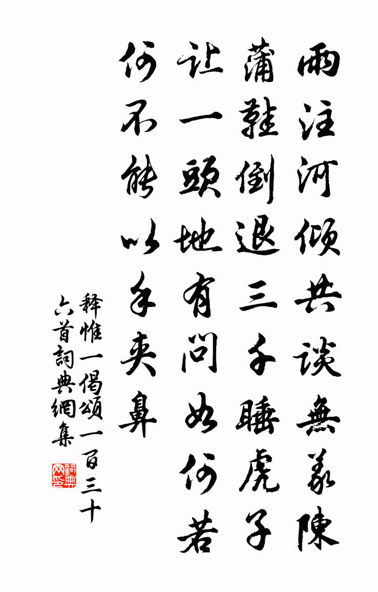 詩詞名句歷史字典書法欣賞書法字典國語詞典說文解字康熙字典古漢語字典標 題 作 者 詩 句 偈頌一百三十六首作者:釋惟一 朝代:宋代偈頌一百三十六首原文雨注河傾,共談無義。陳蒲鞋倒退三千,睡虎子讓一頭地。有問如何若何,不能以手夾鼻。詩詞問答問:偈頌一百三十六首的作者是誰?答:釋惟一問:偈頌一百三十六首寫於哪個朝代?答:宋代釋惟一偈頌一百三十六首書法欣賞偈頌一百三十六首書法作品詩詞推薦戊子元日凡陽道中二首方回〔宋代〕軋軋箯輿獵曉霜,孤征無復共椒觴。浮生物物身為累,垂老年年節是常。稍聽村田喧鼓笛,遙憐兒女欠衣裳。於潛句諶祜〔宋代〕月明老樹吟風鶴,露濕荒郊遍士梟。山中吟陳允平〔宋代〕平生獨愛山,日日頻躋攀。自得山中趣,結廬萬山間。懷古某庭倚〔宋代〕宦海漂浮若轉蓬,唯餘訪古意無窮。曾觀老柏懷諸葛,今對古柟思鄭公。遺憾已隨流水遠,英名仍伴故山雄。後來箕卜陸游〔宋代〕孟春百草靈,古俗迎紫姑。廚中取竹箕,冒以婦裙襦,豎子夾扶持,插筆祝其書,俄若有物憑,對答不須臾。豈必趙殿丞知河南縣楊億〔宋代〕鼎邑閭閻有古風,清談為治自從容。官聊殿省通朝籍,路過津橋入縣封。柳蔭天衢時按轡,雲生少室好搘筇。龍門長相思陸游〔宋代〕悟浮生。厭浮名。回視千鍾一發輕。從今心太平。愛松聲。愛泉聲。寫向孤桐誰解聽。空江秋月明。贈汲郡太守詩陸雲〔魏晉〕我有好爵。既成爾服。入贊崇華。遂登帷幄。時文聖宰。天祚方谷。朔風徽止。鴻漸雲岳。題洛陽村寺張度〔宋代〕金谷花時醉一場,舊遊無日不思量。誰知萬水千山里,枉被人傳過洛陽。清平樂韋莊〔唐代〕綠楊春雨,金線飄千縷。花拆香枝黃鸝語,玉勒雕鞍何處。碧窗望斷燕鴻,翠簾睡眼溟濛。寶瑟誰家彈罷,含悲斜武康軍僉判師君輓詩魏了翁〔宋代〕換卻野人服,衣之從事衫。人忻犧被鄉,我笑馬羈銜。客靜閒尊禁,身強閣杖函。典刑那復見,宰樹閟窰岩。息壤蘇轍〔宋代〕江上寒沙薄如席,一夕墳起成高丘。江流傾轉力不勝,左齧右吐非自由。南郡城南獨何者,平地生長殊不休。當中雪夜懷趙存我碧瀾潛心三昆仲顧逢〔宋代〕坐久冰生硯,無聊捻白髭。友朋上心處,風雪打頭時。夜永孤燈共,天寒一雁知。兒童來膝下,撥火覓蹲鴟。加階薛能〔唐代〕二年中散似稽康,此日無功換寵光。唯有一般酬聖主,勝於東晉是文章。偈頌二十九首釋雲〔宋代〕是非只為多開口,煩惱皆因強出頭。致使韶陽要打殺,思量著甚底來由。朝雞王樂道司馬光〔宋代〕小雞距短雙翅垂,廣場勇門無所施。清曉長鳴獨先眾,朝者恃此能知時。星河滿天月光白,東望扶桑悄無色。一聲訪胡邦衡庭前四菊茂其因賦二絕周必大〔宋代〕大杓親分兩玉瓶,東籬手植萬金英。荒園有酒愁無菊,擬乞繁華助眼明。范陽王輓詞二首宋之問〔唐代〕賢相稱邦傑,清流舉代推。公才掩諸夏,文體變當時。賓吊翻成鶴,人亡惜喻龜。洛陽今紙貴,猶寫太沖詞。贈秩挽芸居二首周端臣〔宋代〕天地英靈在,江湖名姓香。良田書滿屋,樂事酒盈觴。字畫堪追晉,詩刊欲遍唐。音容今已矣,老我倍淒涼。送兄弟還都至長葛河上四首晚步韓維〔宋代〕愛此霽景侍,舍舟步高岸。夕陽照渡口,急急水紋亂。霜鴉田間鳴,沙鳥波上散。登臨豈非美,當軫別後嘆。名句推薦多言數窮,不如守中。老子《老子·道經·第五章》 修身以敬,勿托以尊。房玄齡《晉書·列傳·第八章》 南陵水面漫悠悠,風緊雲輕欲變秋。杜牧《南陵道中 / 寄遠》 江碧鳥逾白,山青花欲燃。杜甫《絕句二首》 旌蔽日兮敵若雲,矢交墜兮士爭先。屈原《國殤》 棠梨花映白楊樹,儘是死生別離處。白居易《寒食野望吟》 聞道春還未相識,走傍寒梅訪訊息。李白《早春寄王漢陽》 知者不言,言者不知。老子《老子·德經·第五十六章》 萬里乘雲去復來,隻身東海挾春雷。秋瑾《黃海舟中日人索句並見日俄戰爭地圖》 盤心清露如鉛水,又一夜、西風吹折。張炎《疏影·詠荷葉》