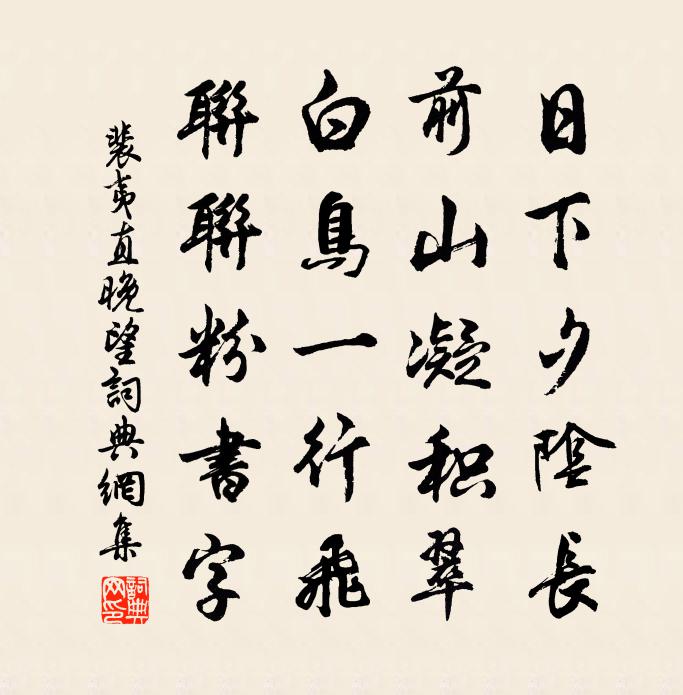 詩詞名句歷史字典書法欣賞書法字典國語詞典說文解字康熙字典古漢語字典標 題 作 者 詩 句 晚望作者:裴夷直 朝代:唐代晚望原文日下夕陰長,前山凝積翠。白鳥一行飛,聯聯粉書字。詩詞問答問:晚望的作者是誰?答:裴夷直問:晚望寫於哪個朝代?答:唐代問:晚望是什麼體裁?答:五古裴夷直晚望書法欣賞晚望書法作品注釋全唐詩:卷513-16詩詞推薦昭君詞戴叔倫〔唐代〕漢宮若遠近,路在寒沙上。到死不得歸,何人共南望。淮山宋祁〔宋代〕不見當年叢桂枝,空山嶮崒但霞霏。眼看春草萋萋遍,身是王孫未得歸。江夏別魯直送之宜州潘大臨〔宋代〕翰墨精神全魏漢,文章波瀾似春秋。可是中州著不得,江南已遠更宜州。次韻黃岩高志尹寄壽陳著〔宋代〕冠屨天地間,車笠風雲從。我行半東南,已復八十翁。取友必端人,求我我蒙童。初見老不化,宿學今何功。萬丈和劉明仲都曹見別三首蘇頌〔宋代〕幽居鄰有萬窠松,坐見京江四面峰。形若橛株隨倚徙,愁如頑礦漸銷鎔。尚紆軒冕心顏厚,但覺林泉興味濃。茗飲憶在匡廬日齊己〔唐代〕憶在匡廬日,秋風八月時。松聲虎溪寺,塔影雁門師。步碧葳蕤徑,吟香菡萏池。何當舊泉石,歸去洗心脾。南雄城樓齊唐〔宋代〕漢初開郡出南夷,萬壑千岩足嶮巇。天上鬥牛應共域,人間江嶺自分岐。尉佗椎髻遺風俗,馬援飛鳶墮水時。花時留郡歸已初夏事六首黎廷瑞〔宋代〕山中幽興盡無窮,不管蕭蕭四壁空。漸覺愚巾便暑戴,偶逢賢酒亦時中。映階草色帶朝雨,隔屋筍香吹晚風。搔首次韻和王敏仲望祝融峰四首孔武仲〔宋代〕斗柄崢嶸宜有概,星榆爛漫豈無根。祝融直上應窺見,閶闔雖重亦可捫。中秋月直禁苑鄭畋〔唐代〕禁署方懷忝,綸闈已再加。暫來西掖路,還整上清槎。恍惚歸丹地,深嚴宿絳霞。幽襟聊自適,閒弄紫薇花。上官昭容書樓歌呂溫〔唐代〕漢家婕妤唐昭容,工詩能賦千載同。自言才藝是天真,不服丈夫勝婦人。歌闌舞罷閒無事,縱恣優遊弄文字。玉樓頌古一百則釋正覺〔宋代〕俱胝老子指頭禪,三十年來用不殘。信有道人方外術,了無俗物眼前看。所得甚簡,施設彌寬,大千剎海飲毛端。送楊子有赴敘倅和高榮州韻魏了翁〔宋代〕俗事縈人阻四並,東郊又送屏星行。欲安邊圉元無策,善服人心只有清。使馬如羊非我愛,帶牛佩犢豈其情。非惟同伯潛諸公聯騎出城東南亞次衫字韻廖行之〔宋代〕怯曉征衣襲小衫,山頭淡月照聯驂。晴光忽散湘江上,秋色疑連夢澤南。後約吹香舒藻思,同游載酒款犀談。遙知王君便衣挽章其子遷其母同穴姜特立〔宋代〕伉儷存亡隔,孤墳一驛西。忽驚雙劍合,無復只鸞棲。路接先塋近,雲藏塔岫低。歸乎了無憾,送騎滿山蹊。新開小室陸游〔宋代〕並檐開小室,僅可容一幾。東為讀書窗,初日滿窗紙。衰眸頓清澈,不畏字如螘。琅然弦誦聲,和答有稚子。餘年池萍郭印〔宋代〕楊花撩亂幾時休,看取明朝水上浮。凝綠滿地渾不動,微波忽綻見魚游。借薛尚書集鄭谷〔唐代〕江天冬暖似花時,上國音塵杳未知。正被蟲聲喧老耳,今君又借薛能詩。齊天樂(西湖十詠·南屏晚鐘)陳允平〔宋代〕赤闌橋畔斜陽外,臨江暮山凝紫。戲鼓才停,漁榔乍歇,一片芙蓉秋水。餘霞散綺。正銀鑰停關,畫船催艤。魚板偈頌一百四十一首釋師範〔宋代〕聲前一句,不封不樹。坐斷舌頭,如何通吐。昨日有人從天台來,卻往徑山去。名句推薦一念開明,反身而誠王陽明《傳習錄·卷中·答陸原靜書》 浮雲暮南征,可望不可攀。杜甫《前出塞九首》 故園書動經年絕,華發春唯滿鏡生。崔塗《春夕》 天地無全功,聖人無全能,萬物無全用。列子及其弟子《列子·天瑞》 命室攜童弱,良日登遠遊陶淵明《酬劉柴桑》 明朝甑復空,母子相持哭。陸游《十月二十八日風雨大作》 春風不相識,何事入羅幃。李白《春思》 種竹淇園遠致君,生平孤節負辛勤。王汝舟《詠歸堂隱鱗洞》 餘霞散成綺,澄江靜如練。謝朓《晚登三山還望京邑》 舉頭西北浮雲,倚天萬里須長劍。辛棄疾《水龍吟·過南劍雙溪樓》
