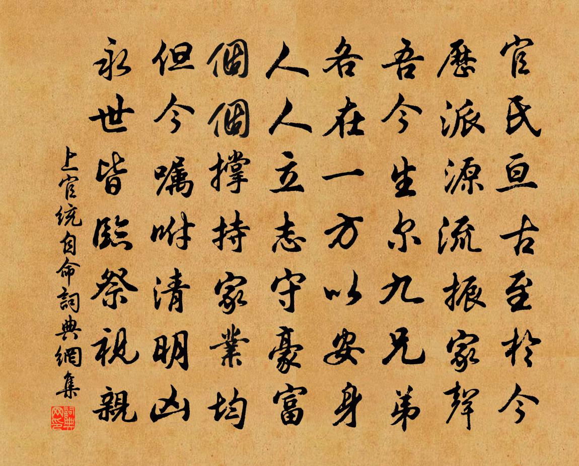 詩詞名句歷史字典書法欣賞書法字典國語詞典說文解字康熙字典古漢語字典標 題 作 者 詩 句 自命作者:上官統 朝代:宋代自命原文官氏亘古至於今,歷派源流振家聲。吾今生爾九兄弟,各在一方以安身。人人立志守豪富,個個撐持家業均。但今囑咐清明凶,永世皆臨祭視親。詩詞問答問:自命的作者是誰?答:上官統問:自命寫於哪個朝代?答:宋代上官統自命書法欣賞自命書法作品詩詞推薦論蜘蛛形賈似道〔宋代〕身材侷促似蜘蛛,且喜牙長六足鋪。羽翼不長肩蓋盡,等閒覓得夜明珠。寄獻揚州宋祁〔宋代〕平昔懷親友,銷魂重遠辭。於今急難地,那復別離時。脫木乾坤晚,窮途日月衰。憂餘曾得恤,涅罷返無緇。楚分立春後一日作范成大〔宋代〕浮生萬法本悠哉,大笑羲娥轉轂催。官事已邀痴作伴,春風應共老俱來。雲容雪意將詩問,柳眼花心待酒媒。九十相和歌辭。苦寒行劉駕〔唐代〕嚴寒動八荒,藾藾無休時。陽烏不自暖,雪壓扶桑枝。歲暮寒益壯,青春安得歸。朔雁到南海,越禽何處飛。誰言秋懷張嵲〔宋代〕忽忽經年事,悠悠滯客心。晚花生廢圃,老樹立秋陰。豈有清樽醉,寧辭白髮侵。樓高見膏發,老大怯登臨。贈越客馬戴〔唐代〕故國波濤隔,明時已久留。獻書雙闕晚,看月五陵秋。南棹何時返,長江憶共游。遙知釣船畔,相望在汀洲。懷張似之仇遠〔宋代〕少日登山屐,中年上水船。黃花猶自綠,白髮若為玄。但覺杯行速,那知帽影偏。南峰深秀處,回首重潸然。闌乾萬里心(寓憶王孫)張輯〔宋代〕小樓柳色未春深。湘月牽情入苦吟。翠袖風前冷不禁。怕登臨。幾曲闌乾萬里心。二蘇文登趨闕二帖贊岳珂〔宋代〕文字之祥,劂有原委。父師昆弟,以及諸子。文兮斜川,道兮潁水。以文貫道,一家濟美。施及翰林,特遊戲耳。次周益公韻樓鑰〔宋代〕天將間氣孕山川,名世還當五百年。已是有官居鼎鼐,不妨平地作神仙。書林尚欲校三豕,筆力猶能驅兩肩。前日夢徐徑坂趙汝騰〔宋代〕誰雲姑蔑遠無諸,夢繞可仟抱膝廬。我得閒中繙魯語,公應靜里玩羲圖。雷猶地伏陽新復,雲向天升雨可需。好倡題汪水雲詩卷祝從龍〔宋代〕竹杖芒鞋短後衣,抱琴何處覓鍾期。百年爛醉烏程酒,千首新吟晉宋詩。京洛風塵如昨日,湖山水月此何時。近來清平樂·春歸何處黃庭堅〔宋代〕春歸何處。寂寞無行路。若有人知春去處。喚取歸來同住。春無蹤跡誰知。除非問取黃鸝。百囀無人能解,因風飛湘江曲徐照〔宋代〕湘江無潮水,日夜一向流。別心無彼此,兩處各悠悠。夜雨杜甫〔唐代〕小雨夜復密,迴風吹早秋。野涼侵閉戶,江滿帶維舟。通籍恨多病,為郎忝薄游。天寒出巫峽,醉別仲宣樓。吳姬曲五首戴表元〔宋代〕吳姬來,吳船蕩漾湖花開。隔堤迎笑欲飛舉,不用少年多漿催。問君青春得幾許,看取架上紅玫瑰。涼州令(東堂石榴)歐陽修〔宋代〕翠樹芳條颭。的的裙腰初染。佳人攜手弄芳菲,綠陰紅影,共展雙紋簟。插花照影窺鸞鑑。只恐芳容減。不堪零落西江貽釣叟騫生(一作西江寄友人騫生)溫庭筠〔唐代〕晴江如鏡月如鉤,泛灩蒼茫送客愁。衣淚潛生竹枝曲,春潮遙上木蘭舟。事隨雲去身難到,夢逐煙銷水自流。昨日重同暢當奘公院聞琴盧綸〔唐代〕誤以音聲祈遠公,請將徽軫付秋風。漾漾硤流吹不盡,月華如在白波中。古人談讀書佚名〔〕論語敏而好學,不恥下問。知之為知之,不知為不知,是知也。默而識之,學而不厭,誨人不倦。朱熹余嘗謂:讀名句推薦不用訴離觴,痛飲從來別有腸。蘇軾《南鄉子·和楊元素時移守密州》 迢迢新秋夕,亭亭月將圓。陶淵明《戊申歲六月中遇火》 雲白山青萬餘里,愁看直北是長安杜甫《小寒食舟中作》 辭君向天姥,拂石臥秋霜。李白《別儲邕之剡中》 孤帆遠影碧空盡,唯見長江天際流。李白《黃鶴樓送孟浩然之廣陵》 所志在功名,離別何足嘆。陸龜蒙《別離》 驪宮高處入青雲,仙樂風飄處處聞。白居易《長恨歌》 同來望月人何處?風景依稀似去年。趙嘏《江樓舊感 / 江樓感舊》 斜髻嬌娥夜臥遲,梨花風靜鳥栖枝。唐寅《美人對月》 若言言悅耳,事事快心,便把此生埋在鴆毒中矣。洪應明《菜根譚·概論》