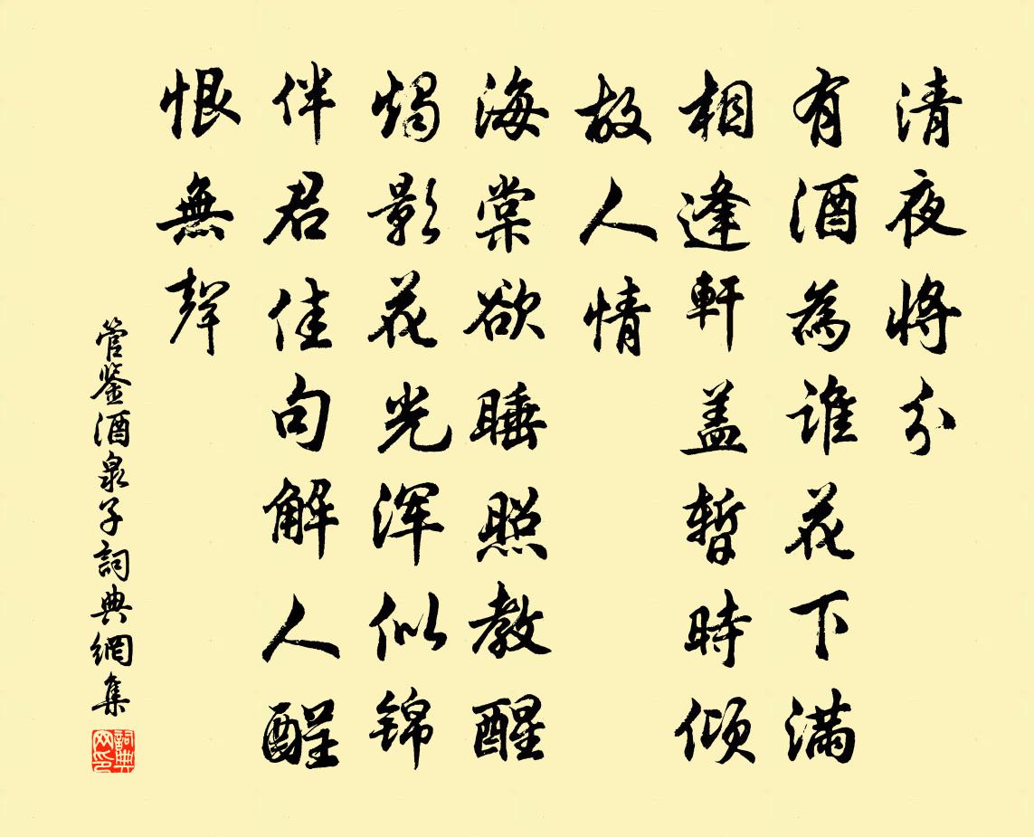 詩詞名句歷史字典書法欣賞書法字典國語詞典說文解字康熙字典古漢語字典標 題 作 者 詩 句 酒泉子作者:管鑒 朝代:宋代酒泉子原文清夜將分。有酒為誰花下滿,相逢軒蓋暫時傾。故人情。海棠欲睡照教醒。燭影花光渾似錦,伴君佳句解人酲。恨無聲。詩詞問答問:酒泉子的作者是誰?答:管鑒問:酒泉子寫於哪個朝代?答:宋代問:酒泉子是什麼體裁?答:詞管鑒酒泉子書法欣賞酒泉子書法作品詩詞推薦寓居·其二葉紹翁〔宋代〕無酒難留客,借書方入城。洗衣知水落,貪睡畏窗明。野竹藤纏殺,枯枝草寄生。十年林下隱,差覺世緣輕。舟次安州孝感縣偶感寒疾臥病舟中復大風不可張耒〔宋代〕船頭風聲鳴萬鼓,扁舟系覽沙邊樹。船中病客晝閉篷,睡起空江日亭午。雞犬蕭條數家縣,市聲已變淮南語。長年送衛清叔著作提舉淮東樓鑰〔宋代〕羨君持節拜庭闈,未老雙親看彩衣。若過蓋公煩問信,坐曹日念舊遊稀。和祖龍圖見寄邵雍〔宋代〕吾家職分是雲山,不見雲山不解顏。遊興亦難拘日阻,夢魂都不到人間。煙嵐欲極無涯樂,軒冕何嘗有暫閒。洛社惜分飛(桂花)沈端節〔宋代〕喜人眉心黃點瑩。珠佩玲瓏透影。風露蕭蕭冷。夢回月窟香成陣。秋後情懷君莫問。拚了因他瘦損。不似尋常韻。懷關聖功吳則禮〔宋代〕破除午夢晴鳥呼,起喚奴人轉轆轤。半世奇奇兼怪怪,一春白白與朱朱。生憎張儀舌尚在,大笑香岩錐也無。矻矻頌證道歌證道歌釋印肅〔宋代〕如來藏裹親收得,隨時影現青黃白。珠體元無一色同,無端也被溈山索。題林仲雨皦日庵陳藻〔宋代〕詩仙庵未作,也我話庵名。素髮來為客,朱甍始落成。變風情性語,皦日死生盟。君老身猶健,雌埋一劍橫。林鴉宋祁〔宋代〕林鴉泊泊飛,剩欲送斜規。城頭 * 子,月中三幣枝。嚮晨常自警,鄰暝不應移。王孫無巧彈,此夜正羈雌。為魏塘王居士留三日二首方回〔宋代〕水鄉熟處未全飢,舟楫安行盜亦稀。乘興聊為三日客,魏塘酒賤蟹螯肥。予往來秦熙汧隴間不啻十數年時聞下里之歌遠李復〔宋代〕鳴鳳山西五里坂,未渡汧河山漸淺。東來行人漸長嘆,已覺秦川不在眼。游棲霞宮張奕〔宋代〕尊師乃高道,有意出塵寰。佩劍文垂斗,橫琴意在山。靈龜調浩氣,醇酒發朱顏。最得時賢許,詩牌滿棟間。三昧諸頌釋印肅〔宋代〕百納內董袋,一切皆我入。一切莫能入,達此妙縱橫,三世佛佛佛。句潘檉〔宋代〕一樹黃葵金盞側,勸人相對醉西風。寄智門石心和尚釋雲岫〔宋代〕我栽苦瓠連根苦,君種甜瓜苦更多。自是海邊風土別,不因種子得來訛。晚步東郊范成大〔宋代〕水墨依林寺,青黃負郭田。斜陽猶滿地,片月早中天。策策鴉飛急,冥冥樹影圓。西山元自好,那更著雲煙。病後感興寄車玉峰先生二首李景文〔宋代〕折梅寄故人,故人青雲間。青雲杳無路,夢裡相往還。我愛梅花娟,彼惜桃李顏。相逢不相契,何事勞追攀。守此杭山八景章鑒〔宋代〕一邦佳景萃峰頭,宇宙鍾靈自有由。銀竹霏霏山氣盛,火輪顆顆水光浮。年逢旱澇他方苦,世際豐穰此處優。瞻望偈傾一百三十三首釋法薰〔宋代〕尋常顛說倒說,何曾開口動舌。不妨雪上加霜,更與諸人一決。滿月張諤〔唐代〕社金流茂祉,庭玉表奇才。竹似因談植,蘭疑入夢栽。烏將八子去,鳳逐九雛來。今夜明珠色,當隨滿月開。名句推薦茅檐低小,溪上青青草。辛棄疾《清平樂·村居》 星河秋一雁,砧杵夜千家。韓翃《酬程延秋夜即事見贈》 天階夜色涼如水,臥看牽牛織女星。杜牧《秋夕》 忽聞歌古調,歸思欲沾巾。杜審言《和晉陵陸丞早春遊望》 見說新愁,如今也到鷗邊張炎《高陽台·西湖春感》 地下千年骨,誰為輔佐臣。戎昱《詠史 / 和蕃》 大丈夫處世,當努力建功立業,著鞭在先。今若不取,為他人所取,悔之晚矣。羅貫中《三國演義·第六十回》 終罷斯結廬,慕陶直可庶。韋應物《東郊》 半死梧桐老病身,重泉一念一傷神。白居易《為薛台悼亡》 爐火照天地,紅星亂紫煙。李白《秋浦歌十七首》
