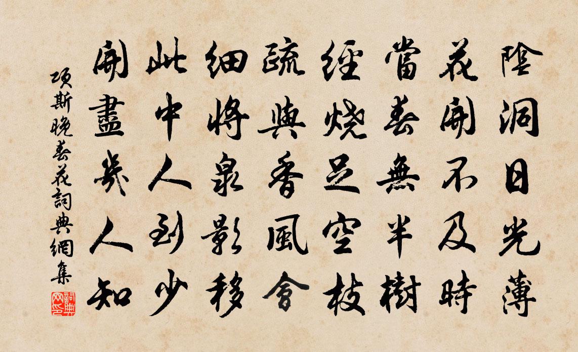 詩詞名句歷史字典書法欣賞書法字典國語詞典說文解字康熙字典古漢語字典標 題 作 者 詩 句 晚春花作者:項斯 朝代:唐代晚春花原文陰洞日光薄,花開不及時。當春無半樹,經燒足空枝。疏與香風會,細將泉影移。此中人到少,開盡幾人知。詩詞問答問:晚春花的作者是誰?答:項斯問:晚春花寫於哪個朝代?答:唐代問:晚春花是什麼體裁?答:五律項斯晚春花書法欣賞晚春花書法作品注釋全唐詩:卷554-11詩詞推薦菩薩蠻(賞梅)趙長卿〔宋代〕梅花有意舒香粉。舒香已得先春信。香與露華清。露濃愁 * 。酒多愁愈重。此意誰能共。淚濕染衣斑。夜霜金縷送蘇台守受代歸朝夏竦〔宋代〕香案當衙拜鳳書,使君旌節下姑蘇。賓朋唱和詩千首,耆幼扶攜酒百壺。野樹遮藏過建業,亂山迎送出江都。西風賦竹深處衛宗武〔宋代〕淇園既往不足論,渭川徒多未足貴。森然玉立闢幽深,彌望恢恢有餘地。何異東亭手親植,遂使南陽日清閟。綠雲太白樓文天祥〔宋代〕揚子江心第一泉,南金來此鑄文淵。男兒斬卻樓蘭首,閒品茶經拜羽仙。巫山一段雲 煙寺晚鐘李齊賢〔元代〕楚甸秋霖卷,湘岑暮靄濃。一春容罷一春容。何許日沉鍾。搖月傳空谷,隨風渡遠峰。溪橋有客倚寒筇。一逕入雲餘十歲時從亡兄仲氏侍先父攝帥江陵郡圃蠟梅李壁〔宋代〕病眼清晨欲泫霜,誰將幻色對山房。十年猶記湖陰夢,幾度愁聞漢苑香。臘雪近春才一白,好花得地更深黃。只應偈傾一百六十九首釋智朋〔宋代〕象王行處,狐兔絕蹤。水月現時,風雲自異。武陵春 憶道友王哲〔元代〕業雲涯別有景,曲武陵春。日清閒沒苦辛。載得全真。是人非俱不管,爵肯相親。史哥時說一新。斧斷迷津。滿庭芳 破迷馬鈺〔元代〕名成鬼利遂,男鬼婚女娉。鬼不覺容衰霜鬢。轉使**,豈想大限將近。小鬼傍觀失笑,且從他、殘喘胡騁。忽染內闔錢公寵惠高麗扇以梅州大紙報之仍賦詩孔武仲〔宋代〕昨夜秋風來戶庭,殘燈閃滅微涼生。得公團扇未及用,掛向空堂神骨清。但將遠趣醒耳目,不獨暑月排歊蒸。慚當題興化小閣李新〔宋代〕田界紋楸看綠玉,池分龜兆渴清泉。水曹載酒非無意,小雨留人信有緣。金峰寺陳自新〔宋代〕金峰寺外望藍橋,只尺溪山路許遙。世事昏人心似醉,倚欄無計遺愁消。尤尚書輓詩項安世〔宋代〕舊學淵衷記,新阡玉色疑。似聞形嘆慨,未忍失容儀。海道空齏志,西州只貯悲。平生謝公願,後世子云知。宿青山市四首楊萬里〔宋代〕青山業主是玄暉,太白無錢典得伊。總是詩仙休更訟,兩蓑分釣一魚磯。送吳侍御司馬赴台州武元衡〔唐代〕盧耽佐郡遙,川陸共迢迢。風景輕吳會,文章變越謠。煙林繁橘柚,雲海浩波潮。余有靈山夢,前君到石橋。李與賢來訪,自言所居幽勝,甚似剡溪。因以楊萬里〔宋代〕溪上新橋是鳳林,殘風剩雨做秋陰。先生小試南風手,寫得一川山水音。琴曲歌辭宛轉歌二首劉方平〔唐代〕星參差,明月二八燈五枝。黃鶴瑤琴將別去,芙蓉羽帳惜空垂。歌宛轉,宛轉恨無窮。願為潮與浪,俱起碧流中。措魚兒(送王子文知太平州)李昴英〔宋代〕怪朝來、片紅初瘦,半分春事風雨。丹山碧水含離恨,有腳陽春難駐。芳草渡。似叫住東君,滿樹黃鸝語。無端杜送趙子直貳卿帥三山樓鑰〔宋代〕一蹴登從班,人胡謂公遲。建牙帥七閩,人胡為公疑,公今第一流,志操古與期。兩州有遺愛,江西憺霜威。重來寒食前一日行部過牛首山七首楊萬里〔宋代〕一春今歲雨中和,信道韶華定較多。二月半頭花已盡,脫空日月退還他。名句推薦晚來天,空悄然,孤眠,枕檀雲髻偏。孫光憲《河傳·花落》 凍臉有痕皆是血,酸心無恨亦成灰。曹雪芹《詠紅梅花得“梅”字》 照野瀰瀰淺浪,橫空隱隱層霄。蘇軾《西江月·頃在黃州》 誰念遷客歸來,老大傷名節。李綱《六么令·次韻和賀方回金陵懷古鄱陽席上作》 嵩雲秦樹久離居,雙鯉迢迢一紙書。李商隱《寄令狐郎中》 妾身獨自眠,月圓人未圓。王元鼎《憑欄人·閨怨》 血染紅箋,淚題錦句。西湖豈憶相思苦。劉將孫《踏莎行·閒遊》 陰陰溪曲綠交加,小雨翻萍上淺沙。晁沖之《春日·陰陰溪曲綠交加》 持而盈之,不如其已。揣而銳之,不可長保。金玉滿堂,莫之能守。富貴而驕,自遺其咎。功成身退,天之道。老子《老子·道經·第九章》 吳興才人怨春風,桃花滿陌千里紅。李賀《送沈亞之歌·並序》