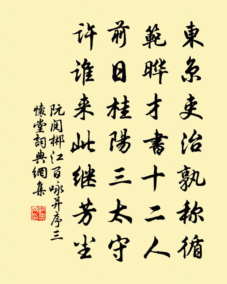 詩詞名句歷史字典書法欣賞書法字典國語詞典說文解字康熙字典古漢語字典標 題 作 者 詩 句 郴江百詠並序三懷堂作者:阮閱 朝代:宋代郴江百詠並序三懷堂原文東京吏治孰稱循,范曄才書十二人。前日桂陽三太守,許誰來此繼芳塵。詩詞問答問:郴江百詠並序三懷堂的作者是誰?答:阮閱問:郴江百詠並序三懷堂寫於哪個朝代?答:宋代阮閱郴江百詠並序三懷堂書法欣賞郴江百詠並序三懷堂書法作品詩詞推薦送穆上人歸鳳山兼簡仲深釋行海〔宋代〕客亭楊柳思悠悠,隔岸青山是越州。風急片帆飛鳥外,一江煙雨結春愁。宿岐山姜明府廳耿湋〔唐代〕暝色休群動,秋齋遠客情。細風和雨氣,寒竹度簾聲。日覺蹉跎近,天教懶慢成。誰能謁卿相,朝夕算浮榮。浣溪沙李洪〔宋代〕夭矯翔鸞溪上峰。飄蕭雪霰打船篷。天花凌亂水晶宮。飛透紙窗斜取勢,吹回溪面舞因風。身游水墨畫圖中。答王越州蓬萊閣張伯玉〔宋代〕書報蓬萊高閣成,越山增翠越波明。雲收海上天地靜,人在月中金翠橫。游女弄芳珠作佩,仙人度曲玉為笙。會須又依韻一首晁說之〔宋代〕看去朱轓今已歸,問予山郡幾多時。盤絛綾樣知能盛,帶葉甘香定不衰。惜別荔枝紅髮{上髟下我},恨看山嶺碧同洛陽李少府觀永樂公主入蕃孫逖〔唐代〕邊地鶯花少,年來未覺新。美人天上落,龍塞始應春。僧院泉修睦〔唐代〕澄澈照人膽,深山只一般。來難窮處所,心去助波瀾。砌曲夜聲苦,窗虛客夢闌。無心誰肯愛,時有老僧看。秋懷十首陳師道〔宋代〕黃公輕千乘,尚愛五斗祿。風雨聽朝雞,歲月老松菊。平生白蓮社,不受一塵觸。識字即投閣,貴者須食肉。和子由記園中草木十一首蘇軾〔宋代〕芎窮生蜀道,白芷來江南。漂流到關輔,猶不失芳甘。濯濯翠莖滿,愔愔清露涵。及其未花實,可以資筐藍。秋節釣台戴復古〔宋代〕赤符新領舊乾坤,多謝君王問故人。暫作客星侵帝座,終為漁父老江濱。層台不啻幾千仞,直釣何曾掛一鱗。莫道客懷林景熙〔宋代〕道出簫台北,青鞋第幾山。看雲生遠思,臨水覺衰顏。石室猿空老,花時燕獨還。春光已愁寂,況復在兵間。送張秘書充劉相公通汴河判官,便赴江外覲省岑參〔唐代〕前年見君時,見君正泥蟠。去年見君處,見君已風摶。朝趨赤墀前,高視青雲端。新登麒麟閣,適脫獬豸冠。劉公因事晁說之〔宋代〕風雨連宵疾病增,幽憂到此果何勝。弟兄分散兩三處,圖史尋求萬一能。魯酒齊歌元不惡,吳酸楚酪乍須稱。東皇答韓十八駑驥吟歐陽詹〔唐代〕故人舒其憤,昨示駑驥篇。駑以易售陳,驥以難知言。委曲感既深,咨嗟詞亦殷。伊情有遠瀾,余志遜其源。室在浣溪沙(送杜仲高)黃機〔宋代〕綠綺空彈恨未平。可堪執手送行人。碧酒謾將珍重意,莫辭斟。我定憶君吟渭北,君須思我賦停雲。未信高山流水遠懷二首蘇泂〔宋代〕去國三千里,書來一再行。過從應夙數,契闊更殊鄉。沙草留徐步,溪鷗傍晚涼。人間無限事,獨自有難忘。送法海長老釋重顯〔宋代〕常愛裴相國,式芳塵,斷際高風慕要倫。擬欲事師為弟子,不知將法付何人。常愛李相國,垂列星,藥嶠深源宅性句馮去非〔宋代〕卻是後生王介甫,不曾攜妓涴東山。飛泉蒲壽宬〔宋代〕蘚壁輕飛霧雨寒,一簾清漱玉珊珊。游鱗莫羨層瀾去,鏤雪雕冰滿肺肝。感懷胡仲弓〔宋代〕曾將敝帚棄牆陰,十載塵埃懶重尋。今日攜來掃花徑,老夫安得不關心。名句推薦斷無蜂蝶慕幽香,紅衣脫盡芳心苦。賀鑄《芳心苦·楊柳回塘》 悔既往之失,亦要防將來之非。洪應明《菜根譚·概論》 義典則弘,文約為美。劉勰《文心雕龍·銘箴》 被酒莫驚春睡重,賭書消得潑茶香,當時只道是尋常。納蘭性德《浣溪沙·誰念西風獨自涼》 紅深綠暗徑相交,抱暖含芳披紫袍。溫庭筠《寒食日作》 寂寂柴門村落里,也教插柳記年華。趙鼎《寒食》 思君如流水,何有窮已時。徐幹《室思》 空勞縴手,解佩贈情人。牛希濟《臨江仙·柳帶搖風漢水濱》 舊時茅店社林邊,路轉溪橋忽見。辛棄疾《西江月·夜行黃沙道中》 觀今宜鑑古,無古不成今。佚名《增廣賢文·上集》