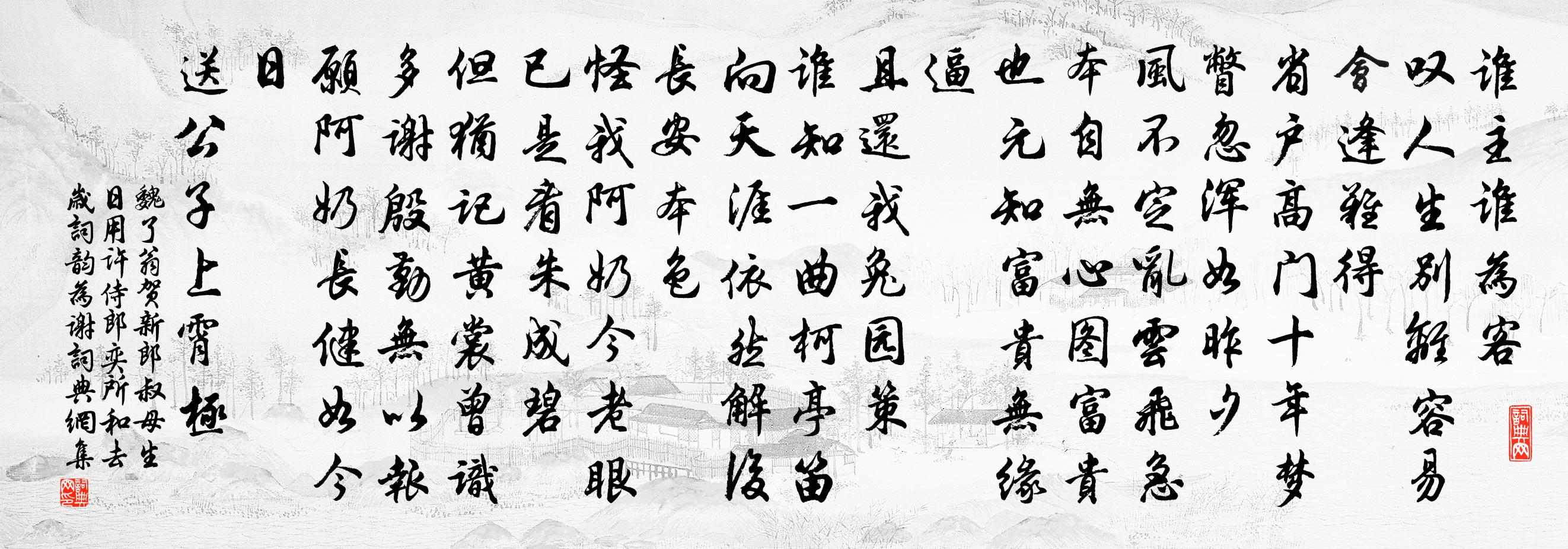 詩詞名句歷史字典書法欣賞書法字典國語詞典說文解字康熙字典古漢語字典標 題 作 者 詩 句 賀新郎(叔母生日用許侍郎奕所和去歲詞韻為謝)作者:魏了翁 朝代:宋代原文誰主誰為客。嘆人生、別離容易,會逢難得。省戶高門十年夢,瞥忽渾如昨夕。風不定、亂雲飛急。本自無心圖富貴,也元知、富貴無緣逼。且還我,兔園策。誰知一曲柯亭笛。向天涯、依然解後,長安本色。怪我阿奶今老眼,已是看朱成碧。但猶記、黃裳曾識。多謝殷勤無以報,願阿奶、長健如今日。送公子,上霄極。詩詞問答問:《賀新郎(叔母生日用許侍郎奕所和去歲詞韻為謝)》的作者是誰?答:魏了翁問:該詩寫於哪個朝代?答:宋代問:該詩是什麼體裁?答:詞書法欣賞賀新郎(叔母生日用許侍郎奕所和去歲詞韻為謝)書法作品詩詞推薦懷借舟主人袁說友〔宋代〕自憐五十鬢如絲,更把閒身與物馳。惟有高人收倦翼,世間萬事一彈棋。殘句:勢不可使盡陳師道〔宋代〕勢不可使盡,福不可享盡。事不可做盡,話不可說盡。人生如此耳,文字已其閏。追和亡友杜仲觀古黃生曲三首之一賀鑄〔宋代〕朝為去山雲,暮為還山雨。誰謂物無情,歡期不知許。初致仕後戲酬留守牛相公 並呈分司諸寮友。白居易〔唐代〕南北東西無所羈,掛冠目在勝分司。探花嘗酒多先到,拜表行香盡不知。炮筍烹魚飽餐後,擁袍枕臂醉眠時。報君題楊補之梅二首曾豐〔宋代〕風流青帝欲回春,先遣玉妃清路塵。過眼被渠偷筆寫,雖忙猶得九分真。作字陸游〔宋代〕整整復斜斜,翩如風際鴉。書成半行草,眼倦正昏花。未辦倉盛筆,寧能錐畫沙?老夫端可媿,頭白不名家。期頤堂龔明之〔宋代〕少年已自樂杯觴,種秫安排老醉鄉。試問幾回供酒事,真成三萬六千場。嶺梅張道洽〔宋代〕到處皆詩境,隨時有物華。應酬都不暇,一嶺是梅花。上林春/一落縈晁端禮〔宋代〕霖雨成功,堂稱繼美,舊說安陽家世。峻岳降神,長庚應夢,佳辰況當秋霽。玉函金篆,帝錫與、壽眉齯齒。向清桃源章碣〔唐代〕絕壁相欹是洞門,昔人從此入仙源。數株花下逢珠翠,半曲歌中老子孫。別後自疑園吏夢,歸來誰信釣翁言。山前次韻張守四首陳造〔宋代〕新詩囊錦墮春窗,旋炷銅爐百和香。試握毛錐支勁敵,獨憐赤手強扶瘡。丈亭道者乾緣求頌釋紹曇〔宋代〕破钁頭邊用得親,入廛不撥萬機塵。牢關劄斷三江口,要被隨波逐浪人。賣花者司馬扎〔唐代〕少壯彼何人,種花荒苑外。不知力田苦,卻笑耕耘輩。當春 * 色,來往經幾代。長安甲第多,處處花堪愛。良金鳳棲梧長筌子〔元代〕逃暑繩床聊慰興。翠籜森森,幾處花陰襯。萱草池塘人不問。綠荷暗竊薰風信。懶把霜紈嫌力困。沉李嚼冰,煮茗祝英台近(武陵寄暖紅諸院)趙長卿〔宋代〕記臨歧,銷黯處。離恨慘歌舞。恰是江梅,開遍小春暮。斷腸一曲金衣,兩行玉箸,酒闌後、欲行難去。惡情緒。菩薩蠻(怨別)侯置〔宋代〕揉香嗅蕊朝還暮。無端卻被西風誤。底死欲留伊。金塵蔌蔌飛。茂陵頭已白。新聘誰相得。耐久莫相思。年年秋與思親五首謝枋得〔宋代〕九十萱親天下稀,平生教子欲何為。楚王肯立韓公子,良也歸韓亦有辭。和崔公度家風琴八首王安石〔宋代〕屋山終日信飄飄,似與幽人破寂寥。為有機心須強聒,直教懸解始聲消。早作裘萬頃〔宋代〕雨過長江浪拍城,迢迢羲馭水中行。舟人指點雲開處,喜見青山一抹橫。夏日戲作陸游〔宋代〕困來兩眥似膠黏,底怪吳人號黑甜。安得他生不識字,朝朝就日臥茅檐?名句推薦相知無遠近,萬里尚為鄰。張九齡《送韋城李少府》 當斷不斷,反受其亂班固《漢書·傳·高五王傳》 無肉令人瘦,無竹令人俗。蘇軾《於潛僧綠筠軒》 漳水出焉,東流注於河。佚名《精衛填海》 記曉葉題霜,秋燈吟雨,曾系長橋過艇。吳文英《十二郎·垂虹橋》 愛敬盡於事親,而德教加於百姓,刑於四海孔子及其弟子《孝經·天子》 黃河之水天上來,奔流到海不復回。李白《將進酒》 不剪春衫愁意態,過收燈、有些寒在史達祖《夜行船·正月十八日聞賣杏花有感》 理貴有中,不必過厚李大師、李延壽《南史·列傳·卷十八》 行人莫便消魂去,漢渚星橋尚有期。晏幾道《鷓鴣天·梅蕊新妝桂葉眉》