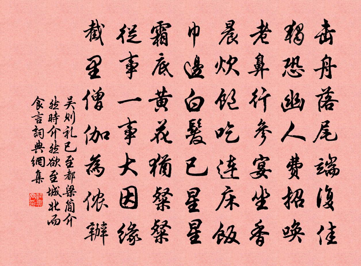 詩詞名句歷史字典書法欣賞書法字典國語詞典說文解字康熙字典古漢語字典標 題 作 者 詩 句 已至都梁簡介然時介然欲至城北而食言作者:吳則禮 朝代:宋代原文擊舟落尾端復佳,獨恐幽人費招喚。老鼻行參宴坐香,晨炊飽吃連床飯。巾邊白髮已星星,霜底黃花猶粲粲。從事一事大因緣,截里僧伽為儂辦。詩詞問答問:《已至都梁簡介然時介然欲至城北而食言》的作者是誰?答:吳則禮問:該詩寫於哪個朝代?答:宋代書法欣賞已至都梁簡介然時介然欲至城北而食言書法作品詩詞推薦答單監簿胡銓〔宋代〕賢哉洛城翁,塵甑每貸粟。飢來睨書案,臭味清可掬。獨抱古遺經,凜凜一川玉。唯知耕寬閒,未暇井衍沃。蕭然倡女行喬知之〔唐代〕石榴酒,葡萄漿。蘭桂芳,茱萸香。願君駐金鞍,暫此共年芳。願君解羅襦,一醉同匡床。文君正新寡,結念在歌送張王臣還峽州兼屬峽守郭郎中季勇二首趙蕃〔宋代〕久矣聞風折角巾,近來乃得誦詩新。雨奇晴好西湖賦,梅落草生三峽春。再拜因行為多謝,尺書願寄恐無因。靖州嚴陵道上雜詠七首洪咨夔〔宋代〕細草護沙連不斷,疏風略雨散還收。山田麥熟不歸去,三百里江都是愁。招同僚賞雙頭荷花鄭獬〔宋代〕為愛荷花並蒂開,便將荷葉作金杯。桃根桃葉俱殊色,且看相攜渡水來。送雍陶游蜀姚合〔唐代〕春色三千里,愁人意未開。木梢穿棧出,雨勢隔江來。荒館因花宿,深山羨客回。相如何物在,應只有琴台。孫供奉林景熙〔宋代〕緋衣受天恩,日瞻唐殿駕。朱三爾何為,欲使兩膝下。次韻公立承事見貺佳什李彌遜〔宋代〕竹外孤亭思渺然,與君持酒傲壺天。不須五斛稱焦遂,一酌高談駭四筵。次韻忠甫初見菊開馮伯規〔宋代〕積雨曉放霽,紅日照我帷。起來步幽蹊,金蕊燦朱扉。芳姿自嫵媚,微香襲人衣。令節無多日,更宜擁培之。三徑上灘黎廷瑞〔宋代〕歲月川流駛,風霜行路難。忽聞喧怒瀑,始覺上層灘。月落雞聲曉,沙空雁夢寒。雲林搖落盡,敢卜一枝安。上谹父郎中二首王洋〔宋代〕湘江又見承明客,青嶂誰刊嶽麓詩。雙旆到時鴻雁少,洞庭春水照旌旗。高宗郊祀前廟朝享太廟三十首真宗〔宋代〕秬鬯既將,黃鐘具奏。肅我祖考,祇栗以俟。於皇列聖,在帝左右。監觀於茲,雲車來下。瑣窗寒(懷舊寄林七膳部)張輯〔宋代〕露漏沈沈,洞房燈悄,鵲翻庭樹。夜涼如水,人倚玉簫何處。澹縱橫、疏星斷河,點衣黃葉飛四五。向此時感舊,貽老僧信禪師〔宋代〕俗胝知多少,龐眉擁毳袍。看經嫌字小,間事愛聲高。暴日終無厭,登階漸覺勞。自言曾少莊,游岳兩三遭。康使君惠詩借韻謝楊公遠〔宋代〕幾幅生綃掃麝煤,枯梢黏蘚石封苔。布成野水雲山去,博得金章玉句來。眉白自慚非我有,眼青多藉為儂開。一經長安行贈郭法曹思聰晁補之〔宋代〕越羅作衫烏紗幘,長安青雲少年客。梁門門西狹斜陌,飛閣氤氳多第宅。南威十五桃花色,蕭管哀吟動魂魄。銀槽別高子勉兄弟王銍〔宋代〕南北奔波歲月催,足間渾未洗塵埃。休將舊事從頭說,且喜新年入手來。千里遠同傳信雁,一枝同插未開梅。濁醪元藏主遊方釋智愚〔宋代〕罵詈瞿曇說脫空,年來分外惡情悰。吳山越水相逢著,放出蟭螟咬大蟲。岑使君牧襄陽受代還朝某同趙德麟謝公定潘仲李廌〔宋代〕使臣撫南夏,萬夫久以望。道粹韻宇勝,德滿聲譽香。炳然龍虎文,瑑此金玉相。笑談府中居,無為民自康。寄宜興趙大夫二首劉宰〔宋代〕去接鴛行侶,猶憐鶴髮翁。連翩致嘉實,多旨薦清空。往見孤成約,酬知有朴忠。金張業爾耳,相閥自清風。名句推薦驚風亂颭芙蓉水,密雨斜侵薜荔牆。柳宗元《登柳州城樓寄漳汀封連四州》 採桑秦氏女,織錦竇家妻。薛道衡《昔昔鹽》 我今因病魂顛倒,唯夢閒人不夢君。元稹《酬樂天頻夢微之》 春未綠,鬢先絲。人間別久不成悲。姜夔《鷓鴣天·元夕有所夢》 聖人苟可以強國,不法其故;苟可以利民,不循其禮。商鞅《商君書·更法》 善言天者必有徵於人,善言古者必有驗於今班固《漢書·傳·董仲舒傳》 事諸父,如事父。事諸兄,如事兄。李毓秀《弟子規·出則弟》 細看不是雪無香,天風吹得香零落。王旭《踏莎行·雪中看梅花》 位卑未敢忘憂國,事定猶須待闔棺。陸游《病起書懷》 盛事惟忠,庸則自從。來俊臣《羅織經·控權卷第四》