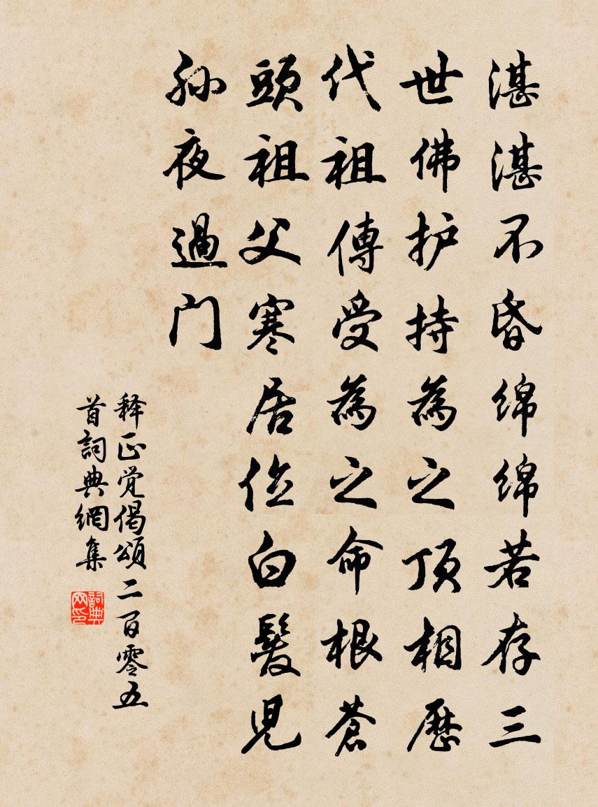 詩詞名句歷史字典書法欣賞書法字典國語詞典說文解字康熙字典古漢語字典標 題 作 者 詩 句 偈頌二百零五首作者:釋正覺 朝代:宋代偈頌二百零五首原文湛湛不昏,綿綿若存。三世佛護持為之頂相,歷代祖傳受為之命根。蒼頭祖父寒居位,白髮兒孫夜過門。詩詞問答問:偈頌二百零五首的作者是誰?答:釋正覺問:偈頌二百零五首寫於哪個朝代?答:宋代釋正覺偈頌二百零五首書法欣賞偈頌二百零五首書法作品詩詞推薦閒遊白居易〔唐代〕外事因慵廢,中懷與靜期。尋泉上山遠,看筍出林遲。白石磨樵斧,青竿理釣絲。澄清深淺好,最愛夕陽時。句趙師秀〔宋代〕石畔長來枝易老,竹間瘦得萼全清。讀道藏葛密〔宋代〕煉成真氣發雙華,還向囊中秘玉霞。咒水夜潭龍怖劍,弄雲秋嶺鶴看家。寒食新豐別友人趙嘏〔唐代〕一百五日家未歸,新豐雞犬獨依依。滿樓春色傍人醉,半夜雨聲前計非。繚繞溝塍含綠晚,荒涼樹石向川微。東風郊廟歌辭。享太廟樂章。景雲舞佚名〔唐代〕惟睿作聖,惟聖登皇。精感耀魄,時膺會昌。舜慚大孝,堯推讓王。能事斯極,振古誰方。文明履運,車書同軌。雜詠一百首曹騰劉克莊〔宋代〕費亭侯在日,亂已有萌芽。養得螟蛉種,猶能覆漢家。再作雲溪郭印〔宋代〕修篁衛長江,雲氣自翔集。中有無心人,片雲隨出入。捧佛安名釋了惠〔宋代〕名正安亦正,形端景亦瑞。呼來並諾去,驢屎雜栴檀。酬和甫祥源觀醮罷見寄王安石〔宋代〕竊祿祠官久見容,每持金石薦宸衷。鈞天忽忽清都夢,方丈寥寥羽水風。知結勝緣人意外,想尋陳跡馬蹄中。新詩餞許州宋司馬赴任馬懷素〔唐代〕潁川開郡邑,角宿分躔野。君非仲舉才,誰是題輿者。憫憫琴上鶴,蕭蕭路傍馬。嚴程若可留,別袂希再把。江上戴復古〔宋代〕江上維舟穩,人間行路難。數朝花雨細,一夜社風寒。燕語能留客,蛙鳴豈為官。苦吟成底事,贏得瘦團欒。曉出西門問程廬山回懷雲翁董嗣杲〔宋代〕誰樓罷傳角,將啟東方明。我欲披野衣,西出湓江城。整屐休遲回,徑作匡廬行。是時涼雲閣,茅屋雞互鳴。蕭蕭詠雪 / 詠雪聯句劉義慶〔南北朝〕謝太傅寒雪日內集,與兒女講論文義。俄而雪驟,公欣然曰:“白雪紛紛何所似?”兄子胡兒曰:“撒鹽空中差可湖上作貫休〔唐代〕我竟胡為者,嘮嘮但愛吟。身中多病在,湖上住年深。山溜穿苔壁,風鍾度雪林。近來心更苦,誰復是知音。木蘭花慢·送翁五峰游江陵吳文英〔宋代〕送秋雲萬里,算舒捲、總何心。嘆路轉羊腸,人營燕壘,霜滿蓬簪。愁侵。庾塵滿袖,便封侯、那羨漢淮陰。一醉酬令狐相公新蟬見寄劉禹錫〔唐代〕相去三千里,聞蟬同此時。清吟曉露葉,愁噪夕陽枝。忽爾弦斷絕,俄聞管參差。洛橋碧雲晚,西望佳人期。湖上方岳〔宋代〕沙暖鴛鴦傍柳眠,春來亦懶避湖船。佳人窈窕惜顏色,自照晴波整翠鈿。雨臥舟中鄧深〔宋代〕不許反頭逢底下,僅容舒膝簟中間。聽風聽雨聽灘浪,才得晴時出看山。和俟其按察詠縣學古梅舒岳祥〔宋代〕四教堂前百歲梅,北方豪傑為渠來。清癯自許根封雪,勁峭何妨骨鎖苔。影里青衿飽弦誦,花前玉節照杓魁。林逋擬李義山柳枝詞五首陳師道〔宋代〕嫋嫋東門柳,重重小苑花。為誰須落子,著意莫藏鴉。名句推薦天下神器,不可為也,不可執也。為者敗之,執者失之。老子《老子·道經·第二十九章》 泥落畫梁空,夢想青春語。吳文英《生查子·秋社》 出不入兮往不反,平原忽兮路超遠。屈原《國殤》 山棲是勝事,稍一縈戀,則亦市朝;書畫賞鑒是雅事,稍一貪痴,則亦商賈陳繼儒《小窗幽記·集醒篇》 綺席凝塵,香閨掩霧。晏殊《踏莎行·碧海無波》 人之性惡,其善者偽也。荀子《荀子·性惡》 經一失長一智馮夢龍《警世通言·卷三》 天下傷心處,勞勞送客亭。李白《勞勞亭》 積土成山,風雨興焉;荀子《勸學》 殘霞夕照西湖好,花塢苹汀,十頃波平,野岸無人舟自橫。歐陽修《採桑子·殘霞夕照西湖好》