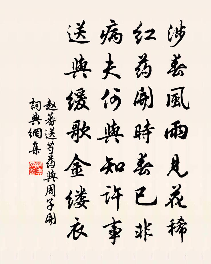 詩詞名句歷史字典書法欣賞書法字典國語詞典說文解字康熙字典古漢語字典標 題 作 者 詩 句 送芍藥與周子開作者:趙蕃 朝代:宋代送芍藥與周子開原文涉春風雨見花稀,紅藥開時春已非。病夫何與知許事,送與緩歌金縷衣。詩詞問答問:送芍藥與周子開的作者是誰?答:趙蕃問:送芍藥與周子開寫於哪個朝代?答:宋代趙蕃送芍藥與周子開書法欣賞送芍藥與周子開書法作品詩詞推薦病餘兀坐偶成二絕王之望〔宋代〕寂寂經旬病臥家,起來都不記年華。一聲檐上驚秋晚,牆外初聯賣菊花。休日招李山房杜北山訪渭濱秋浦於孤山即席用徐集孫〔宋代〕凜凜仙風匝葑田,徘徊懷古事茫然。眼空湖海無塵累,身在蓬萊有宿緣。孤策遍尋儲鶴地,偏提自汲煮茶泉。詩家不寐李覯〔宋代〕四壁空空絕語聲,困來終是睡難成。孤燈要與人相背,寒漏苦教天不明。累月故園無信息,幾般閒事惱心情。別愁題東觀壁謝枋得〔宋代〕觀外好看船往回,觀中幾度見桃開。常瞻紫氣青牛去,又帶白雲黃鶴來。天地無情搔短髮,古今多變付殘杯。醉中木筆花張朴〔宋代〕亭亭花一樹,乍發小東牆。碧管描春色,丹鋒點化工。凝窗時染翰,弄影日書空。莫問龍蛇事,臨池興不窮。贈蜀士盧石受二首劉克莊〔宋代〕蜀郡盧夫子,沉冥不偶時。幽深病梨賦,奇怪磔蟆詩。古有嚴並李,今無曠與夔。何當短檠下,歷歷叩群疑。送皇甫齡宰交河張謂〔唐代〕將軍帳下來從客,小邑彈琴不易逢。樓上胡笳傳別怨,尊中臘酒為誰濃。行人醉出雙門道,少婦愁看七里烽。今日候月台宋庠〔宋代〕平昔詞林伯,嘗為右輔來。庾公偏愛月,薛縣未傾台。鑱石雲根斷,臨波水腹開。良宵時弭蓋,方信謝莊才。頌古五十七首釋道昌〔宋代〕說明道白,埋塵混垢。變化有由,敗露不走。誰知暗裡骨橫抽,要在轟轟霹靂手。觀書于謙〔明代〕書卷多情似故人,晨昏憂樂每相親。眼前直下三千字,胸次全無一點塵。活水源流隨處滿,東風花柳逐時新。金鞍臘享王安石〔宋代〕明星慘澹月參差,萬竅含風各自悲。人散廟門燈火盡,卻尋殘夢獨多時。四月八日示澄照大師胡宏〔宋代〕今朝浴佛事如何?清淨心田也洗麽。塵垢不知何處得,古來朋月照江波。試院中王安石〔宋代〕白髮無聊病更侵,移床臥竹向秋陰。朝來雁背西風急,吹折江湖萬里心。織婦詞元稹〔唐代〕織夫何太忙,蠶經三臥行欲老。蠶神女聖早成絲,今年絲稅抽征早。早征非是官人惡。去歲官家事戎索。征人戰苦西江月黃庭堅〔宋代〕宋玉短牆東畔,桃源落日西斜。濃妝下著繡簾遮。鼓笛相催清夜。轉眄驚翻長袖,低徊細踏紅靴。舞餘猶顫滿頭花十一月初八日觀雨方回〔宋代〕重陽晴過小春天,忽復蕭騷雨可憐。響入竹林全似雪,濕蒸茅舍最宜煙。戰塵洗淨無傳箭,客路泥深亦著鞭。三月懷晦岩劉克莊〔宋代〕免呼鑒義與尚書,師卸金欄我佩魚。扈豹尾車儂老矣,升獅子座者誰歟。草鞋曾遍三千界,雪頂今皆八十餘。台嶺送榮茂世李處權〔宋代〕戎馮絕黃流,飛塵暗京畿。竟成王室禍,痛定不忍思。衣冠半陷沒,逃難皆散之。有如水衡君,將命弗顧危。躍馬寄柳州韓司戶郎中韋應物〔唐代〕達識書與昧機,書智殊跡同書靜。於焉書得攜手,屢賞清夜景。瀟灑陪高詠,從容羨華省。一逐風波遷,南登桂陽和陳信民除夕項安世〔宋代〕已知時節到門闌,猶有私情惜舊錢。千戶神桃俄已換,一聲鬼竹豈其難。痴人星發愁春鏡,稚子花襦簇曉盤。歲歲名句推薦行有不得者,皆反求諸己,其身正而天下歸之。孟子《孟子·離婁章句上·第四節》 氣軟來風易,枝繁度鳥遲。李爽《芳樹》 朔風吹散三更雪,倩魂猶戀桃花月。納蘭性德《菩薩蠻·朔風吹散三更雪》 風雨滿城,何幸兩重陽之近;文天祥《回董提舉中秋請宴啟》 窗間梅熟落蒂,牆下筍成出林。范成大《喜晴》 片雲天共遠,永夜月同孤。杜甫《江漢》 問弄雪飄枝,無雙亭上,何日重遊。鄭覺齊《揚州慢·瓊花》 靈山多秀色,空水共氤氳。張九齡《湖口望廬山瀑布泉 / 湖口望廬山瀑布水》 夢後樓台高鎖,酒醒簾幕低垂。晏幾道《臨江仙·夢後樓台高鎖》 一去二三里,煙村四五家。邵雍《山村詠懷》