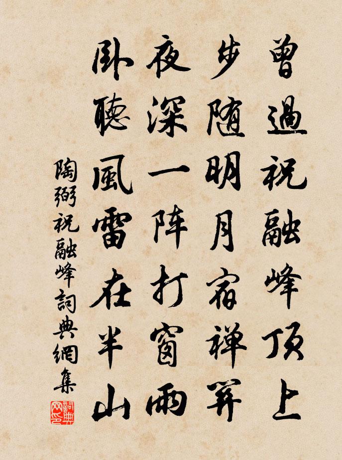 詩詞名句歷史字典書法欣賞書法字典國語詞典說文解字康熙字典古漢語字典標 題 作 者 詩 句 祝融峰作者:陶弼 朝代:宋代祝融峰原文曾過祝融峰頂上,步隨明月宿禪關。夜深一陣打窗雨,臥聽風雷在半山。詩詞問答問:祝融峰的作者是誰?答:陶弼問:祝融峰寫於哪個朝代?答:宋代陶弼祝融峰書法欣賞祝融峰書法作品詩詞推薦寄題陽武宰王安之慶豐亭梅堯臣〔宋代〕官為人父母,身自奉其親。結宇後園中,散步以怡神。寒溫適所適,朝夕饋爾珍。諸孫同在傍,嬉戲情各均。庭下臨江仙葉夢得〔宋代〕草草一年真過夢,此生不恨萍浮。且令從事到青州。已能從辟穀,那更話封留。好月尚尋當日約,故人何啻三秋。巫山高盧照鄰〔唐代〕巫山望不極,望望下朝氛。莫辨啼猿樹,徒看神女雲。驚濤亂水脈,驟丙暗蜂文。沾裳即此地,厭復遠思君。琴曲歌辭。湘妃李賀〔唐代〕筠竹千年老不死,長伴秦娥蓋湘水。蠻娘吟弄滿寒空,九山靜綠淚花紅。離鸞別鳳煙梧中,巫雲蜀雨遙相通。幽愁又送地栗螃蟹簡趙倅詩王邁〔宋代〕鏤玉雕瓊飣中,盃行到手莫辭空。詩仙比作西湖藕,俎豆苹蘩入國風。次韻何學諭送行二首陳造〔宋代〕湖山迎客棹,觸目總宜詩。回首蓬萊近,平生汗漫期。衰年得奇觀,往事屬懷思。何日鴟夷去,扁舟共翠眉。次韻周子直四首張嵲〔宋代〕寰宇安危異,乾坤歲序同。投身雲嶠碧,落膽戰塵紅。晉馬成南渡,宗周入國風。操戈誰衛社,群盜正爭雄。讀《山海經》 其十陶淵明〔魏晉〕精衛銜微木,將以填滄海。刑天舞乾戚,猛志固常在。同物既無慮,化去不復悔。徒沒在昔心,良辰詎可待!寄題洪州李氏涵虛閣梅堯臣〔宋代〕耳熟滕閣美,未為豫章游。近聞東湖上,可見西山頭。朝愛雲氣生,暮數鳥行幽。主人趣向遠,登覽日不休。父兄次韻李著作送行二首項安世〔宋代〕群居未信相從樂,要識相從是別離。芸閣掩關當宿夜,江船吹火未眠時。無人見雁同持酒,有客看猿自賦詩。詩墨南中春意錢起〔唐代〕入仕無知言,遊方隨世道。平生願開濟,遇物乾懷抱。已阻青雲期,甘同散樗老。客游南海曲,坐見韶陽早。舊國送惠純上人游閩晃沖之〔宋代〕蚤聽閩人說土風,此身常鵒以閩中。春溝水動茶花白,夏谷雲生荔子紅。襟帶九江山水斷,梯航百粵王相通。北窗歸途馬上二首趙蕃〔宋代〕兀兀真成去,悠悠莫自嫌。陽光施德惠,風力霽威嚴。不待投醪賜,端同挾纊兼。山林從爾老,歲月豈余淹。霜花腴·重陽前一日泛石湖吳文英〔宋代〕翠微路窄,醉晚風、憑誰為整欹冠。霜飽花腴,燭消人瘦,秋光作也都難。病懷強寬。恨雁聲、偏落歌前。記年時勉陳石二生鄭獬〔宋代〕精金埋深山,鑿土不難得。大貝貯滄海,破浪亦能識。山趨猛虎穴,海入長蛟室。必意往取之,投軀不少惜。仁義滿庭芳(立春日呈劉春卿)王之道〔宋代〕天駟呈祥,土牛頒政,歡呼萬井春來。雕輪丹轂,雜沓展輕雷。風動珠簾不捲,香散處、半露梅腮。東郊好,波瀾平齋老先生游霅城葉氏園池有作俾次元韻釋文珦〔宋代〕名園無俗情,漁子往來密。憑闌古城近,屏翳秀石出。弁衡山獻青,苕霅水□碧。好景吟不窮,煙霏又將夕。和正仲君子泉舒岳祥〔宋代〕脈來層嶂遠,影到片天清。洗硯雲根起,歸瓢乳味盈。岩花蒙潤澤,水草見分明。已遂投簪志,何須起濯纓。憶秦娥(七夕)袁去華〔宋代〕月照席。不知天上今何夕。今何夕。鵲橋初就,玉繩低側。暫時不見猶尋覓。那堪更作經年隔。經年隔。許多良夜京兆杜嬰大醇能讀書其言近莊其為人曠達而廉王安石〔宋代〕叔度醫家子,君平卜肆翁。蕭條昨日事,彷佛古人風。舊宅雨生菌,新阡寒轉蓬。存亡誰一問,嗟我亦窮空。名句推薦自損者有餘,自益者彌昏。房玄齡《晉書·列傳·第八章》 江送巴南水,山橫塞北雲王勃《江亭夜月送別二首》 情如之何,暮塗為客,忍堪送君。吳文英《沁園春·送翁賓暘游鄂渚》 同是天涯淪落人,相逢何必曾相識!白居易《琵琶行 / 琵琶引》 年少辭家從冠軍,金鞍寶劍去邀勛。王涯《塞下曲二首·其二》 執古之道,以御今之有。老子《老子·道經·第十四章》 行到水窮處,坐看雲起時。王維《終南別業 / 初至山中 / 入山寄城中故人》 智者不危眾以舉事,仁者不違義以要功。范曄《後漢書·列傳·竇融列傳》 玉碗冰寒滴露華,粉融香雪透輕紗。晏殊《浣溪沙·玉碗冰寒滴露華》 歲月無多人易老,乾坤雖大愁難著吳潛《滿江紅·豫章滕王閣》