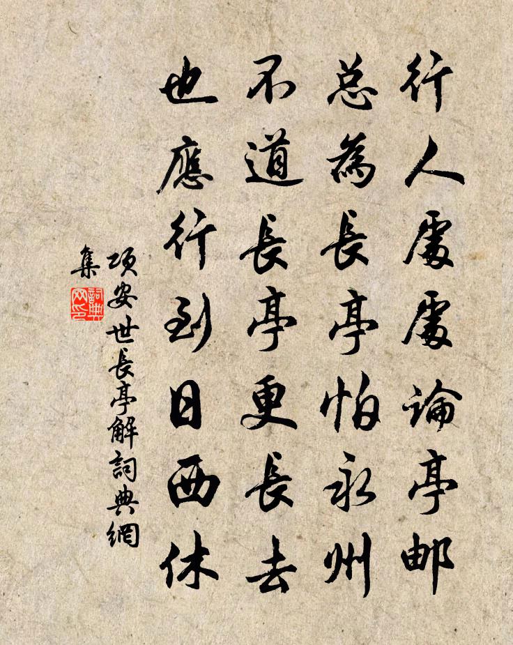 詩詞名句歷史字典書法欣賞書法字典國語詞典說文解字康熙字典古漢語字典標 題 作 者 詩 句 長亭解作者:項安世 朝代:宋代長亭解原文行人處處論亭郵,總為長亭怕永州。不道長亭更長去,也應行到日西休。詩詞問答問:長亭解的作者是誰?答:項安世問:長亭解寫於哪個朝代?答:宋代項安世長亭解書法欣賞長亭解書法作品詩詞推薦春日即事陳深〔宋代〕忽忽春將晚,幽窗趣亦佳。山峰時入座,野鼠畫緣階。俗事何能已,浮生信有涯。莊書讀一尺,聊復散幽懷。次壁間韻題懷巡道上三州三氏亭六言二首魏了翁〔宋代〕滿壁故人何在,倚闌心事誰同。蚤徑遊絲罥日,亂山瘦馬行空。題趙承遠所藏大年畫平遠二首潘大臨〔宋代〕吳頭楚尾散花洲,天闊波雲恰下鷗。帝子胸中有江漢,故能風露筆端秋。故相國潁公輓歌辭三首司馬光〔宋代〕滄波與鄧林,魚鳥久飛沈。一旦成陳跡,何人識寸心。高山亡景行,流水失知音。淚盡離東閣,歸來破故琴。虢州酬辛侍御見贈岑參〔唐代〕門柳葉已大,春花今復闌。鬢毛方二色,愁緒日千端。夫子屢新命,鄙夫仍舊官。相思難見面,時展尺書看。和何耕道別字韻詩郭印〔宋代〕失身落宦網,十載溪山別。麋鹿念故棲,舉目但愁絕。偶來招提游,幽亭坐深樾。美人抗高論,亹亹非涉獵。忽焉寄謝黃元信惠茶薛師石〔宋代〕建溪金鋌直幾千,余性所嗜一已偏。尋常草卉不足進,龍團鳳夸如珉堅。長須健卒前月到,手提茶器急取煎。妻兒念奴嬌(賞芍藥)曾覿〔宋代〕人生行樂,算一春歡賞,都來幾日。綠暗紅稀春已去,贏得星星頭白。醉里狂歌,花前起舞,拚罰金杯百。淋漓宮雨後望雲張嵲〔宋代〕歲序屬殘臘,雲容先發春。氛氳迎近壑,亂鬈靄遙津。暮色含微雨,林滋被細筠。憂居時物變,有淚灑蒼旻。舟次卷雪樓四首陶夢桂〔宋代〕踏遍三邊過劍關,故山風月幾年閒。如今著我中間住,風月無緣獨占山。送薛明府劉克莊〔宋代〕長官三載內,屢被督郵嗔。鎮靜苔刑少,公清縣庫貧。減租沾野老,掃榻待詩人。只恐鳧飛後,民間事事新。聞荒雞張嵲〔宋代〕但可摧頹悲失旦,不應風雨誤司晨。書生久已垂華發,豈是當年起舞人。漣上題樊氏水亭高適〔唐代〕漣上鹽非所趣,鹽偶為世務鹽牽。經時駐歸棹,日夕對平川。莫論行子愁,且得主人賢。亭上鹽初熟,廚中魚每鮮過嘉禾呈方懋德吳芾〔宋代〕昔嘗此地奉周旋,倒指於今三十年。今日相逢成二老,那知又復到樽前。寄友生李鹹用〔唐代〕交情應不變,何事久離群。圓月思同步,寒泉憶共聞。雪霜松色在,風雨雁行分。每見人來說,窗前改舊文。甲寅西歸江行春懷十首汪莘〔宋代〕一層山只一溪斜,偃臥東風戀日華。莫把江行生旅思,他年憶此勝還家。買酒陸游〔宋代〕放翁病起不禁愁,買酒看山自獻酬。八月吳中未搖落,誰令衰鬢早知秋?翠微亭鞏豐〔宋代〕行跡年來到處希,獨於岩壑有深期。鵝溪道士能相屬,請和空山木落詩。題榮子邕陋居二首張耒〔宋代〕一室荒蕪孺子貧,知君四海入經綸。殺身虎口終何補,灑掃庭除自可人。句張耒〔宋代〕鵠殼攢修乾,金華耀暖曦。名句推薦御柳如絲映九重,鳳凰窗映繡芙蓉。溫庭筠《楊柳枝》 夫因兵死守蓬茅,麻薴衣衫鬢髮焦。杜荀鶴《山中寡婦 / 時世行》 桐葉晨飄蛩夜語。旅思秋光,黯黯長安路。陸游《蝶戀花·桐葉晨飄蛩夜語》 為有書來與我期,便從蘭杜惹相思。莊棫《定風波·為有書來與我期》 千里稻花應秀色,五更桐葉最佳音。曾幾《蘇秀道中》 萬里想龍沙,泣孤臣吳越張元乾《石州慢·己酉秋吳興舟中作》 無奈朝來寒雨,晚來風。李煜《相見歡·林花謝了春紅》 門外子規啼未休,山村落日夢悠悠。陳與義《送人歸京師》 策馬自沙漠,長驅登塞垣。高適《薊中作》 龍噓氣成雲,雲固弗靈於龍也。韓愈《雜說一·龍說》