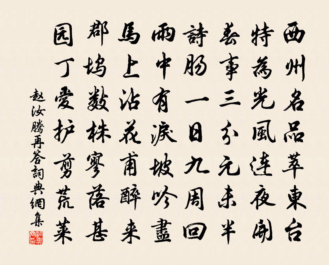 詩詞名句歷史字典書法欣賞書法字典國語詞典說文解字康熙字典古漢語字典標 題 作 者 詩 句 再答作者:趙汝騰 朝代:宋代再答原文西州名品萃東台。特為光風連夜開。春事三分元未半,詩腸一日九周回。雨中有淚坡吟盡,馬上沾花甫醉來。郡塢數株寥落甚,園丁愛護剪荒萊。詩詞問答問:再答的作者是誰?答:趙汝騰問:再答寫於哪個朝代?答:宋代趙汝騰再答書法欣賞再答書法作品詩詞推薦萬物吟邵雍〔宋代〕成敗須歸命,興衰各有時。小人縱多欲,真宰豈容私,只此浪喜歡,便成空慘悽。請觀春去後,游者更為誰。王能甫作葡萄一枝於圓扇之上戲作小詩報之鄭剛中〔宋代〕妙筆窺天頃刻成,渾如小架月初明。扶蔬老蔓敷新葉,下蓋累累紫水晶。挽悟悅師二章衛宗武〔宋代〕耆宿已凋零,如題亦曉星。宗門僧巨棟,梵宇世傳燈。身閱空花境,心潛多業經。悅禪方有悟,六秩吊頹齡。按部留小詩命男明復同賦郭印〔宋代〕地涉雲安境,山居燕子龕。簾垂看急溜,蓋偃得修楠。牢落前賢跡,光明古佛庵。幽禽知客至,一一解玄談。送蔓曼卿鎖廳赴舉梅堯臣〔宋代〕舊果豈非好,截樹接新枝。欲變明年花,曾不根本移。屈彼自然性,曰茲山木卑。子才實艷富,久為人所推。固當入朝感舊宋庠〔宋代〕二紀便番冒主恩,歸來榮感兩驚魂。昌辰盡見群龍出,急景俱隨駭駟奔。史冊褒賢空汗竹,山丘餘泣已陳根。此身春陰江上偶書張嵲〔宋代〕小軒西下俯通津,漠漠春陰日易曛。白氣冒山蒸積翠,微風過水聚輕紋。城鴉飛去秋花夕,溪雨收余岸草薰。寂寞石斛栽蓮朱翌〔宋代〕數夕一夢吳淞江,兩槳飛度荷花鄉。刳中山骨泥數斗,趁雨屈盤三節藕。鏡面光寒溢井花,四雇無人下渴鴉。老翁頌一百則釋重顯〔宋代〕問曾不知,答還不會。月冷風高,古岩寒檜。堪笑路逢達道人,不將語默對。手把白玉鞭,驪珠盡擊碎。不擊碎,七夕二首劉禹錫〔唐代〕河鼓靈旗動,嫦娥破鏡斜。滿空天是幕,徐轉斗為車。機罷猶安石,橋成不礙槎。誰知觀津女,竟夕望雲涯。天衢送梁新恩夢雷歸鄉姚勉〔宋代〕晝錦賦歸歟,梅花萬里余。同盟難此別,後會定何如。袍綠為親壽,編青課弟書。燕山今再有,五桂耀鄉閭。失調名王琪〔宋代〕金斗熨秋江。投翰林蕭侍郎張蠙〔唐代〕九仞牆邊絕路岐,野才非合自求知。靈湫豈要魚棲浪,仙桂那容鳥寄枝。纖草不銷春氣力,微塵還助岳形儀。從來答劉知縣詠雪項安世〔宋代〕一夜雲潢剪素娥,平明門外奈詩何。灞橋鄭五方如許,冰柱劉叉更患多。眾版並題吾豈敢,扁舟乘興子能過。不嫌句張釜〔宋代〕愁來只有賢從事。齊天樂姚雲文〔宋代〕柳花引過橫塘路,縈迴曲蹊通圃。插槿編籬,挨梅砌石,次第海棠成塢。吟筇獨拄。待尋訪斜橋,水邊窺戶。已約李卿東池夜宴得池字獨孤及〔唐代〕政成機不擾,心愜宴忘疲。去燭延高月,傾罍就小池。舞盤迴雪動,弦奏躍魚隨。自是山公興,誰令下士知。觀潮齊唐〔宋代〕保意滔天苦作威,狂驅海若走馮夷。因看平地波翻起,知是滄浪鼎沸時。初似長平萬瓦震。忽如圓嶠六鰲移。直應題劉明府所藏秋江欲雨圖陳造〔宋代〕墨雲含雨江空濛,島嶼細瑣連煙空。我家茆屋菰葦叢,卷蓑背笠隨漁翁。展掩倍覺心神融,緬想慘澹經營中。王孫題南圃一首蘇籀〔宋代〕妖嫺十五餘,清春破瓜初。婉膩詎如玉,凌風素雲裾。鶯燕妬聲實,窈心自有夫。取憐逆萬目,白地腸應無。惶惑名句推薦新帖繡羅襦,雙雙金鷓鴣。溫庭筠《菩薩蠻·小山重疊金明滅》 叢菊兩開他日淚,孤舟一系故園心。杜甫《秋興八首·其一》 舊曲梅花唱,新正柏酒傳。孟浩然《歲除夜會樂城張少府宅》 唯通乎性命之情,而仁義之術自行矣。呂不韋《呂氏春秋·論·似順論》 池花春映日,窗竹夜鳴秋。李白《謝公亭·蓋謝朓范雲之所游》 佯愛人,不得復憎也;佯憎人,不得復愛也。韓非及後人《韓非子·外儲說右下》 迢迢牽牛星,皎皎河漢女。佚名《迢迢牽牛星》 故人應念,杜鵑枝上殘月。文天祥《酹江月·和友驛中言別》 舉頭望雲林,愧聽慧鳥語。王冕《墨萱圖·其一》 曲闌深處重相見,勻淚偎人顫。納蘭性德《虞美人·曲闌深處重相見》
