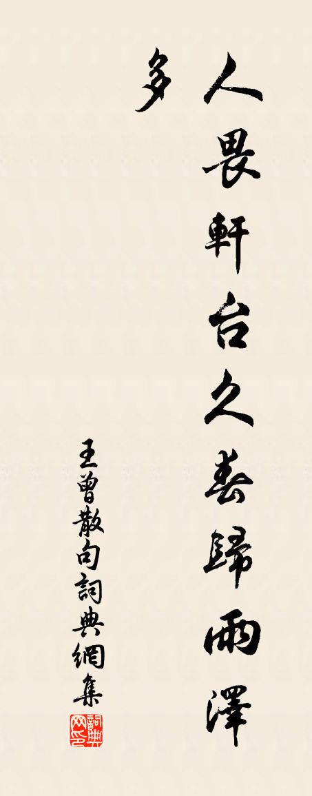 詩詞名句歷史字典書法欣賞書法字典國語詞典說文解字康熙字典古漢語字典標 題 作 者 詩 句 句作者:王曾 朝代:宋代句原文人畏軒台久,春歸雨澤多。詩詞問答問:句的作者是誰?答:王曾問:句寫於哪個朝代?答:宋代王曾句書法欣賞句書法作品詩詞推薦題蕭端虛和樂堂楊萬里〔宋代〕玉笥風回峽山雨,兩公對床方軟語。少公一生吟樣臞,長公半醉少公扶。白頭兄弟不多有,面如橘紅不關酒。紫荊鵲橋仙(鄉守趙計院生日)劉克莊〔宋代〕蒲鞭漸弛,缿筒漸少,安用知他簾外。從今也莫察淵魚,做到不忍欺田地。四民香火,五營笳吹,來獻一杯壽水。端午詞御閣晏殊〔宋代〕雕盤角黍競時宜,組繡風華奉紫闈。海日乍升丹禁曉,艾人晴影照金扉。贈白道者(一作詠史第二首)李商隱〔唐代〕十二樓前再拜辭,靈風正滿碧桃枝。壺中若是有天地,又向壺中傷別離。雨周文璞〔宋代〕雨意遽如許,雲容亦可憐。聲聲總斷續,滴滴更勻圓。道院燒香地,山房焙畫天。故園無恙否,潤色到瓜田。題姜秀郎幾間蘇軾〔宋代〕暗麝著人簪茉莉,紅潮登頰醉檳榔。桐舒岳祥〔宋代〕嶧陽渾璞凱風心,此是姚虞膝上琴。我有全琴元不斲,時攜枕簟臥清陰。寄徐稚山王洋〔宋代〕曾攬軺軒一整冠,江西吏膽至今寒。疲民仰德方為貴,野老言公不似官。身必靜休猶是病,心無揀擇始知安。高情鵲山亭曾鞏〔宋代〕大亭孤起壓城顛,屋角峨峨插紫煙。濼水飛綃來野岸,鵲山浮黛入晴天。少陵騷雅今誰和,東海風流世謾傳。太守吳王古宮井二首羅鄴〔唐代〕古宮荒井曾平後,見說耕人又鑿開。拾得玉釵鐫敕字,當時恩澤賜誰來。含青薜荔隨金甃,碧砌磷磷生綠苔。莫言勉謝自明楊時〔宋代〕少年力學志須強,得失由來一夢長。試問邯鄲欹枕客,人間幾度熟黃粱。西江月(丙午冬至)吳文英〔宋代〕添線繡床人倦,翻香羅幕煙斜。五更簫鼓貴人家。門外曉寒嘶馬。帽壓半檐朝雪,鏡開千靨春霞。小簾沽酒看梅花錢江陰輓詞樓鑰〔宋代〕庾嶺梅花暖,賢侯惠愛深。精神雖滿腹,撫字亦勞心。九轉竟難遇,二毛何遽侵。傷哉東逝水,無復大江陰。次韻因老見贈王之道〔宋代〕扁舟歷陽來,訪君得少息。登堂默無語,見老稱目擊。去年糝江上,群盜羅劍戟。君時濡須游,入山笑相揖。肩擔皇華館以上巳落因修禊事題詩紀之王之望〔宋代〕泉上新台紫翠環,暮春修禊俯潺湲。漢流尚帶桃花水,雲氣初披杏子山。柳絮輕揚晴日暖,竹光不動午陰閒。時和瑞鶴仙(友人買妾名雪香)蔣捷〔宋代〕素肌元是雪。向雪裡帶香,更添奇絕。梅花太孤潔。問梨花何似,風標難識。長洲漾楫。料鴛邊、嬌容乍折。對珠重次林守韻並闌臞軒二首劉克莊〔宋代〕晨坐黃堂夕未歸,偶然閉閣句尤奇。頗知韋守臨蘇郡,不省山公到習池。燒尾且陪攀桂集,遨頭別有探梅期。自慚金賢良薛師石〔宋代〕虛號賢良豈療飢,短衣結袖竟何為。空攜痛哭能言策,不遇勤求下詔時。老去說詩猶有味,寒業索酒莫教遲。家貧送吳中復守長沙郭獬〔宋代〕初登西漢文章府,便領吳王第一州。繞郭白雲衡岳近,滿帆明月洞庭秋。題李國博東園何異〔宋代〕東園吟思玉蟾清,園客開門古意生。冰硯雲燈深洞宇,春花秋草舊宮城。人藏密樹尋聲見,鷺下寒池照影驚。三十名句推薦出不入兮往不反,平原忽兮路超遠。屈原《國殤》 清夜何湛湛,孤燭映蘭幕。江淹《銅爵妓》 艷妝臨水最相宜。風來吹繡漪。吳文英《醉桃源·芙蓉》 誰教歲歲紅蓮夜,兩處沉吟各自知。姜夔《鷓鴣天·元夕有所夢》 日斜江上孤帆影,草綠湖南萬里情。劉長卿《別嚴士元》 碧水驚秋,黃雲凝暮,敗葉零亂空階。秦觀《滿庭芳·碧水驚秋》 懷舊空吟聞笛賦,到鄉翻似爛柯人。劉禹錫《酬樂天揚州初逢席上見贈》 燈火萬家城四畔,星河一道水中央。白居易《江樓夕望招客》 好時節,願得年年,常見中秋月。徐有貞《中秋月·中秋月》 越女新妝出鏡心,自知明艷更沉吟。張籍《酬朱慶餘》