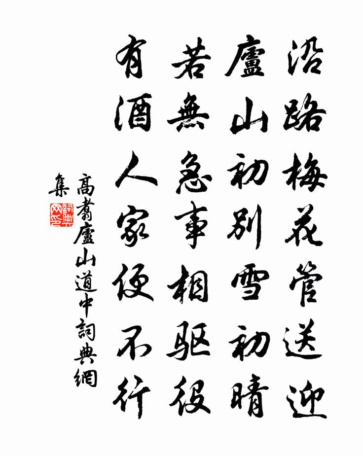 詩詞名句歷史字典書法欣賞書法字典國語詞典說文解字康熙字典古漢語字典標 題 作 者 詩 句 廬山道中作者:高翥 朝代:宋代廬山道中原文沿路梅花管送迎,廬山初別雪初晴。若無急事相驅役,有酒人家便不行。詩詞問答問:廬山道中的作者是誰?答:高翥問:廬山道中寫於哪個朝代?答:宋代高翥廬山道中書法欣賞廬山道中書法作品詩詞推薦摸魚兒吳潛〔宋代〕滿園林、瘦紅肥綠,休休春事無幾。杜鵑喚起三更夢,窗外露澄風細。渾不寐。但目看、一簾夜月移花未。推衾自送別蕭二陳翊〔唐代〕橘花香覆白蘋洲,江引輕帆入遠遊。千里雲天風雨夕,憶君不敢再登樓。送章氏兄弟兼寄金山寧禪師陳師道〔宋代〕末塗一過馬群空,老眼雙瞻碣石鴻。固有江東兼渭北,其如明月與清風。一官羈絆吾堪老,萬里嫖姚子未窮。寄語夏日韓偓〔唐代〕庭樹新陰葉未成,玉階人靜一蟬聲。相風不動烏龍睡,時有嬌鶯自喚名。菊花董嗣杲〔宋代〕籬東佳友手曾刪,莫把南山醒眼看。荒徑可供元亮采,落英惟許屈平餐。艷鍾金氣中分晚,香裊清霜獨傲寒。誰插謝文思許尚之石函廣陵散譜樓鑰〔宋代〕叔夜千載人,生也當晉魏。君卑巨寖強,駸駸司馬氏。幽憤無所洩,舒寫向桐梓。慢商與宮同,慘痛聲足備。規橅早炊新林望見鍾山楊萬里〔宋代〕辭奉鍾山一月前,如何知我北歸軒。不通姓字殷懃甚,忽到新林野店邊。染雲王安石〔宋代〕染云為柳葉,剪水作梨花。不是春風巧,何緣有歲華。鄭待郎輓歌辭司馬光〔宋代〕雲夢氣回復,比肩生俊豪。司農家學富,廷尉里門高。騏驥昔千里,鳳皇今一毛。即丘餘慶在,終應呂虔刀。秋日看雲薛居寶〔宋代〕曉雨沾山路,秋雲看野亭。薄從川上起,低向屋邊停。合處山林白,消來天地青。人生無定跡,不止是浮萍。【般涉調】耍孩兒杜仁傑〔元代〕 * 不識構闌風調雨順民安樂,都不似俺 * 快活。桑蠶五穀十分收,官司無甚差科。當村許還心愿,來到城中買傳言玉女(五月四日孫僉判四昆仲攜具稽古堂觀競渡,有作)郭應祥〔宋代〕稽古堂前,恰見四番端午又來江上,聽鳴鼉急鼓。棹歌才發,漠漠一川煙雨。輕舟搖揚,心掀舞。倦客今年續命,送蕭秘校梅堯臣〔宋代〕比從江南來,又從江南去。孤舟隨雁群,晚泊定何處。霜橙可為齏,冰鱠思下籌。此興吾不知,薄言聊所慕。光陰吟邵雍〔宋代〕三百六旬有六日,光陰過眼如奔輪。周而復始未嘗息,安得四時長似春。夜下征虜亭李白〔唐代〕船下廣陵去,月明徵虜亭。山花如繡頰,江火似流螢。丁寓田家有贈王維〔唐代〕君心印尚棲隱,印久欲傍歸印路。在朝印每為言,解印果成趣。晨雞鳴鄰里,群動從所務。農夫行餉田,閨妾起縫踏莎行(長沙牡丹花極小,戲作此詞,)張孝祥〔宋代〕並以二枝為伯承、欽夫諸兄一觴之薦洛下根株,江南栽種。天香國色千金重。花邊三閣建康春,風前十里揚州夢。訪山庵衛宗武〔宋代〕彌月住山家,晴天物色奢。鶯遷對人語,蜂眾報僧衙。筍老欲成竹,蕙香開遍花。清吟無個事,冉冉送春華。孟傳是攜其長郎北游,余於九江遇之喜贈閻爾梅〔清代〕武昌城下競舟時,恰好相逢正則祠。阻暑聊為無賴飲,游山喜作不情詩。甘陵自昔多君子,江夏於今誦小兒。北去狼山崔敦禮〔宋代〕行攜三尺虎臂杖,歸飲十分魚枕樵。飲罷招船歌一曲,馮夷亦合泣潛綃。名句推薦窈窕淑女,君子好逑。佚名《關雎》 三軍可奪帥也,匹夫不可奪志也。佚名《論語十二章》 流星透疏木,走月逆行雲。賈島《宿山寺》 翻空白鳥時時見,照水紅蕖細細香。蘇軾《鷓鴣天·林斷山明竹隱牆》 利之中取大,害之中取小。墨子《墨子·44章 大取》 林表明霽色,城中增暮寒。祖詠《終南望余雪》 昔時賢文,誨汝諄諄。佚名《增廣賢文·上集》 綠杯紅袖趁重陽。人情似故鄉。晏幾道《阮郎歸·天邊金掌露成霜》 何嘗見明鏡疲於屢照,清流憚於惠風。劉義慶《世說新語·言語》 桃李出深井,花艷驚上春。李白《中山孺子妾歌》