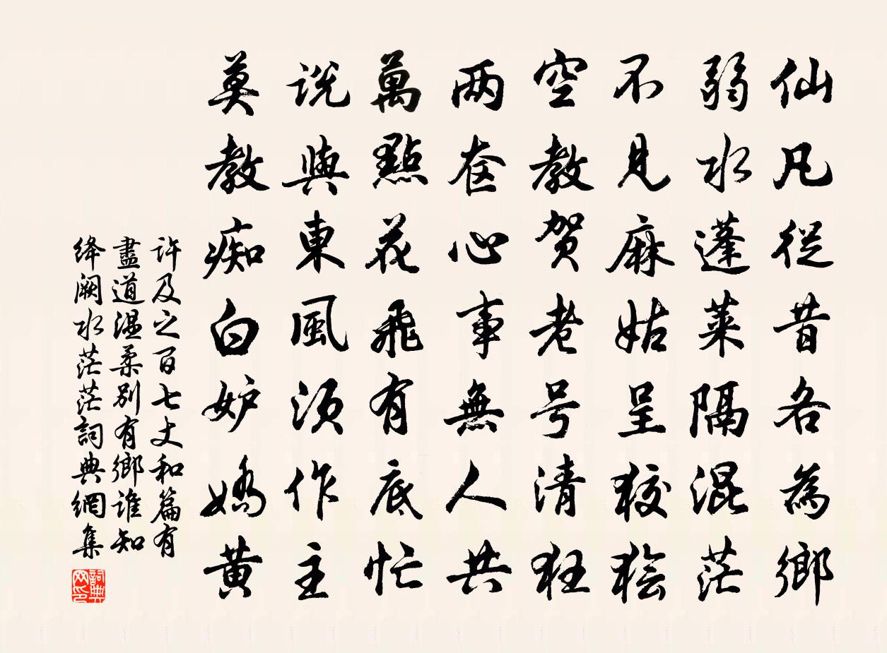 詩詞名句歷史字典書法欣賞書法字典國語詞典說文解字康熙字典古漢語字典標 題 作 者 詩 句 百七丈和篇有盡道溫柔別有鄉誰知絳闕水茫茫作者:許及之 朝代:宋代原文仙凡從昔各為鄉,弱水蓬萊隔混茫。不見麻姑呈狡獪,空教賀老號清狂。兩奩心事無人共,萬點花飛有底忙。說與東風須作主,莫教痴白妒嬌黃。詩詞問答問:《百七丈和篇有盡道溫柔別有鄉誰知絳闕水茫茫》的作者是誰?答:許及之問:該詩寫於哪個朝代?答:宋代書法欣賞百七丈和篇有盡道溫柔別有鄉誰知絳闕水茫茫書法作品詩文賞析【原題】:百七丈和篇有盡道溫柔別有鄉誰知絳闕水茫茫之句意有屬也再用韻奉酬詩詞推薦沁園春 送吳此民江州教本任瓜洲官,前長景張野〔元代〕前日廬山,今日廬山,豈偶然哉。喜青衫舊夢,輕車熟路,白雲清興,翠壁丹崖。石鏡光寒,香爐煙曖,晴雪飛空賈家莊文天祥〔宋代〕行邊無鳥雀,臥處有腥臊。露打鬚眉硬,風搜顴頰高。流離外顛沛,饑渴內煎熬。多少偷生者,孤臣嘆所遭。南海神祠高駢〔唐代〕滄溟八千里,今古畏波濤。此日征南將,安然渡萬艘。疏山三首曾季貍〔宋代〕江南九月未飛霜,木葉蕭蕭已半黃。行遍疏山山下路,滿山唯有桂花香。頌古一百二十一首釋宗杲〔宋代〕楊岐一頭驢,只有三隻腳。潘閬倒騎歸,攧殺黃幡綽。夜坐聯句蘇邁〔宋代〕清風來無邊,明月翳復吐。松聲滿虛空,竹影侵半戶。暗枝有驚鵲,壞壁鳴飢鼠。露葉耿高梧,風螢落空廡。微涼山中獨吟白居易〔唐代〕人各有一癖,我癖在章句。萬緣皆已消,此病獨未去。每逢美風景,或對好親故。高聲詠一篇,恍若與神遇。自為南鄉子(賦十四弦)高觀國〔宋代〕直柱倚冰弦。曾見胡兒馬上彈。卻笑琵琶風韻古,濺濺。想像湘妃水一簾。塞恨曲中傳。兩摺琴絲費玉纖。不似江有鳥褐色而羽如青錦解作諸般語一卒蓄之籠中郭印〔宋代〕錦作雙翰褐作衣,雕籠蓄養亦多時。只緣學得千般語,欲返山林未有期。解語花楊 * 〔宋代〕星橋夜度,火樹宵開,燈月光交射。翠檐銅瓦。相輝映、隱隱絳霞飄下。風流艷雅。向柳陌、纖纖共把。筵宴時、挽尤延之尚書陳傅良〔宋代〕壯歲從游兩鬢霜,重來函太各堪傷。那知卒業今無及,極悔論心昨未嘗。相約歸期須次第,獨存病骨更淒涼。他年離思五首·其四元稹〔唐代〕曾經滄海難為水,除卻巫山不是雲。取次花叢懶回顧,半緣修道半緣君。奉使契丹二十八首其十一奚君蘇轍〔宋代〕奚君五畝宅,封戶一成田。故壘開都邑,遺民雜漢編。不知臣僕賤,漫喜殺生權。燕俗嗟猶在,婚姻未許連。金陵遊覽用劉子明韻戴復古〔宋代〕英雄割據已焉戰,逝水滔滔去不回。里巷難尋王謝宅,江山空對鳳凰台。登臨無伴詩為侶,興廢不知梅自開。同是曲水亭薛映〔宋代〕台盤疏石渠,激流環四面。夏屋有餘清,羽觴隨意轉。賓告醉言歸,主稱情未惓。雖非禊飲辰,豈謝蘭亭讌。禪人並化主寫真求贊釋正覺〔宋代〕白髮星星,骨癯氣清。雪浸山嵂屼,秋在水渟泓。流琥珀兮澗松老,射珊瑚而波月明。影落大千去也,何妨觸處崢端午帖子太上皇帝閣周必大〔宋代〕美景良辰二聖歡,時新絡繹走雕盤。固應慈孝移風俗,安用梟羹賜百官。與夏侯繹張唐民游蜀岡大明寺梅堯臣〔宋代〕秋葉已多蠹,古原看更荒。廢城無馬入,破冢有孤藏。寒日稍清迥,寒山分漭蒼。田衣指白水,此下是雷塘。關參議劉仲洪就京制置辟入蜀二首曾豐〔宋代〕蜀屈嚴公子,先聲到處驚。幕中添老杜,關外得長城。渭上屯田便,山西買馬平。願言賓與主,無立小功名。李郎中輓詞二首范成大〔宋代〕憶昔單畫使,惟君勇輔行。馬隤招共載,羝乳約同盟。老去長懷舊,悲來遽隔生。故人凋落盡,衰涕不勝橫。名句推薦清夜何湛湛,孤燭映蘭幕。江淹《銅爵妓》 醉月頻中聖,迷花不事君李白《贈孟浩然》 因思杜陵夢,鳧雁滿回塘。溫庭筠《商山早行》 槐葉初勻日氣涼,蔥蔥鼠耳翠成雙。范成大《夏日田園雜興》 他年我若為青帝,報與桃花一處開。黃巢《題菊花》 君埋泉下泥銷骨,我寄人間雪滿頭。白居易《夢微之》 福在積善,禍在積惡。黃石公《素書·安禮》 相逢不盡平生事,春思入琵琶。劉迎《烏夜啼·離恨遠縈楊柳》 王濬樓船下益州,金陵王氣黯然收。劉禹錫《西塞山懷古》 秋至搗羅紈,淚滿未能開。江淹《悼室人》