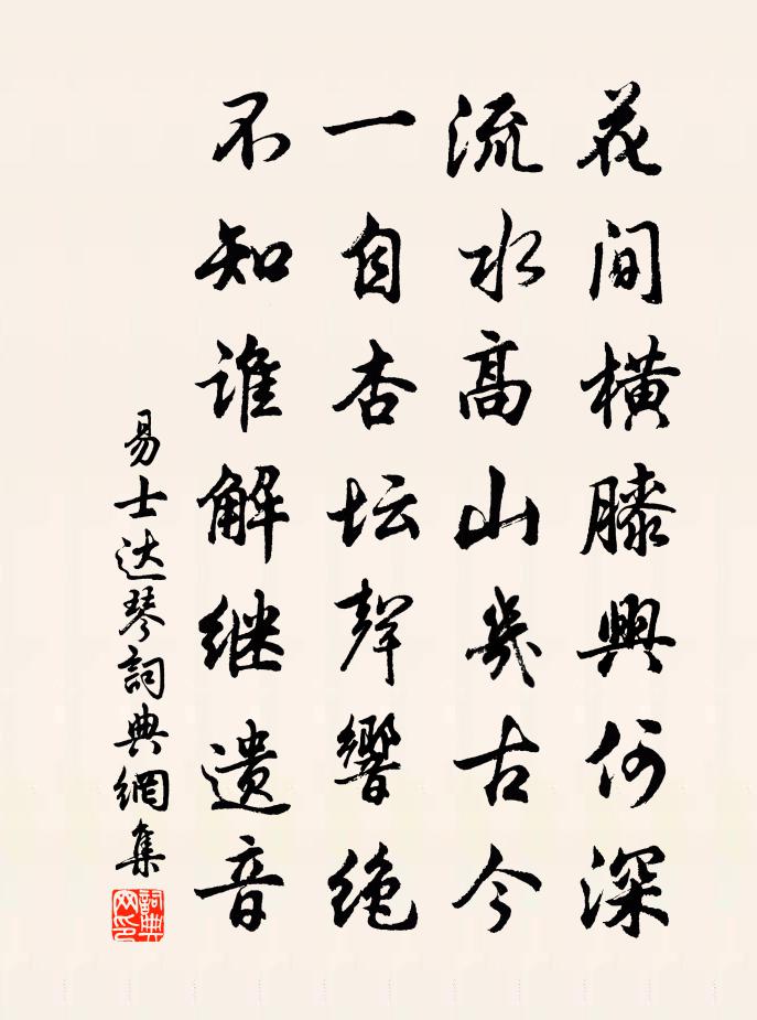 詩詞名句歷史字典書法欣賞書法字典國語詞典說文解字康熙字典古漢語字典標 題 作 者 詩 句 琴作者:易士達 朝代:宋代琴原文花間橫膝興何深,流水高山幾古今。一自杏壇聲響絕,不知誰解繼遺音。詩詞問答問:琴的作者是誰?答:易士達問:琴寫於哪個朝代?答:宋代易士達琴書法欣賞琴書法作品詩詞推薦清平樂吳則禮〔宋代〕雪余寒退。惟有青松在。春不加榮寒不悴。用舍如公都耐。流肪磊落龜蛇。會留紅日西斜。欲助我公壽骨,蟠桃等睡起已亭午終日涼甚有賦陸游〔宋代〕飯罷頹然付一床,曠懷真足傲羲皇。松棚盡日常如暮,荷沼無風亦自香。倚杖月生人影瘦,岸巾露透髮根涼。頗聞次韻石七三六言七首黃庭堅〔宋代〕萬里草荒先壟,六年蟲蠹群經。老喜寬恩放去,心似驚波不停。雜詠一百首孔光劉克莊〔宋代〕佞幸傳呼至,師臣傴僂迎。暮年靈壽杖,幸自可扶行。和秀實扉字韻王洋〔宋代〕柴車朝出暮柴扉,麋鹿情通麋鹿知。寓目每因思舊約,破顏時幸讀新詩。妻兒債負真冤境,祖佛因緣即妙醫。救火賢者之孝二百四十首石建林同〔宋代〕服勞曾是孝,那更委諸人。建已老白首,中裙滌必親。又登碧雲亭感懷三十首吳芾〔宋代〕晚上危亭避鬱蒸,風生兩腋覺身輕。更籌只是催歸去,不到城頭月未生。浣溪沙(焦油)王千秋〔宋代〕買市宣和預賞時。流蘇垂蓋寶燈圍。小鐺烹玉鼓聲隨。金彈玲瓏今夕是,鰲山縹緲昔游非。馬行遺老想沾衣。題可翁塔丘葵〔宋代〕至人埋骨地,草木總皆玄。未臘梅先覺,無風竹亦禪。燈緣千載焰,名共四松傳。舊日經行處,瓶盂常儼然。水陽精舍曹邍〔宋代〕塔高鈴自語,碑斷蘇成文。老樹擎涼月,初荷卷濕雲。螢飛臨水見,犬吠隔籬聞。靜對高僧坐,無眠到夜分。晨炊江山懸驛楊萬里〔宋代〕聞道常山水壯哉,問途何惜小紆迴。平生不到江山縣,臨老須教作一來。郊廟歌辭。祀九宮貴神樂章。肅和佚名〔唐代〕歌工既奏,神位既秩。天符眾星,運行太一。聲和十管,氣應中律。肅肅明廷,介茲元吉。游天竺二首仇遠〔宋代〕行遍山巔又水涯,尚無紅葉與黃花。長松夾道六七里,小墅通村十數家。竺國雲深僧寂寞,草堂洞古石嵯牙。野翁煮茗台汪任〔宋代〕石梯千級杖藜行,行到山腰足暫停。旋汲靈泉煮佳茗,渴心滋潤困魔醒。游梅竹王洋〔宋代〕汗肩擔上碧參差,陽脈初興趁嫩移。山路莫辭行力遠,清風隨步不相離。夏末野興陸游〔宋代〕漠漠川雲闔復開,天公試手挽秋回。參差小市林邊出,縹緲疏鍾雨外來。土塯飯香供晚餉,布簾字大賣新醅。歸舟寄遠李頻〔唐代〕槐欲成陰分袂時,君期十日復金扉。槐今落葉已將盡,君向遠鄉猶未歸。化石早曾聞節婦,沉湘何必獨靈妃。須知攜稚幼看桃花王洋〔宋代〕人面看花花笑人,春風吹絮絮催春。韶華雖好多頭緒,何似秋空不受塵。摸魚子許有孚〔元代〕買陂塘旋栽楊柳,平章風月專務。歸來溫樹無人問,但聽四窗荷雨。圓作渚。準擬似、神仙瀛海煙波嶼。憑闌獨語貞元十四年旱甚,見權門移芍藥花呂溫〔唐代〕綠原青壟漸成塵,汲井開園日日新。四月帶花移芍藥,不知憂國是何人。名句推薦政之於民,過急則 刻薄,傷緩則弛慢。令狐德棻《周書·列傳·卷四十五》 歸師勿遏,古人畏之,死地兵不可輕 也。李大師、李延壽《南史·列傳·卷二十五》 江上幾人在,天涯孤棹還。溫庭筠《送人東遊》 今何許。憑闌懷古。殘柳參差舞。姜夔《點絳唇·丁未冬過吳松作》 九日黃花酒,登高會昔聞。岑參《奉陪封大夫九日登高》 余亦赴京國,何當獻凱還。孟浩然《送陳七赴西軍》 正江令恨別,庾信愁賦劉辰翁《蘭陵王·丙子送春》 千里稻花應秀色,五更桐葉最佳音。曾幾《蘇秀道中》 他鄉逢七夕,旅館益羈愁。孟浩然《他鄉七夕》 君者,舟也;庶人者,水也。水則載舟,水則覆舟。荀子《荀子·哀公》