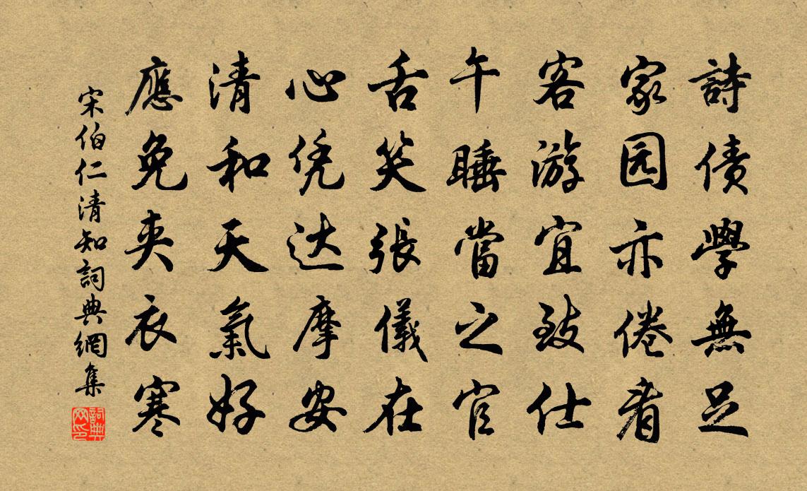 詩詞名句歷史字典書法欣賞書法字典國語詞典說文解字康熙字典古漢語字典標 題 作 者 詩 句 清知作者:宋伯仁 朝代:宋代清知原文詩債學無足,家園亦倦看。客游宜致仕,午睡當之官。舌笑張儀在,心憑達摩安。清和天氣好,應免袷衣寒。詩詞問答問:清知的作者是誰?答:宋伯仁問:清知寫於哪個朝代?答:宋代宋伯仁清知書法欣賞清知書法作品詩詞推薦玉丁謂〔宋代〕誰負連城美,須思韞櫝藏。輝山知稟異,被褐喻韜光。呂釣時終至,虞求禍是防。寧為田父棄,莫作楚人傷。次張義立登九頂三絕大像洪咨夔〔宋代〕坐斷江山現法身,大光明裹萬波旬。東風歸棹津頭過,同是慈航得度人。溪庵十首劉克莊〔宋代〕昔美少年今老黧,雲林深處葺幽棲。空房安得登伽女,同穴惟應法喜妻。堯桀兩忘何足辨,彭殤俱盡不須齊。靈山山中戲問韋侍御白居易〔唐代〕我抱棲雲志,君懷濟世才。常吟反招隱,那得入山來?謝總講師惠桂花黃庚〔宋代〕廣寒世界仙家種,金粟如來佛國花。多謝高人分惠我,一枝和月到山家。和顏長官百詠邊庭朱繼芳〔宋代〕公主琵琶胡地秋,將軍刁斗漢關愁。相逢老病無依卒,未說沙場淚已流。送范少約二首項安世〔宋代〕高低互騰凌,先後更唱和。密密驕有餘,斜斜困無奈。翔空久未集,到地期不墮。雲惜暗遮圍,風欺惡掀簸。林光偈二首釋曇玩〔宋代〕我無長處名虛出,謝汝殷勤特地來。明因無法堪分付,謾把山門為汝開。吳正仲謫官得故人寄蟹以詩謝之餘次其韻王安石〔宋代〕越客上荊舠,秋風憶把螯。故煩分巨跪,持用佐清糟。飲量寬滄海,詩鋒捷孟勞。甘餐飽觴詠,餘事付鈞陶。評花舒岳祥〔宋代〕我欣牟{上艹右含}重,君喜菜花黃。露浥虀菹味,風搖餅鉺香。均為資食品,作可少羹湯。若論充冬蓄,何如續子駿運使八詠堂竹軒文同〔宋代〕此景絕可愛,叢筠挺修竿。侵簾復映幌,悴影何檀樂。霜威忌晚秀,雨氣矜晴寒。每向極靜時,幽禽發清彈。自無初到江州寄翰林張李杜三學士白居易〔唐代〕早攀霄漢上天衢,晚落風波委世途。雨露施恩無厚薄,蓬蒿隨分有榮枯。傷禽側翅驚弓箭,老婦低顏事舅姑。碧落鳳皇台柴望〔宋代〕灑盡梧桐酒一杯,興亡前事獨徘徊。烏衣冉冉斜陽下,白鷺茫茫江水來。鳳去不知經幾載,客來惟只見高台。閒於菩薩蠻李真人〔元代〕還丹根蒂將何作。須憑金火相銷鑠。金火得長生。方成夫與妻。夫妻情重重。共隱真人洞。真洞約回期。天符來便頌二首釋慧南〔宋代〕傑出業林是趙州,老婆勘破有來由。而今四海清如鏡,行人莫與路為仇。石過青渠壁間有何人者詩欲梓潼神君戒殺以從李石〔宋代〕香茗粗蔬肯破慳,相公日食萬羊山。夫君何厚神何薄,自取懸鶉一水間。寄蔣二十四唐彥謙〔唐代〕鳥囀蜂飛日漸長,旅人情味悔思量。禪門澹薄無心地,世事生疏欲面牆。二月雲煙迷柳色,九衢風土帶花香。大知懷舊詩傷謝朓沈約〔南北朝〕吏部信才傑,文峰振奇響。調與金石諧,思逐風雲上。豈言陵霜質,忽隨人事往。尺璧爾何冤,一旦同丘壤。陳庭堅聘君挽章二章呂祖謙〔宋代〕沙尾三家市,人聲半米鹽。悠然搔短髮,忽此見長髯。觴詠歡初合,溪山氣已添。豐城埋劍夜,太史定先占。行住坐臥三十二頌釋印肅〔宋代〕靈源車轍顯來由,一粒穿時快疾收。莫待廬陵高索價,臨機下口卒難酬。名句推薦天變不足畏,祖宗不足法,人言不足恤。脫脫《宋史·列傳·卷八十六》 今日斗酒會,明旦溝水頭。卓文君《白頭吟》 前村深雪裡,昨夜一枝開。齊己《早梅》 以子之矛,陷子之盾韓非及後人《韓非子·難一》 天下從事者,不可以無法儀。無法儀而其事能成者,無有。墨子《墨子·04章 法儀》 老柘葉黃如嫩樹,寒櫻枝白是狂花。白居易《早冬》 握手一長嘆,淚為生別滋蘇武《留別妻》 反者道之動;弱者道之用。老子《老子·德經·第四十章》 霸圖今已矣,驅馬復歸來。陳子昂《燕昭王》 私行勝,則少公功。韓非及後人《韓非子·外儲說左下》