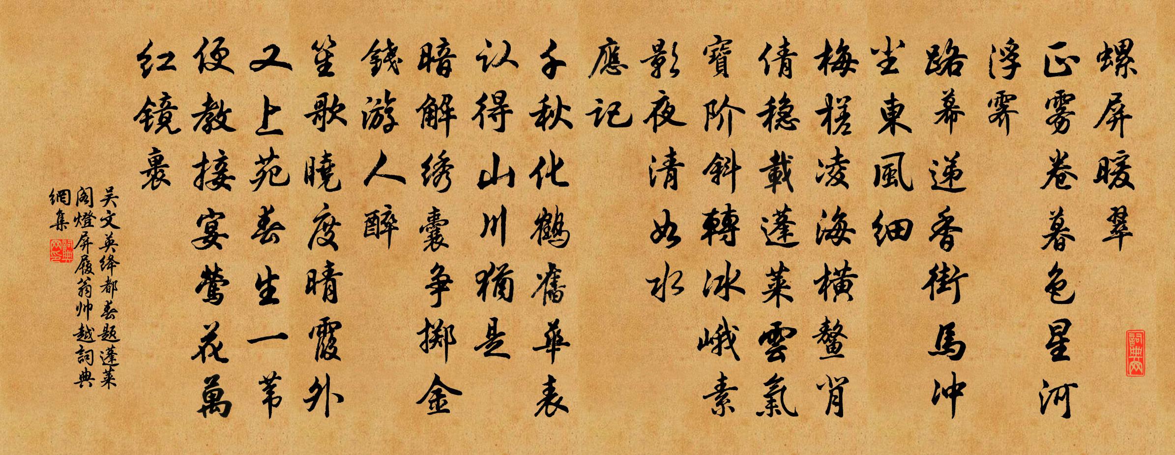 “螺屏”三句,敘述觀賞燈屏及點明時間。此言蓬萊閣中的燈屏用翠綠色的螺鈿鑲嵌而成,當暮靄沉沉,晴空中星河閃爍之時,燈屏中就會點燃燭光,用以招徠人們前去觀賞。“路幕”四句,描述燈屏中的風景。此言燈屏上畫著路障螢幕,有人正在供香相迎;又有一隊開路的馬隊,塵土蔽空順風而來。而畫中的蓬萊閣好像就是海上仙山浮載在鰲背上一般,景色美妙而且仙氣飄逸。四句也從暗中點出了“履翁帥越”之意。“寶階”三句,述閣外的夜景。此言天上的北斗星像傾斜的街階一樣開始向西傾轉,月光明亮,夜空中清靜如水。上片描述屏中畫景及記述閣外的夜景。