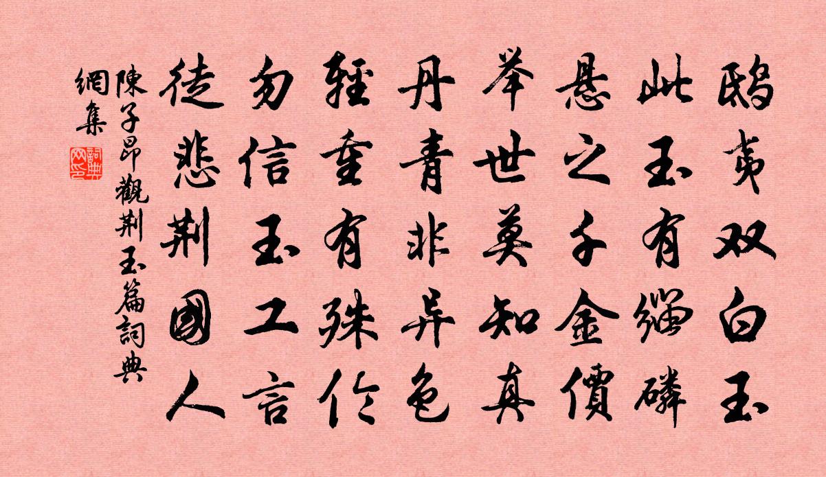 詩詞名句歷史字典書法欣賞書法字典國語詞典說文解字康熙字典古漢語字典標 題 作 者 詩 句 觀荊玉篇作者:陳子昂 朝代:唐代觀荊玉篇原文鴟夷雙白玉,此玉有緇磷。懸之千金價,舉世莫知真。丹青非異色,輕重有殊倫。勿信玉工言,徒悲荊國人。詩詞問答問:觀荊玉篇的作者是誰?答:陳子昂問:觀荊玉篇寫於哪個朝代?答:唐代問:陳子昂的名句有哪些?答:陳子昂名句大全陳子昂觀荊玉篇書法欣賞觀荊玉篇書法作品詩詞推薦東林寺晚步董嗣杲〔宋代〕天地聚奇觀,山林負隱名。月明僧影瘦,風定水聲清。不覺忘身世,何須問死生。有詩難舉似,真實避時英。江城子(和默軒初度韻)劉辰翁〔宋代〕書題拂拂洞庭香。孕雲黃。粲珠光。喚謫仙人,除是賀知章。未老得閒閒到老,無一事,和詩忙。是中曾著老人雙秋曉出郊二絕句楊萬里〔宋代〕野菊相依露下叢,冷香自送水邊風。豐年氣象無多子,只在雞鳴犬吠中。寄趙大資蘇泂〔宋代〕劉向拳拳老更忠,外家恩澤盡侯封。分明社稷蒼生計,只在平居畎畝中。玉梁道中雜詠羅與之〔宋代〕峭壁圍莽蒼,荒蹊人削跡。時聞蘆葦叢,野鳥話岑寂。浮生雖有涯,幽討當無極。御風獨長嘯,此心謝鞿馽。使南海道長沙,題道林嶽麓寺唐扶〔唐代〕道林嶽麓仲與昆,卓犖請從先後論。松根踏雲二千步,始見大屋開三門。泉清或戲蛟龍窟,殿豁數盡高帆掀。即今偈頌十二首釋原妙〔宋代〕一二三四,四三二一。鉤鎖連環,銀山鐵壁。覷得破,跳得出。大千沙界海上漚,一切聖賢如電拂。若是覷不破不覽鏡見白髮數莖光鮮特異權德輿〔唐代〕秋來皎潔白須光,試脫朝簪學酒狂。一曲酣歌還自樂,兒孫嬉笑挽衣裳。贈譚倚白玉蟾〔宋代〕丹山金鸑鷟,絳闕玉麒麟。氣宇秋潭月,文章閬苑春。青雲露如掌,策騎上龍津。雲岑姜特立〔宋代〕雲岑抱秋陰,水木起夜色。原野漸蕭條,田禾卷阡陌。題耿處士林亭喻坦之〔唐代〕身向閒中老,生涯本豁然。草堂山水下,漁艇鳥花邊。窺井猿兼鹿,啼林鳥雜蟬。何時人事了,依此亦高眠。壽樓歐陽修〔宋代〕碧瓦照日生青煙,誰家高樓當道邊。昨日丁丁斤且斲,今朝朱欄橫翠幕。主人起樓何太高,欲夸富力壓群豪。樓中添藏經施主水陸升座說偈釋心月〔宋代〕大悲心上流出底,呼為切腳若為評。不知切腳什麼字,寫不成兮呼不成。依依稀稀如半月,髣髣髴髴若三星。分付罪所留系,每夜聞長洲軍笛聲劉長卿〔唐代〕白日浮雲閉不開,黃沙誰問冶長猜。只憐橫笛關山月,知處愁人夜夜來。露坐陸游〔宋代〕旋削甘瓜進酒卮,斷雲漠漠斗離離。北臨積水風來壯,東恨長林月上遲。秋近不堪聞急杵,夜涼已復怯輕絺。天孫樓與善寺丞輓詩二首釋寶曇〔宋代〕翰墨今詞伯,規模古吏師。哭親聲未斷,拊枕夢何之。白首侵書幌,青燈耿繐帷。傷心故園路,雲物不勝悲。趙和宗輓詩三首曹彥約〔宋代〕三桂先猷遠,公來應瑞芝。子能傳世業,令欲偏孫枝。笏盛床應滿,端闓橐已持。掛冠猶進秩,天意卜深知。次韻李得善學錄需酒納婦周必大〔宋代〕合好須憑曲米春,分甘那暇問醨醇。遙知北海招嘉客,共賀東床得好姻。薌林五十詠玉井楊萬里〔宋代〕誰言玉井春,不作雙井味。會有眠雲客,領略兩相似。菩薩蠻(十一之六)賀鑄〔宋代〕粉香映葉花羞日。窗間宛轉蜂尋蜜。歡罷捲簾時。玉纖勻面脂。舞裙金斗熨。絳襭鴛鴦密。翠帶一雙垂。索人題艷名句推薦寒日蕭蕭上瑣窗,梧桐應恨夜來霜。李清照《鷓鴣天·寒日蕭蕭上瑣窗》 水何澹澹,山島竦峙曹操《觀滄海》 綴文者情動而辭發,觀文者披文以入情劉勰《文心雕龍·知音》 聞道黃龍戍,頻年不解兵。沈佺期《雜詩三首·其三》 兵起而程敵,政不若者勿與戰;食不若者勿與久;敵眾勿為客;敵盡不如,擊之勿疑。商鞅《商君書·戰法》 小荷才露尖尖角,早有蜻蜓立上頭。楊萬里《小池》 塞雁高飛人未還,一簾風月閒。李煜《長相思·一重山》 慟哭六軍俱縞素,衝冠一怒為紅顏。吳偉業《圓圓曲》 柔情似水,佳期如夢,忍顧鵲橋歸路。秦觀《鵲橋仙·纖雲弄巧》 青山朝別暮還見,嘶馬出門思舊鄉。李頎《送陳章甫》