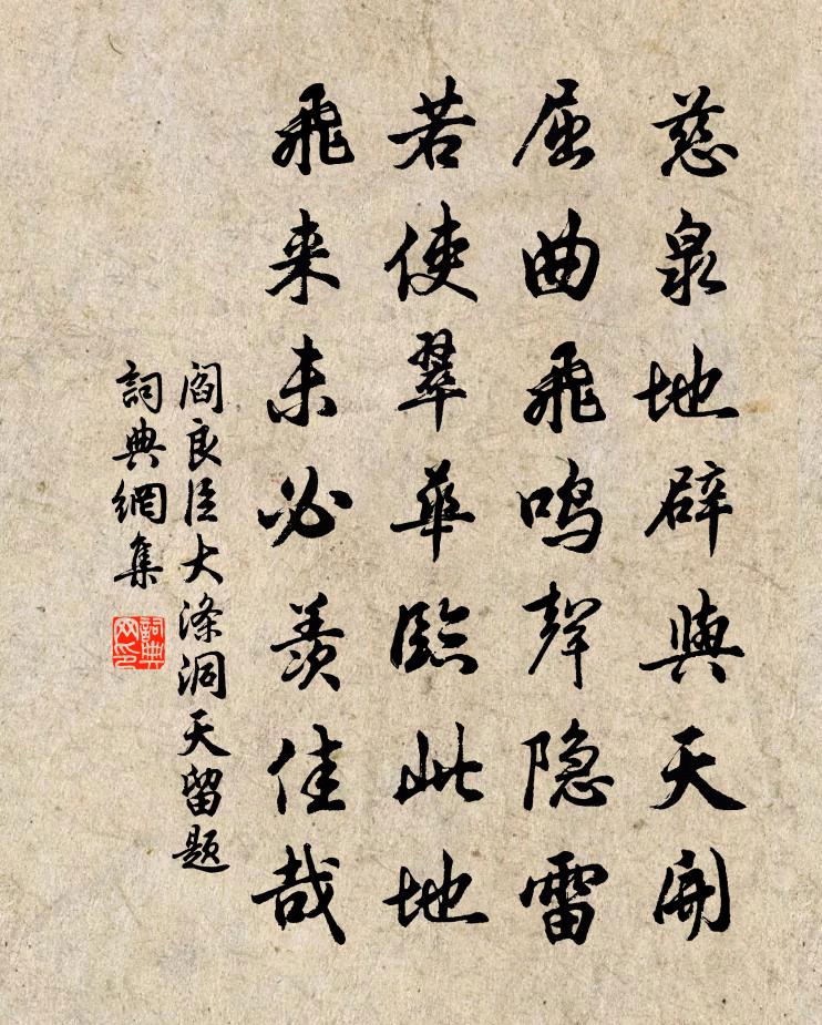 詩詞名句歷史字典書法欣賞書法字典國語詞典說文解字康熙字典古漢語字典標 題 作 者 詩 句 大滌洞天留題作者:閻良臣 朝代:宋代大滌洞天留題原文慈泉地辟與天開,屈曲飛鳴聲隱雷。若使翠華臨此地,飛來未必羨佳哉。詩詞問答問:大滌洞天留題的作者是誰?答:閻良臣問:大滌洞天留題寫於哪個朝代?答:宋代閻良臣大滌洞天留題書法欣賞大滌洞天留題書法作品詩詞推薦滿江紅 和郭子敬夏日村居韻許有壬〔元代〕一曲清溪,收拾盡、風聲月色。還自笑、六旬將近,數椽方葺。已分封侯非燕頷,盡教有地爭蝸角。算人生、難得玲瓏四犯譚宣子〔宋代〕碧黯塞榆,黃銷堤柳,危欄誰料重撫。才情猶未減,指點驚如許。當時共伊東顧。為辭家、怕吟鸚鵡。袞袞波光,除夕諭鈴下兩絕句項安世〔宋代〕莫將新歲便為新,彩仗春幡不動陳。未轉東風猶是臘,明朝賀歲莫通賓。晴雲宋祁〔宋代〕春空無際碧,雲意靜悠悠。盡日隨風馭,迎昏抱月鉤。正宜銜迥隴,強欲蔽層樓。宋野何須問,鴻蒙正掉頭。挽端州黃大用大用喜讀書有志行數過予講討雖胡寅〔宋代〕每惜南冠懶讀書,欣逢之子富三餘。文章戶牖雖頻闖,師友源充或未疏。底事箇中紛侘傺,坐教淫末費驅除。昭昭挽劉實齋尚書陳杰〔宋代〕玉節江湖晚,油幢嶺海春。一朝晉遺老,千古漢名臣。清 * 壺操,尊光紫府身。全歸公不憾,愁絕奠芻人。情詩其八倉央嘉措〔清代〕暗香襲處佩環鳴,美眸善睞未分明。臨去莞爾還一笑,忽與余兮兩目成。春帖子詞夫人閣十首宋祁〔宋代〕銀闕崔嵬對未央,春來始覺好年光。風生禁苑無窮麗,日向仙壺一倍長。送盧郎中除杭州赴任岑參〔唐代〕罷起郎官草,初分刺史符。海雲迎過楚,江月引歸吳。城底濤聲震,樓端蜃氣孤。千家窺驛舫,五馬飲春湖。柳色讀文山集林景熙〔宋代〕黑風夜撼天柱折,萬里飛塵九溟竭。誰欲扶之兩腕絕,英淚浪浪滿襟血。龍庭戈鋋爛如雪,孤臣生死早已決。綱常衡州送李十一兵曹赴浙東呂溫〔唐代〕慷慨視別劍,淒清泛離琴。前程楚塞斷,此恨洞庭深。文字已久廢,循良非所任。期君碧雲上,千里一揚音。同舍弟佶、班、韋二員外秋苔對之成詠包何〔唐代〕每看苔蘚色,如向簿書閒。幽思纏芳樹,高情寄遠山。雨痕連地綠,日色出林斑。卻笑興公賦,臨危滑石間。人日出遊湖上十首楊萬里〔宋代〕舊臘緣多雪,新年未有梅。殷懃下天竺,隔水兩株開。紅梅程公許〔宋代〕群仙遙夜倚欄時,東閣詩成一段奇。休遣北人輕辨認,杏繁較似乏清姿。四月旦大雨晝夜不止者兩日微水一夕暴漲張嵲〔宋代〕山木綠陰暗,駭雲當晝繁。驚風乍掩冉,積雨連荒村。映岫若銀竹,瀉澗如翻盆。懸霤遂及旦,暗空還至昏。長川解語花(吳子云家姬,號愛菊,善歌舞,忽有朝雲之感,作此以寄。)張炎〔宋代〕行歌趁月,喚酒延秋,多買鶯鶯笑。蕊枝嬌小。渾無奈、一掬醉鄉懷抱。籌花鬥草。幾曾放、好春閒了。芳意闌,熱方岳〔宋代〕脫巾無計避炎熇,安得長風上泬寥。自浴寒泉眉子硯,時澆蒼石膽瓶蕉。老來轉覺身為累,貧甚豈為山可樵。坐想小春聞提壺鳥戲成舒岳祥〔宋代〕越鳥憂兄行不得,蜀禽勸客不如歸。何如聽此提壺語,美酒沽來總息機。山行即事二首黃公度〔宋代〕席改尊猶在,心閒屐自遲。角貼欹短樹,風帶罥疏籬。作難憂胡羯,全生混野麋。晚來幽意愜,歸路恐多岐。過梅里七首家…今列題於後。憶西湖雙鸂鶒(效鮑明遠)李紳〔唐代〕雙鸂鶒,錦毛斕斑長比翼。戲繞蓮叢回錦臆,照灼花叢兩相得。漁歌驚起飛南北,繚繞追隨不迷惑。雲間上下同棲名句推薦風一更,雪一更,聒碎鄉心夢不成,故園無此聲。納蘭性德《長相思·山一程》 料想故園桃李,也應怨月愁風趙崇《清平樂·懷人》 水至清則無魚,人至察則無徒。班固《漢書·傳·東方朔傳》 纖雲弄巧,飛星傳恨,銀漢迢迢暗度。秦觀《鵲橋仙·纖雲弄巧》 江皋樓觀前朝寺,秋色入秦淮。徐再思《人月圓·甘露懷古》 以欲從人者昌,以人樂己者亡。吳兢《貞觀政要·卷六·論儉約》 悲霜雪之俱下兮,聽潮水之相擊。屈原《九章》 村北村南布穀忙,村前村後稻花香。方向《詠儋耳二首》 治國常富,而亂國常貧。管仲《管子·治國》 去年今日關山路,細雨梅花正斷魂。蘇軾《正月二十日往岐亭郡人潘古郭三人送余於女王城東禪莊院》