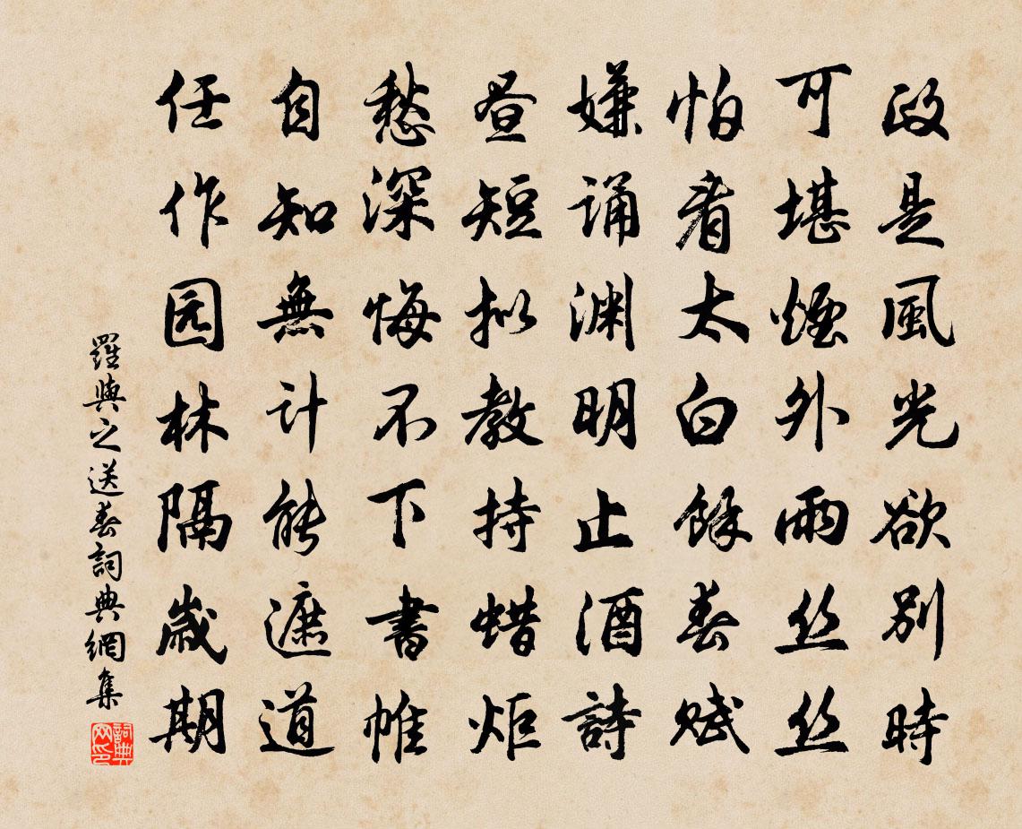 詩詞名句歷史字典書法欣賞書法字典國語詞典說文解字康熙字典古漢語字典標 題 作 者 詩 句 送春作者:羅與之 朝代:宋代送春原文政是風光欲別時,可堪煙外雨絲絲。怕看太白余春賦,嫌誦淵明止酒詩。晝短擬教持蠟炬,愁深悔不下書帷。自知無計能遮道,任作園林隔歲期。詩詞問答問:送春的作者是誰?答:羅與之問:送春寫於哪個朝代?答:宋代羅與之送春書法欣賞送春書法作品詩詞推薦山中夜坐林一龍〔宋代〕寒灘遠嘶月,遺響到岩壁。悠悠千古心,悄悄一卷易。燈微夜氣分,星冷山露滴。危坐獨何為,人間睡方黑。同楊公濟賦破山得開字強至〔宋代〕無物終天地,青山豈免開。萬人鑱秀骨,一氣失全胚。漫貯崇朝雨,猶防浩劫灰。何年巨靈手,曾此擘崔嵬。此心過酬韻張埴〔宋代〕雨余玉帶已浮杯,未辦龐眉一笑陪。春向五更拋我去,君從何處看花來。商丘大夏三十魄,白水青松大小回。此去生查子蔡伸〔宋代〕銀缸委墜紅,碧鎖朦朧曉。別淚灑金徽,一曲情多少。郵亭今夜長,明月香幃悄。縱使夢相逢,何處尋蓬島。偶成蕭元之〔宋代〕拋卻滄江事遠遊,獨攜弓劍上邊頭。群胡忽遁陰山北,欲渡河冰不自由。簡朱乾叔諸友陸九淵〔宋代〕利名風浪日相催,青眼難於世上開。何事諸君冒艱險,杖藜來入白雲堆。題趙松雲竹石幽蘭仇遠〔宋代〕舊時長見揮毫處,修竹幽蘭取次分。欲把一竿苕水上,鷗波千頃看秋雲。浣溪沙(五之二)秦觀〔宋代〕香靨凝羞一笑開。柳腰如醉肯相挨。日長春困下樓台。照水有情聊整鬢,倚闌無緒更兜鞋。眼邊牽繫懶歸來。游玉笥山鄒登龍〔宋代〕玉笥凌空後,玄都詔吏仙。荒壇深覆草,峭壁響流泉。石洞隨龍蟄,金丹許鶴傳。夜深搗藥鳥,啼破翠微煙。春秋戰國門武公周曇〔唐代〕猛獸來兵只為文,豈宜涼德擬圖尊。君看豹彩蒙麋質,人取無難必不存。上湖閒泛艤舟石函因過下湖小墅林逋〔宋代〕平皋望不極,雲樹遠依依。及向扁舟泊,還尋下瀨歸。青山連石埭,春水入柴扉。多謝提壺鳥,留人到落暉。崇恩太后升袝十四首真宗〔宋代〕[大呂角二奏]羽旌風翔,翠薤飄舉。儼其音徽,登茲位處。笙鏞始奏,合止柷敔。是享是宜,永求伊祜。送外舅杜侍御使陝西自徐州移作晁補之〔宋代〕建隆以來論人物,得士與古相低昂。人才歷數仁祖世,後生嵬瑣無復望。老成寂莫典刑在,杜公玉立映班行。少時題汪季路太傅所藏龍眠陽關圖樓鑰〔宋代〕畫出陽關古別離,蕭疎柳質不勝悲。行人顧嘆離人泣,柳下漁翁總不知。秋懷十首韓元吉〔宋代〕何許砧聲清夢回,丁東猶作佩環猜。捲簾風露涼如水,端為嫦娥向此來。天台曹園高翥〔宋代〕蔡嶺桑麻地,曹家桃李莊。溪流春水滑,梅度晚風香。竹屋解留客,筍輿休俶裝。平生看花法,不學蜜蜂忙。夏日司馬光〔宋代〕窮邊已深夏,氣色耿清秋。鮮旭開山郭,涼煙澹戍樓。兜零烽火息,區脫虜塵收。迨此軍中暇,無妨文雅游。靠布袋看髑髏不開口笑贊釋紹曇〔宋代〕笑不露唇,見不透脫。布袋靠得雖牢,髑髏枯眼再活。若要活奉化,肚腸盡情拈卻。海上顧炎武〔清代〕滿地關河一望哀,徹天烽火照胥台。名王白門江東去,故國降幡海上來。秦望雲空陽鳥散,冶山天遠朔風回。樓船句宋中行〔宋代〕路轉五盤知地遠,鋪名太薄見人情。名句推薦碧山學士焚銀魚,白馬卻走深岩居杜甫《柏學士茅屋》 以天下為沈濁,不可與莊語。莊子《莊子·雜篇·天下》 日月照之何不及此?惟有北風號怒天上來。李白《北風行》 最喜小兒亡賴,溪頭臥剝蓮蓬。辛棄疾《清平樂·村居》 一番桃李花開盡,惟有青青草色齊。曾鞏《城南·雨過橫塘水滿堤》 尋常一樣窗前月,才有梅花便不同。杜耒《寒夜》 鳳凰台上鳳凰游,鳳去台空江自流。李白《登金陵鳳凰台》 父老得書知我在,小軒臨水為君開。蘇軾《送賈訥倅眉》 春色惱人眠不得,月移花影上欄乾。王安石《春夜》 淺把涓涓酒,深憑送此生。杜甫《水檻遣心二首》
