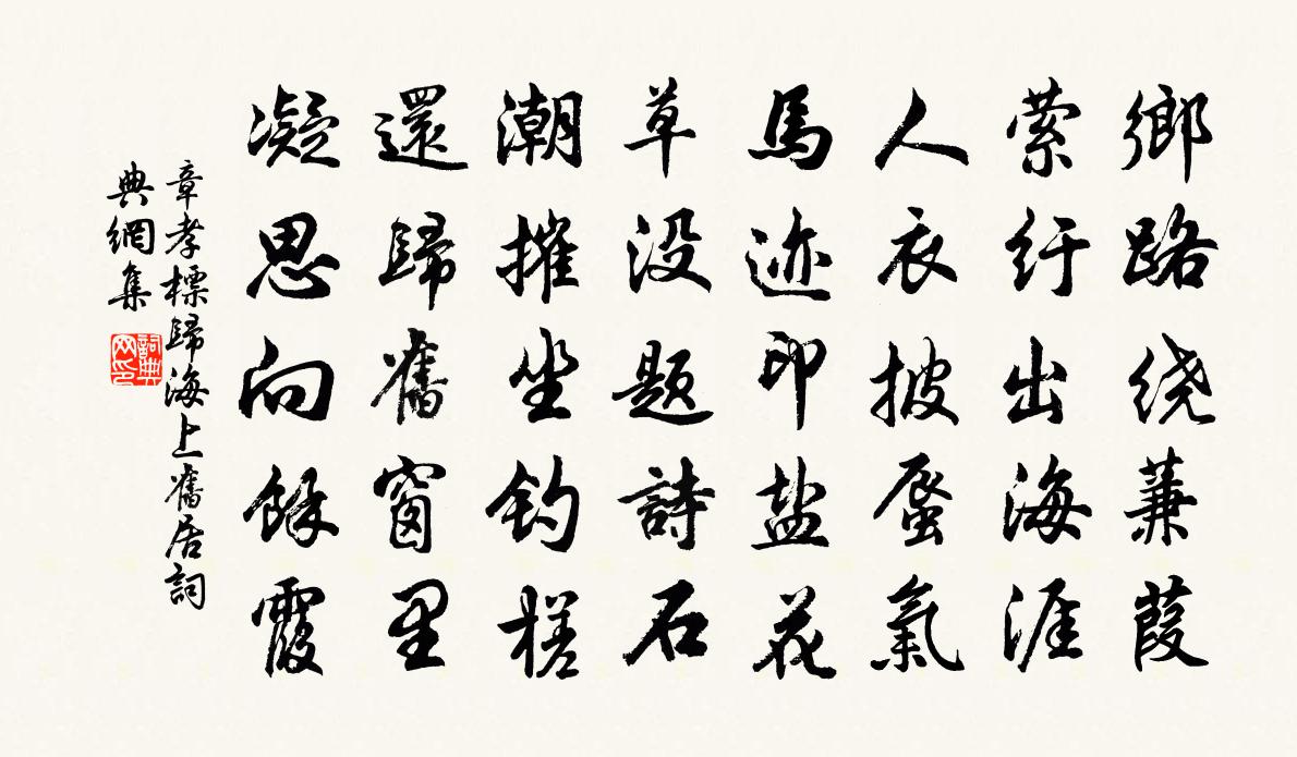 詩詞名句歷史字典書法欣賞書法字典國語詞典說文解字康熙字典古漢語字典標 題 作 者 詩 句 歸海上舊居作者:章孝標 朝代:唐代歸海上舊居原文鄉路繞蒹葭,縈紆出海涯。人衣披蜃氣,馬跡印鹽花。草沒題詩石,潮摧坐釣槎。還歸舊窗里,凝思向餘霞。詩詞問答問:歸海上舊居的作者是誰?答:章孝標問:歸海上舊居寫於哪個朝代?答:唐代問:歸海上舊居是什麼體裁?答:五律章孝標歸海上舊居書法欣賞歸海上舊居書法作品注釋全唐詩:卷506-26詩詞推薦次韻吳伯庸竹間梅花十絕釋紹嵩〔宋代〕孤芳高節共亭亭,子細相看似有情。春色惱人眠不得,移床換枕到天明。東皋十首晁補之〔宋代〕尺五城南未足高,只今小杜更飄颻。暮煙疏雨從君勝,玉子文楸聽我饒。欲附蒲海雲制乾舟歸董嗣杲〔宋代〕江上樓高暝樹連,壯遊空慨禹山川。客中問醉當秋晚,夢裡懷歸在燕先。水送流年遺楚恨,風吹殘雪上吳顛。幾番履道居三首白居易〔唐代〕莫嫌地窄林亭小,莫厭貧家活計微。大有高門鎖寬宅,主人到老不曾歸。東里素帷猶未徹,南鄰丹旐又新懸。衡門核實一首蘇籀〔宋代〕窺見呂臣非奉己,可憐甘茂取宜陽。敢晞激激蘇門嘯,老去悠悠孔里狂。公利噫乎入私帑,濫吹竊爾耗官倉。座銘雨夜排悶陸游〔宋代〕村巷時時雨,江城夜夜砧。沉憂羈客夢,孤憤遠臣心。身病常須藥,囊空未贖琴。明朝鏡中發,飽受雪霜侵。游九鎖山入九鎖山門林景熙〔宋代〕肥馬輕裘到此難,名標九鎖翠微間。天開洞府幾千載,地隔風塵此一關。謝屐空鄰迷雁盪,蘇詩不是夢廬山。他生村居即事晁補之〔宋代〕十載京塵化客衣,故園榆柳識春歸。深村芳物無由覓,蝴蝶雙尋麥隴飛。搗練子馬鈺〔元代〕靈壽杖,獻夫人。撥開世綱易開塵。助行步,出愛津。打有著,拄為親。敲昏琢暗求清神。挑明月,顯至真。古斷腸曲三十首周端臣〔宋代〕花庭梨雪疊香痕,燕子歸來亦斷魂。懊惱一場春不管,月明窗自來黃昏。哭趙州和尚二首王鎔〔唐代〕師離水動王侯,心印光潛麈尾收。碧落霧霾松嶺月,滄溟浪覆濟人舟。一燈乍滅波旬喜,雙眼重昏道侶愁。縱是了題三岩黃登〔宋代〕占斷煙霞老一丘,玉岩閱歷幾春秋。削成四壁開三面,比似他山出一頭。幾欲登臨尋勝概,偶然休沐得佳游。醉磨新年劉筠〔宋代〕病入新年起甲寅,軻心不動五侯春。史曹非據慚書法,袞職無虧濫諍臣。荏苒未除金馬籍,蹣跚空笑玉樓人。窮簷游香社寺趙善括〔宋代〕山水興方逸,塵埃縛暫寬。菜腸甘久素,酒頰助微丹。江闊煙光薄,霜滋葉暈殘。不妨走幽寺,或可叩禪端。舟中二首趙蕃〔宋代〕歲月侵人去若奔,雪消歸水不留痕。詩情本自無多子,深謝江山稍見存。賈節庵冒夏暑越修塗過我苕霅情誼甚厚令聞古牟巘五〔宋代〕君能為置後,此意不可忘。嶢嶢峙頭骨,正好玉其相。踏雲行馬鈺〔元代〕重到興平,廣開言路。驀然興盡思歸去。踏莎行計指長安,願人早早心開悟。貧富由天,子孫陰注。算來分定休思和趙蓮奧劍衛宗武〔宋代〕豈無三尺鐵,巧事犀玉妝。惟君匣中藏,百鍊侔步光。小試鋒莫當,崖石中開張。會須斬奸邪,曄曄神光揚。未遜鬥鵪鶉佚名〔宋代〕木馬釣魚嘶風,我之不然。石人點頭,啞子會言。碧眼胡僧,沒手指天。畫一圈。無所傳。任意咆哮,如釣魚瀉泉公擇失期未至再督以詩趙蕃〔宋代〕作詩有病誰與說,讀書有疑誰與決。思君只在百裡間,底事相望若胡越。阿連報君有來期,候君未至趣以詩。想因名句推薦月出於東山之上,徘徊於鬥牛之間。蘇軾《前赤壁賦》 桂林風景異,秋似洛陽春。宋之問《始安秋日》 安得倚天劍,跨海斬長鯨。李白《臨江王節士歌》 聖人以智籠群愚,亦猶狙公之以智籠眾狙也。名實不虧,使其喜怒哉。列子及其弟子《列子·黃帝》 重陽過後,西風漸緊,庭樹葉紛紛。晏殊《少年游·重陽過後》 綠楊芳草長亭路。年少拋人容易去。晏殊《玉樓春·春恨》 寒山轉蒼翠,秋水日潺湲。王維《輞川閒居贈裴秀才迪》 深秋寒夜銀河靜,月明深院中庭。尹鶚《臨江仙·深秋寒夜銀河靜》 數樹梨花,晚風吹墮半汀鷺。吳文英《齊天樂·新煙初試花如夢》 颯颯東風細雨來,芙蓉塘外有輕雷。李商隱《無題·颯颯東風細雨來》