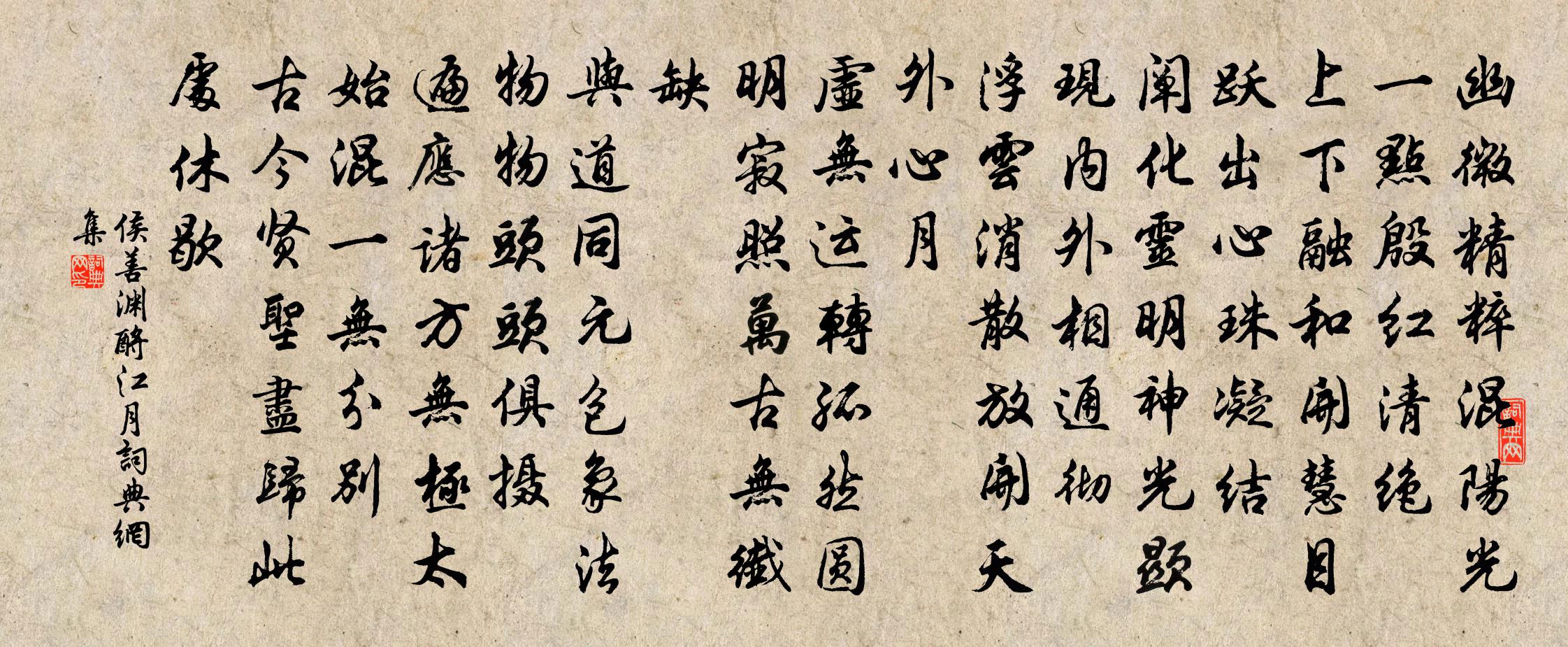 詩詞名句歷史字典書法欣賞書法字典國語詞典說文解字康熙字典古漢語字典標 題 作 者 詩 句 酹江月作者:侯善淵 朝代:元代酹江月原文幽微精粹,混陽光、一點殷紅清絕。上下融和開慧目,躍出心珠凝結。闡化靈明,神光顯現,內外相通徹。浮雲消散,放開天外心月。虛無運轉孤然,圓明寂照,萬古無纖缺。與道同元包象法,物物頭頭俱攝。遍應諸方,無極太始,混一無分別。古今賢聖,盡歸此處休歇。詩詞問答問:酹江月的作者是誰?答:侯善淵問:酹江月寫於哪個朝代?答:元代問:酹江月是什麼體裁?答:詞侯善淵酹江月書法欣賞酹江月書法作品詩詞推薦奉和上元酺宴應詔楊炯〔唐代〕甲乙遇災年,周隋送上弦。妖星六丈出,沴氣七重懸。赤縣空無主,蒼生欲問天。龜龍開寶命,雲火昭靈慶。萬物古莫買妾行曹鄴〔唐代〕千扉不當路,未似開一門。若遣綠珠醜,石家應尚存。挽周晉仙二首蘇泂〔宋代〕雪跨冰懸句盡珍,生前已自外其身。重來不見長安道,猶恐虛空遇若人。雪用歐陽公白戰律,仍禁用映雪訪戴等故事,楊萬里〔宋代〕細聽棄仍有,貪看立又行。落時晨卻暗,積處夜還明。幸自漫山好,何如到夏清。似知吾黨意,未遣日華晴。秋枝如殘人王安石〔宋代〕秋枝如殘人,顏色先憔悴。微寒吹已空,性命一何脆。寧當記疇昔,葩葉相嫵媚。歲行誰使然,好殺豈天意。梁宣王輓詞三首宋之問〔唐代〕貴藩堯母族,外戚漢家親。業重興王際,功高復辟辰。愛賢唯報國,樂善不防身。今日衣冠送,空傷置醴人。金精送曾直館歸寧泉州徐鉉〔唐代〕常憐客子倦征岐,誰似曾郎得意歸。廳瑣石渠封簡冊,手持仙桂拜庭闈。舯橫劍浦凌清瀨,馬過猿岩點翠微。卻笑和三二兄西莊書懷潘良貴〔宋代〕莫問莊生然不然,時中只可自隨緣。冬深江北無邊報,又得安貧過一年。送鮑份父薛師石〔宋代〕地僻官仍小,茲行古蹟多。矩羅應失笑,龐媼亦經過。宦業知餘事,宗風竟若何。□□□□□,滿舍是青莎。幽齋晁說之〔宋代〕幽齋無客 * 香,古像誰知靜放光。秋色深來人寂寞,雁聲斷處月荒涼。病軀如似小損可,賊勢流傳大獗張。可笑假面鋪任希夷〔宋代〕聖朝久變文身俗,四海誰非革面人。此他胡為名未改,猶勝酬偽必言真。次韻程機宜感懷曹勛〔宋代〕十年戈甲際,四海煙塵中。慘慘鼓角晚,萋萋禾黍風。賦張良臣〔宋代〕柳暗旗亭不忍看,臨江悉殺晉衣冠。傷心明月揚州路,十里珠簾蕙草寒。梅影郭印〔宋代〕斜斜曾向溪邊見,淡淡還從月下看。那得世間三昧手,為君寫出一枝寒。詩一首釋邁賢〔宋代〕揚子江頭浪最深,行人到此盡沉吟。他時若向無波處,還似有波時用心答劉安撫釋宗杲〔宋代〕毛錐子上通訊息,爭似亡言絕見知。後夜一輪空界月,清光千里共依依。夢觀牡丹陸游〔宋代〕忘卻晨梳滿把絲,楝花嫌不似臙脂。起來一笑看清鏡,惟插梨花卻較宜。春日書懷四首姜夔〔宋代〕武昌十萬家,落日紫煙低。亭亭頭陀塔,高處白鳥棲。白鳥忽飛去,春山空四圍。南樓有佳人,再召且再辭。閉門謁金門(宜春道中野塘春水可喜,有懷舊隱)范成大〔宋代〕塘水碧。仍帶面塵顏色。泥泥縠紋無氣力。東風如愛惜。恰似越來溪側。也有一雙鸂鶒。只欠柳絲千百尺。繫船春謁金門(秋興)佚名〔宋代〕秋淡淡。彌望暮天雲黯。窗小新糊便老眼。不應疏酒盞。菊淨橙香霜晚。何處數聲來雁。飛下湖邊紅蓼岸。有詩方名句推薦念去來、歲月如流,徘徊久、嘆息愁思盈。周邦彥《綺寮怨·上馬人扶殘醉》 自見者不明;自是者不彰老子《老子·道經·第二十四章》 重鑄鋤犁作斤,姑舂婦擔去輪官,輸官不足歸賣屋。元稹《田家詞 / 田家行》 君看蕭蕭只數葉,滿堂風雨不勝寒。李東陽《柯敬仲墨竹》 君思我、回首處,正江涵秋影雁初飛。辛棄疾《木蘭花慢·席上送張仲固帥興元》 夜雨做成秋,恰上心頭。納蘭性德《浪淘沙·夜雨做成秋》 暗燈涼簟怨分離,妖姬,不勝悲。閻選《河傳·秋雨》 動失之繁,靜失之寡。王通《中說·卷十·關朗篇》 柳葉雙眉久不描,殘妝和淚污紅綃。江采萍《謝賜珍珠》 開花必早落,桃李不如松。李白《箜篌謠》