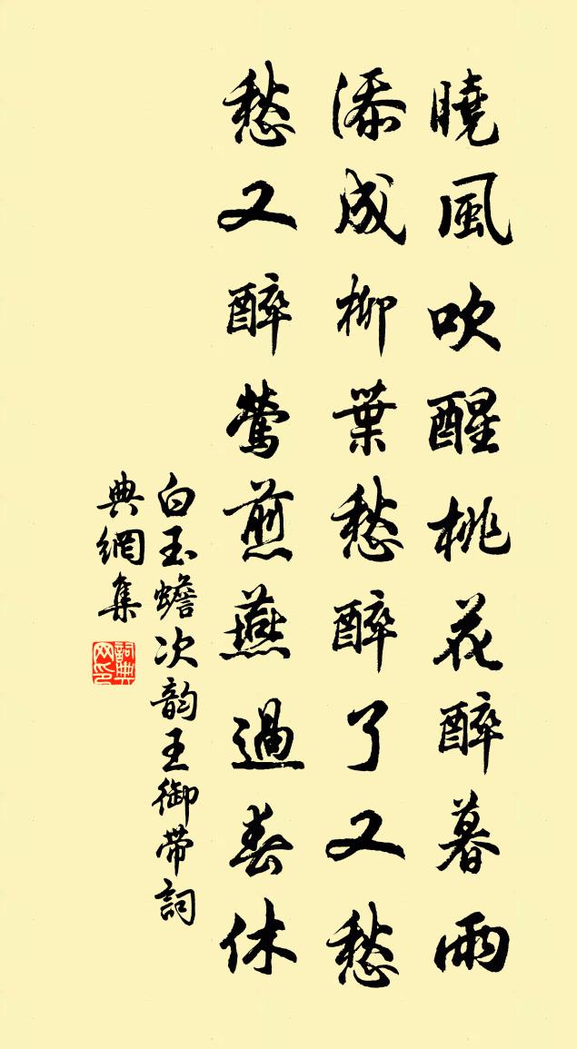 詩詞名句歷史字典書法欣賞書法字典國語詞典說文解字康熙字典古漢語字典標 題 作 者 詩 句 次韻王御帶作者:白玉蟾 朝代:宋代次韻王御帶原文曉風吹醒桃花醉,暮雨添成柳葉愁。醉了又愁愁又醉,鶯煎燕(左喬右亢)過春休。詩詞問答問:次韻王御帶的作者是誰?答:白玉蟾問:次韻王御帶寫於哪個朝代?答:宋代問:次韻王御帶是什麼體裁?答:七絕白玉蟾次韻王御帶書法欣賞次韻王御帶書法作品詩詞推薦題金陵雜興詩後八首薛師董〔宋代〕方泉周四半生痴,語輒驚人不自奇。渠句卻題君集後,要尋梨木共傳之。富池祠李流謙〔宋代〕卷雪樓高首重回,江東那得許人材。只應漢鼎三分後,便有英雄一聚來。酬李常侍立秋日奉詔祭岳見寄周墀〔唐代〕秋祠靈岳奉尊罍,風過深林古柏開。蓮掌月高珪幣列,金天雨露鬼神陪。質明三獻雖終禮,祈壽千年別上杯。豈是重過華下司馬光〔宋代〕昔辭蓮幕去,三十四炎涼。舊物三峰雪,新悲一鑷霜。雲低秦野闊,木落渭川長。欲問當時事,無人獨嘆傷。蘆山寺舒坦〔宋代〕江雲扶雨暖溶溶,來往東西只信風。早晚晴陰渾不定,青山半在有無中。鵝鴨相呼初出田,昏昏雲日澹平川。寒雲桃花華岳〔宋代〕紅雨隨風散落霞,行人幾誤武陵家。牧童若向青簾見,應認枝頭作杏花。過仙山詠孫松磵新庵陳著〔宋代〕雅懷欲友漢劉樊,巧築屠蘇壓大蘭。檐宿白雲山氣重,門無赤日樹陰寒。少年自得老成趣,危世誰如肥遁安。不界西歸於武陵〔唐代〕不系與舟閒,悠悠吳楚間。羞將新白髮,卻到舊青山。一葉忽離樹,幾人同入關。長安家尚在,秋至又西還。送賈訥朝奉通判眉州蘇轍〔宋代〕歸念長依落日邊,壺漿今見逆新官。聲傳已覺謳歌遍,身到前知政令寬。民病賢人來已暮,時平蜀道本無難。明年次韻金鄉宰韓宗恕寺丞見贈三首晁補之〔宋代〕乘濤無意犯星躔,好在琴尊且樂全。彭澤孤吟成小隱,蘇門雙嘯劇登仙。平時主父言多困,晚節揚雄學始傳。鮑叔示長安君王安石〔宋代〕少年離別意非輕,老去相逢亦愴情。草草杯盤供笑語,昏昏燈火話平生。自憐湖海三年隔,又作塵沙萬里行。欲問示資壽慧一監寺釋普濟〔宋代〕二由一有一莫守,面首面南看北斗。勘破末山不露頂,玄機無著高叉手。永遇樂(客答梅)佚名〔宋代〕玉骨冰肌,野牆山徑,煙雨蕭索。公子豪華,貪紅戀紫,誰分憐孤萼。想應窺見,潘 * 似,故把素懷相托。豈知送鄧秘丞知德安縣余靖〔宋代〕里閈俊游心久降,越台成政俗敦龐。香爐山下重為縣,閶闔風高還渡江。且喜恩威長及物,莫嫌功業未經邦。公齋達磨贊釋紹曇〔宋代〕遠離竺國見梁王,五鬼臨身討苦噇。面面相看言不識,秋風一葦急橫江。萬松嶺郭印〔宋代〕高崗立萬松,晨夕鳴天風。法法如是說,應不負山翁。姚江道中趙汝績〔宋代〕漉酒蒸糕饋歲時,紛紛兒女換新衣。隣翁七十看鵝鴨,日暮破船撐未歸。自西懸趨南鄭道中雜詠三首李新〔宋代〕愛山不道妨行色,礙眼仍須徹帽裙。願借仙人白鷳尾,自家親掃北山雲。暮春周南〔宋代〕茲辰如翻車,其行靡脫轂。春無十月妍,見此條蔓綠。蒼苔拾落花,天膏尚如沐。足身豈不好,反覆看已熟。惟有題文發叔所藏潘子真水墨江湖八境小軸廬山霽楊萬里〔宋代〕彭滭收積雨,廬山放嫩晴。多情是瀑布,只作雨中聲。名句推薦飛流直下三千尺,疑是銀河落九天。李白《望廬山瀑布》 話說多,不如少。惟其是,勿佞巧。李毓秀《弟子規·信》 清娥畫扇中,春樹鬱金紅。溫庭筠《清明日》 醉中渾不記,歸路月黃昏辛棄疾《臨江仙·探梅》 倉稟無宿儲,徭役猶未已。韋應物《觀田家》 山不厭高,海不厭深曹操《短歌行》 為學日益,為道日損。老子《老子·德經·第四十八章》 人患志之不立,亦何憂令名不彰邪?劉義慶《世說新語·自新》 梧桐葉上,點點露珠零。尹鶚《臨江仙·深秋寒夜銀河靜》 豆蔻連梢煎熟水,莫分茶。李清照《攤破浣溪沙·病起蕭蕭兩鬢華》