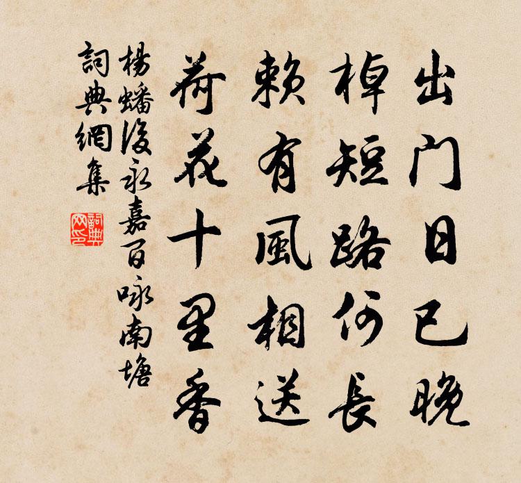 詩詞名句歷史字典書法欣賞書法字典國語詞典說文解字康熙字典古漢語字典標 題 作 者 詩 句 後永嘉百詠南塘作者:楊蟠 朝代:宋代後永嘉百詠南塘原文出門日已晚,棹短路何長。賴有風相送,荷花十里香。詩詞問答問:後永嘉百詠南塘的作者是誰?答:楊蟠問:後永嘉百詠南塘寫於哪個朝代?答:宋代楊蟠後永嘉百詠南塘書法欣賞後永嘉百詠南塘書法作品詩詞推薦林容州別墅劉克莊〔宋代〕出郭五里強,治地十畝寬。奇峰面朝挹,高阜背屈蟠。忽獻若神授,久閟由天慳。茲焉卜壽宮,朱堊浮林端。使君再次韻答許節推二首陳造〔宋代〕起依筇竹似桴浮,改就新詞卻自謳,囊錦斬關聊袖手,酒兵推戶且扶頭。東風已拆紅躑躅,碧樹更啼黃栗留。醒醉燒歌溫庭筠〔唐代〕起來望南山,山火燒山田。微紅夕如滅,短焰復相連。差差向岩石,冉冉凌青壁。低隨迴風盡,遠照檐茅赤。鄰翁詩一首胡銓〔宋代〕夜讀文公猛虎詩,云何虎死忽悲啼。人生未省向來事,虎死方羞前所為。昨日猶能食熊豹,今朝無計奈狐狸。我曾有懷重送斛斯判官杜牧〔唐代〕蒼蒼煙月滿川亭,我有勞歌一為聽。將取離魂隨白騎,三台星里拜文星。直院中書莫公殂往哀痛不成文輒留小詩靈幾並葉適〔宋代〕閣老今無地上身,黃麻紫誥兩沉淪。虛懸東嶺來時月,難挽西山去後春。試割冰鱸猶脆薄,重餐野橘尚甘辛。最憐梅花喜神譜小蕊一十六枝宋伯仁〔宋代〕錦囊蘊珠璣,長養南風力。當年東老家,曾代中書筆。夜半樂·凍雲黯淡天氣柳永〔宋代〕凍雲黯淡天氣,扁舟一葉,乘興離江渚。渡萬壑千岩,越溪深處。怒濤漸息,樵風乍起,更聞商旅相呼。片帆高舉新豐道中林景熙〔宋代〕長飈卷炎埃,澄空出秋素。迢迢鐵瓮城,回首隔蒼霧。酒帘颺荒市,笳鼓發深戍。倚逢問舟人,雲是新豐路。籬路【雙調】清江引_春思黃鶯亂張可久〔元代〕春思黃鶯亂啼門外柳,雨細清明後。能消幾日春,又是相思瘦,梨花小窗人病酒。交翠亭梅花自開鶴自舞,隔斷蓬題貢院趙善晤〔宋代〕天約閒雲結 * ,苦無詩酒懶登臨。一聲雞唱日初午,滿地花寒秋已深。春遊五首邵雍〔宋代〕人間佳節唯寒食,天下名園重洛陽。金谷暖橫宮殿碧,銅駝晴合綺羅光。橋邊楊柳細垂地,花外鞦韆半出牆。白馬次韻子瞻謫居三適其二午窗坐睡蘇轍〔宋代〕定中窗龍眠膝,窗定起柳生窗肘。心無出入異,三昧亦何有。晴窗午陰轉,坐睡一何久。頹然擁褐身,剝啄叩門手臨江仙(次韻葉少蘊惜春)李彌遜〔宋代〕試問花枝余幾許,捲簾細雨隨人。風光猶戀苦吟身。海棠渾怯冷,為我強留春。細聽惜花歌白雪,不知盞面生塵。過楊樂道宅西桃花盛開蔡襄〔宋代〕城隈繞舍似山家,舍下新桃已放花。無限幽香風正好,不勝狂艷日初斜。自憐馬上空愁望,誰向樽前與醉夸。京國蕭果卿祭酒挽章二首呂祖謙〔宋代〕虛心觀世態,實行播鄉評。璧玉中邊厚,冰壺表里清。家聲到蕭傳,人望似陽城。殄瘁無窮恨,湘江日夜傾。紗詩項安世〔宋代〕芙蕖供色更供絲,緝就沙溪水面漪。疏密整斜於雪似,香輕軟細與風宜。集堂妙得發均意,織藕新翻蜀客詞。喚作清平樂姚燧〔元代〕菲菲香雪。更照溶溶月。管被司花嫌太潔。故遺啼鵑濺血。方舒笑臉迎丹。兩聲深院珊珊。有底春愁未訴,向人紅逍遙詠宋太宗〔宋代〕陽與陰和合,須從一字求。分明皆是象,作相不能投。舉措先真實,精粗各自柔。恆持通覺悟,萬派水東流。借翠蛟亭韻笑擲震雷〔宋代〕兀兀梅窗坐已頑,自憐失腳落人間。洞霄宮裡星辰近,天柱峰前日月閒。野鶴聽琴飛雪舞,湫龍喜客為瀾翻。此中名句推薦淇則有岸,隰則有泮。佚名《氓》 曉月墜,宿雲微,無語枕頻欹。李煜《喜遷鶯·曉月墜》 神龜雖壽,猶有竟時。曹操《龜雖壽》 庭戶無人秋月明,夜霜欲落氣先清。張耒《夜坐·庭戶無人秋月明》 惱亂橫波秋一寸。斜陽只與黃昏近。趙令畤《蝶戀花·卷絮風頭寒欲盡》 得人之道,在於知人;知人之法,在於責實。脫脫《宋史·列傳·卷九十七》 鄉心新歲切,天畔獨潸然。劉長卿《新年作》 成事莫說,覆水難收。佚名《增廣賢文·上集》 臣子恨,何時滅!駕長車,踏破賀蘭山缺。岳飛《滿江紅·寫懷》 新歡不抵舊愁多,倒添了、新愁歸去范成大《鵲橋仙·七夕》