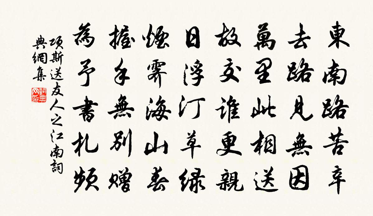 詩詞名句歷史字典書法欣賞書法字典國語詞典說文解字康熙字典古漢語字典標 題 作 者 詩 句 送友人之江南作者:項斯 朝代:唐代送友人之江南原文東南路苦辛,去路見無因。萬里此相送,故交誰更親。日浮汀草綠,煙霽海山春。握手無別贈,為予書札頻。詩詞問答問:送友人之江南的作者是誰?答:項斯問:送友人之江南寫於哪個朝代?答:唐代問:送友人之江南是什麼體裁?答:五律項斯送友人之江南書法欣賞送友人之江南書法作品注釋全唐詩:卷554-63詩詞推薦記夢示師是陳造〔宋代〕青燈寒夜思吾鄉,合眼便坐吾家堂。阿丁炯然目如水,彩服蹁躚趨我傍。中心喜之謬督過,還為遨嬉廢書課。指似別詩佚名〔兩漢〕良時不再至,離別在須臾。屏營衢路側,執手野踟躕。仰視浮雲馳,奄忽互相逾。風波一失所,各在天一隅。長當再用彝公長老韻贈嗣宗教授喻良能〔宋代〕居易青衫舊,安仁素髮新。愁思中酒聖,貧忍論錢神。白也詩誰敵,潮乎筆更親。生辰宿南斗,同是數奇人。回陳兄惠瓜劉宰〔宋代〕碧圓到眼舌生津,三載深慚拜賜頻。莫怪尊前最知味,東陵自是種瓜人。初榮曾豐〔宋代〕何當謁精,宋績丕成。之子終榮,匪一時之馨,維千百載之馨。昨者張耒〔宋代〕昨者飛雹幾破屋,頗說四郊妨麥熟。十日霖雨一日晴,泥潦漫漫不容足。淒風寒涼肅肌骨,五月更衣初秋服。草木金山亭呈翁守二首方廷實〔宋代〕新亭高敞枕城隈,萬里江山爽氣來。雲外孤峰擎日晚,林間啼鳥喚春回。登車謾有澄清志,覽景慚非賦詠才。太守送廷珍殿丞兄通判閬州、范祖禹〔宋代〕十年京洛弄殘書,喜見西歸別駕車。錦里追游貧莫厭,彩衣榮侍樂何如。詔條安遠民為本,才刃如君地有餘。不日用韻謝前人文天祥〔宋代〕茲游良邂逅,吾道未逶遲。斗野橫雙劍,牛津直兩旗。此風應小住,明日便相思。輸與君家近,扶桑五色曦。約喻叔厚總乾會於香山徐僑〔宋代〕鄉居唯我與君閒,相見俱緣一出慳。此去君家無十里,杖藜明日會香山。和張器先十絕楊萬里〔宋代〕台家搜遍北山萊,傾國如君不用媒。次第幽人出空谷,鶴書即傍日邊來。酬蘊微李鹹用〔唐代〕白衣經亂世,相遇一開顏。得句禪思外,論交野步間。舉朝無舊識,入眼只青山。幾度斜陽寺,訪君還獨還。寄題密州蘇學士快哉亭太史雲此城之西北送客文同〔宋代〕出城送客客未來,主人到此先徘徊。地臨濰水極清曠,每為送客雙眼開。客來既坐歌管作,紅袖勸酒無停杯。主人寄向伯休且約他日道為薌林之游二首趙蕃〔宋代〕東郭竹谿君所廬,我家此物也扶疏。何時歸去數來往,不似而今空寄書。題牟節叟介壽堂和劉左史韻魏了翁〔宋代〕兒大詩書敵富強,婦供滫瀡養尊章。照盤曉日龍為炙,介壽春風玉作堂。禮物皆由天賦分,家榮亦使里生光。人生杏園花下酬樂天見贈劉禹錫〔唐代〕二十餘年作逐臣,歸來還見曲江春。遊人莫笑白頭醉,老醉花間有幾人。蘇武徐鈞〔宋代〕胡沙不隔漢家天,一節堅持十九年。白首微官甘屬國,恥隨李衛老戎旃。送張飾之王炎〔宋代〕俗子問寒溫,吾儕相爾汝。二年坐窮山,蛛網懸一麈。剝啄誰扣關,欲語不敢吐。有客騎鯨魚,迎之倒雙屣。家聲望江南(答徐守韻)洪适〔宋代〕嗟故歲,夏旱復秋陽。十雨五風皆定數,千方百計為災傷。小郡怎禁當。勞拊字,惠露洽丁黃。田舍炊煙常蔽野,彬監寺爭田釋法薰〔宋代〕衲僧公驗既分明,祖父田園盡力爭。他日水雲同一飽,幾人放筋便忘恩。名句推薦兵不完利,與無操者同實管仲《管子·參患》 孤煙村際起,歸雁天邊去。孟浩然《南歸阻雪》 一民之軌,莫如法。厲官威名,退淫殆,止詐偽,莫如刑。刑重,則不敢以貴易賤;法審,則上尊而不侵。韓非及後人《韓非子·有度》 寧添一斗,莫添一口。佚名《增廣賢文·上集》 孤雁不飲啄,飛鳴聲念群。杜甫《孤雁 / 後飛雁》 落絮無聲春墮淚,行雲有影月含羞。吳文英《浣溪沙·門隔花深夢舊遊》 天覆吾,地載吾,天地生吾有意無。李泌《長歌行》 投策命晨裝,暫與園田疏。陶淵明《始作鎮軍參軍經曲阿作》 女曰雞鳴,士曰昧旦。佚名《女曰雞鳴》 豈知民力艱,顆米皆琳琅。黃燮清《秋日田家雜詠》
