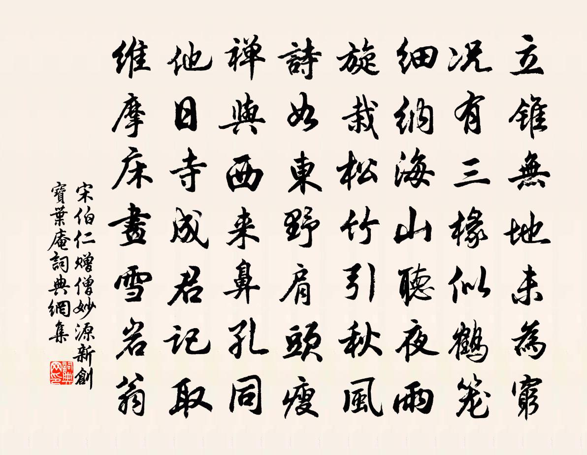 詩詞名句歷史字典書法欣賞書法字典國語詞典說文解字康熙字典古漢語字典標 題 作 者 詩 句 贈僧妙源新創寶葉庵作者:宋伯仁 朝代:宋代贈僧妙源新創寶葉庵原文立錐無地未為窮,況有三椽似鶴籠。細納海山聽夜雨,旋栽松竹引秋風。詩如東野肩頭瘦,禪與西來鼻孔同。他日寺成君記取,維摩床畫雪岩翁。詩詞問答問:贈僧妙源新創寶葉庵的作者是誰?答:宋伯仁問:贈僧妙源新創寶葉庵寫於哪個朝代?答:宋代宋伯仁贈僧妙源新創寶葉庵書法欣賞贈僧妙源新創寶葉庵書法作品詩詞推薦晚春二首陳傅良〔宋代〕莫道春歸事已非,水邊天際綠成圍。隔籬聽得農家語,雨過田田麥含肥。次韻來梓見贈一首王阮〔宋代〕無心谷璧陪蒲璧,有分山光映水光,子賤假令宜單父,淵明終合在柴桑,為氓且盡今生力,責子寧須後代昌。為問和前人韻辛棄疾〔宋代〕茶瓜不作片時留,又向悠然作勝游。花徑似經新掃酒,竹林喚起舊風流。天教有象皆楷寫,世已無書可校讐。長日獨游城西諸僧舍陸游〔宋代〕我是天公度外人,看山看水自由身。蘚崖直上飛雙屐,雲洞前頭岸幅巾。萬里欲呼牛渚月,一生不受庾公塵。非無冬晴行園中陸游〔宋代〕桔槔灌蔬固已非,竹筧澆花宜見譏。杏繁梅瘦種性別,一氣生殺均天機。細推物理孰不爾,摶風未可嘲卑飛。君其上巳賜宴瓊林與二府諸公游水心憩於西軒晏殊〔宋代〕咽雲簫鼓傳聲沸,臨水樓台倒影多。吟繞曲欄無限思,緒風遲日滿煙波。陳參政輓詩三首張嵲〔宋代〕徒知天可恃,豈謂病終侵。遽使儀刑意,翻成殄瘁心。開阡賢子力,卜遠外姻臨。墓木看初種,俄悲已茂林。遇仙槎 繼重陽韻馬鈺〔元代〕迷迷苦海游,緣甚塵拋擺。深謝本師鉤,釣向關西界。心無喜與憂,化道崇真快。未敢上丹霄,且結金蓮會。文峰夜飲三首錢時〔宋代〕萬事浮雲過眼非,人間真樂盡稀微。從今一笑春風裹,未用 * 月下歸。王簿清輝亭楊時〔宋代〕黛染煙螺拂檻低,抱城流水綠逶迤。澄瀾碎影搖青鏡,斜日流峰隱半規。坐上盈樽無俗客,壁間照夜有新詩。登臨送太尉相公赴鎮安軍二首宋祁〔宋代〕連章得請避洪鈞,赭案除書天下聞。久冠鵷鸞為上宰,別驅貔虎作中軍。腳踏車款曲懷遼帳,一燧平安出隴雲。今日丁采傑輓詩劉克莊〔宋代〕文字蜚聲早,功名入手遲。晚知書誤我,時以酒澆之。曠野靈均些,新墳貞曜碑。兩翁不在子,其必在孫枝。送朱主簿韓維〔宋代〕浮舟下東溪,春寒花未遍。共約徵車行,復此華堂餞。人事多齟齬,臨分闕芳燕。坐想竹間風,雜英紛如霰。泛南湖至石帆詩謝惠連〔南北朝〕軌息陸塗初。枻鼓川路始。漣漪繁波漾。參差層峰峙。蕭疏野趣生。逶迤白雲起。登陟苦跋涉。{目辟}盻樂心耳秋懷 十二王冕〔元代〕酌彼澗下水,彈此石上琴。希聲應弦起,幽幽孤鳳吟。曲中萬里意,三嘆無知音。豈但無知音?終恐無知心。重九與子通游虎丘謁祖印大師三首朱長文〔唐代〕絕境良辰少兩全,支筇莫倦到山巔。清談已可忘樽俎,真樂何勞聽管弦。才子就題黃絹語,高僧多諷碧雲篇。孤舟題玉泉寺大師影堂齊己〔唐代〕大化終華頂,靈蹤示玉泉。由來負高尚,合向好山川。洞壑藏諸怪,杉松列瘦煙。千秋空樹影,猶似覆長禪。中秋李朴〔唐代〕皓魄當空寶鏡升,雲間仙籟寂無聲。平分秋色一輪滿,長伴雲衢千里明。狡兔空從弦外落,妖蟆休向眼前生。靈槎寄曹州晁大夫陳師道〔宋代〕墮絮隨風花作塵,黃樓桃李不成春。只今容有名駒子,困倚欄乾一欠伸。游普向十首陳造〔宋代〕行穿老檜千尋影,歸受涼荷十里風。從此勝游縈客夢,夢隨黃鵠下雲空。名句推薦去年射虎南山秋,夜歸急雪滿貂裘。陸游《三月十七日夜醉中作》 柳葉雙眉久不描,殘妝和淚污紅綃。江采萍《謝賜珍珠》 白雲映水搖空城,白露垂珠滴秋月。李白《金陵城西樓月下吟》 春去花還在,人來鳥不驚。王維《畫》 凡事謹守規模,必不大錯;一生但足衣食,便稱小康。王永彬《圍爐夜話·第五三則》 百畝庭中半是苔,桃花淨盡菜花開。劉禹錫《再游玄都觀》 中秋誰與共孤光。把盞悽然北望。蘇軾《西江月·世事一場大夢》 山中相送罷,日暮掩柴扉。王維《送別 / 山中送別 / 送友》 風雨梨花寒食過,幾家墳上子孫來?高啟《送陳秀才還沙上省墓》 誰見汀洲上,相思愁白蘋。劉長卿《餞別王十一南遊》