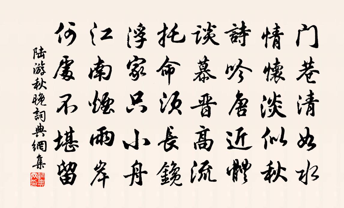 詩詞名句歷史字典書法欣賞書法字典國語詞典說文解字康熙字典古漢語字典標 題 作 者 詩 句 秋晚作者:陸游 朝代:宋代秋晚原文門巷清如水,情懷淡似秋。詩吟唐近體,談慕晉高流。託命須長鑱,浮家只小舟。江南煙雨岸,何處不堪留?詩詞問答問:秋晚的作者是誰?答:陸游問:秋晚寫於哪個朝代?答:宋代問:陸游的名句有哪些?答:陸游名句大全陸游秋晚書法欣賞秋晚書法作品詩詞推薦重至秀山售屋將歸十首方回〔宋代〕離亂斯人致,艱危我輩當。渾淪俄破碎,桀黠盡飛揚。吐舌何能已,捫心肯自量。忍窮非左計,天象看弧狼。偶成 其二王冕〔元代〕二月江亭野色明,楊花飛散雪盈盈。鹽煙半入海氣白,風雨忽來溪樹鳴。離思厭聽孤語燕,客情無奈亂山青。明朝贈李果毅盧綸〔唐代〕向日磨金鏃,當風著錦衣。上城邀賊語,走馬截雕飛。憶秦娥蔡伸〔宋代〕花陰月。蘭堂夜宴神仙客。神仙客。江梅標韻,海棠顏色。良辰佳會誠難得。花前一醉君休惜。君休惜。楚台雲雨代夢得吟白居易〔唐代〕後來變化三分貴,同背凋零太半無。世上爭先從盡汝,人間斗在不如吾。竿頭已到應難久,局勢雖遲未必輸。不見偈頌一百零二首釋紹曇〔宋代〕墅里山前,一棚傀儡。個東個西,或進或退。打東山鼓樂,斷送及時。著楊岐戲衫,編排合制。雖由行主線牽抽,奉和聖制次成皋先聖擒建德之所張九齡〔唐代〕天命誠有集,王業初惟艱。翦商自文祖,夷項在茲山。地識斬蛇處,河臨飲馬間。威加昔運往,澤流今聖還。尊祖天迥劉子翬〔宋代〕天迥孤帆隱約歸,茫茫殘照欲沉西。寒鴉散亂知多少,飛向江頭一樹棲。道中聞蛙聲張舜民〔宋代〕一夜蛙聲不暫停,近如相和遠如爭。信知不為官私事,應恨疏螢徹夜明。雜詠七言二首劉克莊〔宋代〕清禁已無蓮炬分,名山尚欠草鞋緣。賀公未是真知己,卻喚詩仙作謫仙。滄浪峽(一作儲嗣宗詩)儲光羲〔唐代〕滄浪臨古道,道上若成塵。自有滄浪峽,誰為無事人。四月十三日曉夢入試枕上口占蘇泂〔宋代〕行年今已是七十,況世非皆七十翁。柏兒安女莫遲我,我入泰華游衡嵩。過胡居士睹王右丞遺文司空曙〔唐代〕舊日相知盡,深居獨一身。閉門空有雪,看竹永無人。每許前山隱,曾憐陋巷貧。題詩今尚在,暫為拂流塵。透法身句釋重顯〔宋代〕潦倒雲門泛鐵船,江南江北競頭看。可憐無限垂鉤者,隨例茫茫失釣竿。善惠師禪齋宋庠〔宋代〕象馬王城地,禪扃此獨開。漏聲隨葉換,風意繞幡來。馴鴿依齋樹,飛花戀講台。朝珂時一集,並為碧雲才。洞仙歌·泗州中秋作晁補之〔宋代〕青煙冪處,碧海飛金鏡。永夜閒階臥桂影。露涼時、零亂多少寒螿,神京遠,惟有藍橋路近。水晶簾不下,雲母屏除夕王邁〔宋代〕憶昔都門值歲除,高樓張燭戲呼盧。久依淨社參尊宿,難向新豐認酒徒。天子未知工劃賦,鄰人或倩寫桃符。寒宵丈亭登舟有感釋紹嵩〔宋代〕未厭長為客,孤舟趁夜行。不唯山水樂,頗覺夢魂清。風緩帆舒捲,雲行月送迎。勞生誰獨免,空復嘆勞生。坤成節集英殿宴教坊詞致語口號臣聞視履考祥蘇軾〔宋代〕三朝遺老九門前,又見承平大有年。文母憂勤初化俗,曾孫仁孝已通天。史書元佑三千牘,樂奏坤成第一篇。欲采別天台高似孫〔宋代〕早乘霞氣入蓬萊,不識神仙也不來。曾與赤松游數日,自攜玉女上西台。當時共說黃房事,回首空驚碧海埃。前度名句推薦猶余雪霜態,未肯十分紅。王十朋《紅梅》 旋開旋落旋成空,白髮多情人更惜。司空圖《酒泉子·買得杏花》 關山別盪子,風月守空閨。薛道衡《昔昔鹽》 蕭條庭院,又斜風細雨,重門須閉。李清照《念奴嬌·春情》 輕舟泛月尋溪轉,疑是山陰雪後來李白《東魯門泛舟二首》 世間行樂亦如此,古來萬事東流水。李白《夢遊天姥吟留別 / 別東魯諸公》 雁過孤峰曉,猿啼一樹霜。賈島《送天台僧》 花繁柳密處,撥得開,才是手段;風狂雨急時,立得定,方見腳根。陳繼儒《小窗幽記·集醒篇》 碧雲無渡碧天沉,是湖心,是儂心。張惠言《江城子·填張春溪西湖竹枝詞》 高樓目盡欲黃昏,梧桐葉上蕭蕭雨。晏殊《踏莎行·碧海無波》