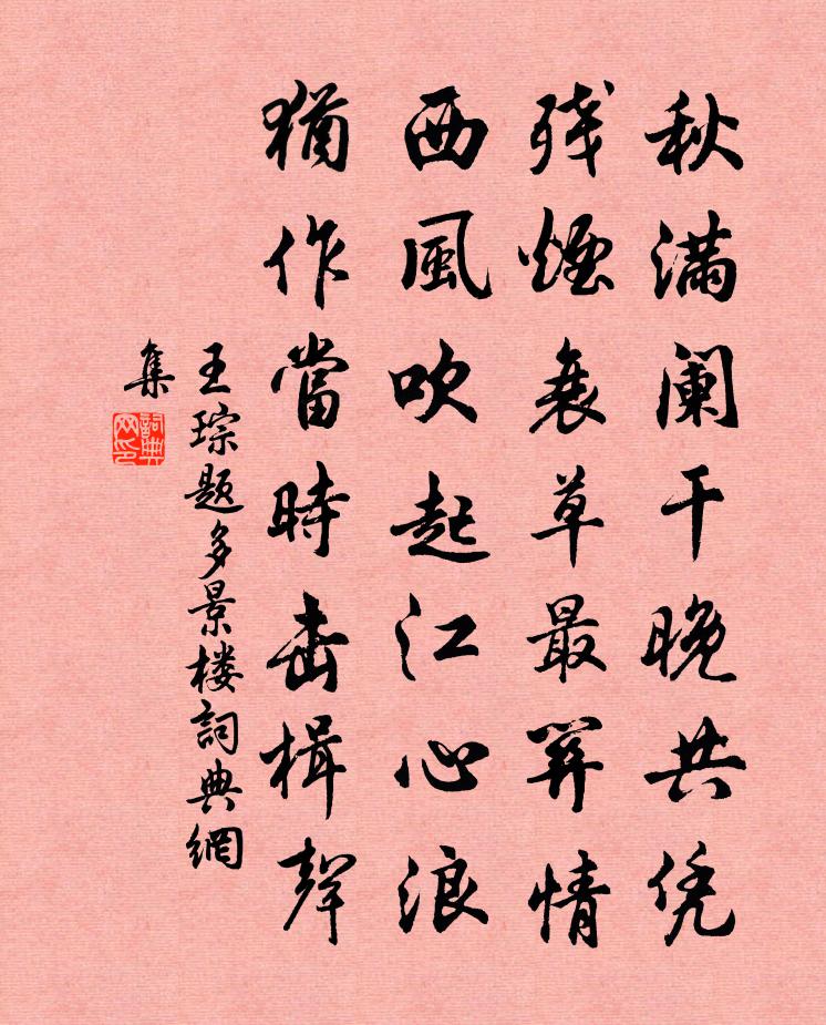 詩詞名句歷史字典書法欣賞書法字典國語詞典說文解字康熙字典古漢語字典標 題 作 者 詩 句 題多景樓作者:王琮 朝代:宋代題多景樓原文秋滿闌乾晚共憑,殘煙衰草最關情。西風吹起江心浪,猶作當時擊楫聲。詩詞問答問:題多景樓的作者是誰?答:王琮問:題多景樓寫於哪個朝代?答:宋代問:題多景樓是什麼體裁?答:五絕王琮題多景樓書法欣賞題多景樓書法作品詩詞推薦八月十五看潮五絕蘇軾〔宋代〕吳兒生長狎濤淵,冒利輕生不自憐。東海若知明主意,應教斥鹵變桑田。赭圻陳造〔宋代〕朱旗僅奏蜀川功,咫尺中原未向風。禮接謝安猶故舊,心知越石是英雄。生前逆氣無宗國,身後餘殃有狡童。忍對送鄭天休宋祁〔宋代〕春筠蒸遍擿鋒摧,剡奏飄然別上台。授簡客驚枚乘去,探書人繼史公來。爆桐度曲離筵慘,樵的分風使棹催。千萬雜興劉克莊〔宋代〕誤朝者誰歟,肘後挾管商。簿錄網已密,筦搉弓遂張。競貢包茅入,誰知刈葵傷。饒歌慶胡滅,蒙沖弛江防。向非示如理道友釋崇岳〔宋代〕如如不動已周遮,理事馳求路轉賒。直下踏翻樵子徑,知君未到葛洪家。連日與王忠玉張全翁游西湖訪北山清順道潛二蘇軾〔宋代〕北山非自高,千仞付我足。西湖亦何有,萬象生我目。雲深人在塢,風靜回響谷。與君皆無心,信步行看竹。竹間和芙蓉和尚四句偈頌鐵鋸舞三台釋慧暉〔宋代〕鐵牛無角臥山坡,鞭起如飛見也么。鬧市橫騎人不會,抬頭鷂子過新羅。與妙庵主釋慧空〔宋代〕至道之宗,備在爾躬。求之則遠,守之不通。不求不守,奇載靈叟。極離極微,應心應手。觸目晴嵐,到處成庵。瓊花顏師魯〔宋代〕后土祠中二月暮,瓊花放後有蜂來。東君不怕春歸去,留待詩人一夜開。送鄭剛中赴江東參議張鎡〔宋代〕去程遙指石頭城,秋與鐘山老氣清。紬繹蓬巒曾是正字,參陪蓮幕試論兵。時平得計甘微祿,學古無心急近榮。君次韻趙寄庵陳著〔宋代〕家住黃沙綠水灣,功名土苴任天慳。顧瞻宇宙驚多礙,收卷江湖憩一閒。處子聲容心自鐵,太公年幾鬢才斑。老來辭方公悅鄭俠〔宋代〕又承尊酒細論文,日日樽前得未聞。鄰舊直忘趨走賤,有疑俱向笑談分。心緣明德懷高屏,日為偏親斷遠雲。明日又二首呂祖謙〔宋代〕平生丈人行,每語盡箴規。問字揚雄宅,談經董相帷。壺觴陪勝踐,杖屨及深期。誰料南歸日,墳前宿草衰。閒居張祜〔唐代〕僻巷新苔遍,空庭弱柳垂。井欄防稚子,盆水試鵝兒。喜客加籩食,邀僧長路棋。未能拋世事,除此更何為。次韻奉酬李質夫王安石〔宋代〕逸少池邊有舊山,幾年征淚染衣斑。駑駘自飽方爭路,騕褭長飢不在閒。雪漲江南歸浩蕩,煙埋河朔去間關。勞歌句張伯玉〔宋代〕紅梅花下一樽酒,拋擲清香是負伊。頌證道歌證道歌釋印肅〔宋代〕大悟不拘於小節,猛焰爐中撈霰雪。石頭垂足示長髭,修行有甚相交涉。次韻馬季思禁體雪二首蘇泂〔宋代〕滌盡妖氛氣,妝成富貴冬。梅花香處覺,人意火邊濃。未暖那飛絮,非寒底見松。絕憐階下竹,腰折為誰恭。獻所知張蠙〔唐代〕跡熟荀家見弟兄,九霄同與指前程。吹噓漸覺馨香出,夢寐長疑羽翼生。住僻驊騮皆識路,來頻鸚鵡亦知名。登龍次黃司戶紅糟韻四首項安世〔宋代〕主人廚中魚尾紅,把酒一笑相為容。燕脂煉就玉雪汁,琥珀光透琉璃鍾。酒酣萬事忽驚散,捽耳頓足歌年豐。連缸名句推薦娶妻無媒毋須恨,書中自有顏如玉。趙恆《勸學詩》 武帝宮中人去盡,年年春色為誰來。岑參《登古鄴城》 仁則榮,不仁則辱。孟子《孟子·公孫丑章句上·第四節》 花明柳暗繞天愁,上盡重城更上樓。李商隱《夕陽樓》 雪花全似梅花萼。細看不是雪無香,天風吹得香零落。王旭《踏莎行·雪中看梅花》 志足而言文,情信而辭巧劉勰《文心雕龍·徵聖》 相見時難別亦難,東風無力百花殘。李商隱《無題·相見時難別亦難》 空將漢月出宮門,憶君清淚如鉛水。李賀《金銅仙人辭漢歌》 無稽之言,不見之行,不聞之謀,君子慎之。荀子《荀子·正名》 鼓吹助清賞,鴻雁起汀洲。蘇轍《水調歌頭·徐州中秋》