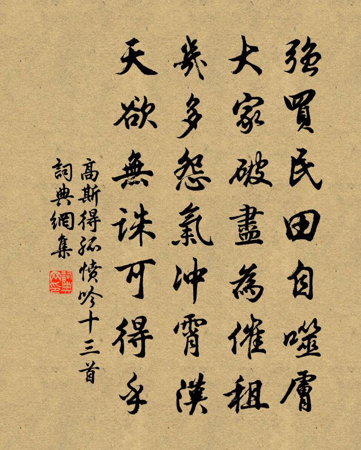 詩詞名句歷史字典書法欣賞書法字典國語詞典說文解字康熙字典古漢語字典標 題 作 者 詩 句 孤憤吟十三首作者:高斯得 朝代:宋代孤憤吟十三首原文強買民田自噬膚,大家破盡為催租。幾多怨氣沖霄漢,天欲無誅可得乎。詩詞問答問:孤憤吟十三首的作者是誰?答:高斯得問:孤憤吟十三首寫於哪個朝代?答:宋代高斯得孤憤吟十三首書法欣賞孤憤吟十三首書法作品詩詞推薦簡陳監倉二首張鎡〔宋代〕自到南湖日,鄰翁識長方。一官甘寂寞,萬事絕思量。疎見只緣懶,頻來政不妨。松林渾似舊,相伴踞胡床。無俗念 枰棋丘處機〔元代〕前程路遠,未昭彰、金玉仙姿靈質。寂寞無功天賜我,棋局開顏銷日。古柏岩前,清風台上,宛轉晨餐畢。幽人來遣興陸游〔宋代〕壯年一箭落雙鵰,野餉如今擷藥苗。寒與梅花同不睡,悶尋鸚鵡說無憀。烏絲闌上詩初就,綠綺聲中酒半消。老去古意謝崔楊州辟七首洪咨夔〔宋代〕江頭客子舡,盡日臥沙尾。維楫非不具,潮弱未能跬。秋風雪浪高,長年絕叫起。舡行莫倚柁,難得此汛水。圓通大士贊釋慧開〔宋代〕足蹈雙蓮灑楊柳,面目端嚴世希有。梵音妙音海潮音,祗這而今誰動口。贈張徐州謖范雲〔南北朝〕田家樵採去,薄暮方來歸。還聞稚子說,有客款柴扉。儐從皆珠玳,裘馬悉輕肥。軒蓋照墟落,傳瑞生光輝。疑是寄懷趙南紀二首趙蕃〔宋代〕聞道君先我,論交我愧君。長沙辱傾蓋,懷玉悵離群。怪底書多枉,情知義薄雲。金蘭雖甚篤,藥石願時分。天象洪咨夔〔宋代〕白氣一抹蚩尤旗,南斗北斗天兩垂。西方熒惑耀芒角,初月吐魄來食之。去年天象已可駭,今年天象更可疑。春王雲門道中陸游〔宋代〕度嶺穿林一徑斜,旋篝新火試新茶。箬包粉餌祠寒食,雨濕青鞋上若耶。石罅微泉來滴瀝,溪涯老木臥槎牙。不須緣識宋太宗〔宋代〕促軫調弦急,碎聲用意彈。指頭輕妙處,鶯舌五音端。寒食夜元稹〔唐代〕紅染桃花雪壓梨,玲瓏雞子斗贏時。今年不是明寒食,暗地鞦韆別有期。題尤使君郡圃十二詩參雲亭李庚〔宋代〕元公來把麾,與發脫水戹。當時游息地,危亭冠州宅。梁棟宿寒雲,去天才一握。尚余手種木,甘棠思邵伯。贈邦上人釋智圓〔宋代〕深居饒野興,門冷入杉松。鳥外閒頻往,人間事罕逢。水軒吟片月,秋榻夢千峰。憶得看新雪,相招靜話重。緣識宋太宗〔宋代〕妙手彈琴無向束,知之修煉五音足。先辨浮沈有指歸,弦頭制度相催促。左手抑揚禁淫邪,右手徘徊堪瞻矚。法於鷓鴣天元好問〔金代〕憔悴鴛鴦不自由。鏡中鸞舞只堪愁。庭前花是同心樹,山下泉分兩玉流。金絡馬,木蘭舟。誰家紅袖水西樓。春風登樓懷遵易釋智圓〔宋代〕閒景杳無極,憑欄思若何。鳥行沈遠岳,秋色滿滄波。來信經年絕,新愁向晚多。依依自吟望,舊約負煙蘿。和陶詠三良蘇軾〔宋代〕此生太山重,忽作鴻毛遺。三子死一言,所死良已微。賢哉晏平仲,事君不以私。我豈犬馬哉,從君求蓋帷。殺身暮秋懷王專臧奎王衢三從事魏野〔宋代〕舊友各西東,閒思興莫窮。盡居花幕下,獨在竹林中。白屋貧雖異,清宵夢想同。吟餘遙望處,寒雨正濛濛。先蠶六首佚名〔宋代〕掩抑笙簫,鏗谹金石。神來宴娭,嘉我休德。奉祀之臣,洗心翊翊。錫茲福禧,以惠四國。別方次雲林光朝〔宋代〕姑蘇台上姑蘇館,共說南山竹火爐。湖上相逢又相別,不知何處說姑蘇。名句推薦時無英雄,使豎子成名!房玄齡《晉書·列傳·第十九章》 陶令不知何處去, 桃花源里可耕田 * 《七律·登廬山》 鬱陶思君未敢言,寄聲浮雲往不還。曹丕《燕歌行》 日光寒兮草短,月色苦兮霜白。李華《弔古戰場文》 故園便是無兵馬,猶有歸時一段愁陳與義《送人歸京師》 星垂平野闊,月涌大江流。杜甫《旅夜書懷》 枕障薰爐隔繡帷,二年終日苦相思,杏花明月始應知。張曙《浣溪沙·枕障薰爐隔繡帷》 漢口夕陽斜渡鳥,洞庭秋水遠連天。劉長卿《自夏口至鸚鵡洲夕望岳陽寄源中丞》 秋色雁聲愁幾許,都在斜陽。吳文英《浪淘沙·九日從吳見山覓酒》 嚴近乎矜,然嚴是正氣,矜是乖氣;故持身貴嚴,而不可矜。王永彬《圍爐夜話·第四三則》