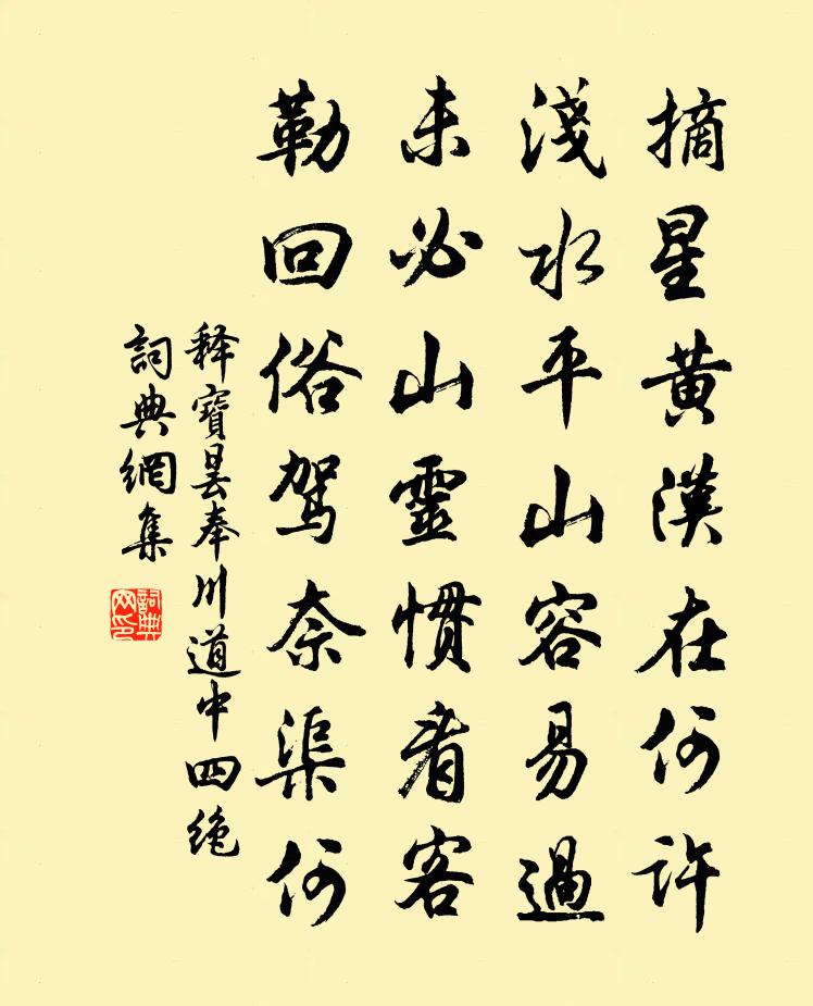 詩詞名句歷史字典書法欣賞書法字典國語詞典說文解字康熙字典古漢語字典標 題 作 者 詩 句 奉川道中四絕作者:釋寶曇 朝代:宋代奉川道中四絕原文摘星黃漢在何許,淺水平山容易過。未必山靈慣看客,勒回俗駕奈渠何。詩詞問答問:奉川道中四絕的作者是誰?答:釋寶曇問:奉川道中四絕寫於哪個朝代?答:宋代釋寶曇奉川道中四絕書法欣賞奉川道中四絕書法作品詩詞推薦吏人語佚名〔唐代〕不畏侯卿杖,惟畏尹卿筆。送勛侄之官嵢峽五言五首劉克莊〔宋代〕津吏難繩束,灘船易覆番。能除一方害,不忝二劉孫。偈十六首釋行瑛〔宋代〕鳥長飛,兔不住,暑往寒來朝復暮。朱顏未乞討白髮生,三界茫茫何處去。本源自性無凋夔,千聖皆從影中現。不崇恩顯義院五首宋高宗〔宋代〕海神來過隱風回,浪打天門石壁開。浙江八月何如此,清似連山噴雪來。納涼羅公升〔宋代〕氣至暑固當,境寂涼自生。天河自如水,夜久山更明。古樹有莊色,新泉入幽聽。逃空空快事,喪虎不可停。飛螢送人入金華(一作贈別東陽客)嚴維〔唐代〕明月雙溪水,清風八詠樓。昔年為客處,今日送君游。史忠定蚤作帖贊岳珂〔宋代〕危微精一,傳之在心。二典勛華,光於有臨。大原自天,端倪孰尋。豈無疇咨,培高浚深。寢明以昌,舉元難壬。五月一日作陸游〔宋代〕處處稻分秧,家家麥上場。敢悲身老大,獨幸歲豐穰。酪美朱櫻熟,菰青角黍香。翛然一竹几,飽受北窗涼。苦雨吟十首呈同官諸丈吳潛〔宋代〕連朝雨水淹,燕寢似窮閻。無處可就燥,何時得附炎。頻占季主卦,屢乞鮑君簽。千里人知否,心香日夜添。繡停針 嗚鶴餘音卷六三於真人〔元代〕道難說。要□悟般般,盡皆明徹。剔透玲瓏,迴光返照,不在拈花摘葉。動生差別。休舉念、強生枝節。本來模樣酥溪寺舍窗前有黃金間璧玉竹可愛謾作二十字杜范〔宋代〕中土太淡素,東皇染半節。此君已不群,此種更奇絕。玉照堂觀梅二十首張鎡〔宋代〕醉上輕舟泛淥漪,細穿橋柱獨行遲。風前撫掌催花發,驚起群飛五色兒。題馮中郎廟胡仲弓〔宋代〕論將功中可策勛,至今香火密如雲。生時不遇孝文帝,定有何人肯薦君。再答吳仲登三絕釋寶曇〔宋代〕芰荷如屋藕如船,聞道江山似輞川。中有平章雲月手,殷動招我爾來前。贈孫生齊己〔唐代〕見君詩自別,君是繼詩人。道出千途外,功爭一字新。寂寥中影跡,霜雪裡精神。待折東堂桂,歸來更苦辛。仙掌羅隱〔唐代〕掌前流水駐無塵,掌下軒車日日新。謾向山頭高舉手,何曾招得路行人。清明日登老君閣望洛城贈韓道士白居易〔唐代〕風光煙火清明日,歌哭悲歡城市間。何事不隨東洛水,誰家又葬北邙山。中橋車馬長無已,下渡舟航亦不閒。冢墓代同舍上郎中許應龍〔宋代〕父子同時踐禁塗,一門榮耀世間無。願憑曹霸丹青筆,繪入衣冠盛事圖。句崔珏〔唐代〕楚王宮地羅含宅,賴許時時聽法來。和魏衍同游阻風陳師道〔宋代〕舊說春風亦世情,不應作意斷人行。絕須一怒催新句,更可多憂促短生。勝日著忙端取怪,妙年得此未須驚。懸知名句推薦攻取者先兵權,建本者尚德化。陳壽《三國志·魏書·荀彧攸賈詡傳》 天階夜色涼如水,臥看牽牛織女星。杜牧《秋夕》 至道深微,惟人是弘李大師、李延壽《南史·本紀·卷四》 停車坐愛楓林晚,霜葉紅於二月花。杜牧《山行》 今夜不知何處宿,平沙萬里絕人煙。岑參《磧中作》 淺情終似,行雲無定,猶到夢魂中。晏幾道《少年游·離多最是》 楊柳東風樹,青青夾御河。王之渙《送別》 亭亭山上松,瑟瑟谷中風。劉楨《贈從弟》 玩人喪德,玩物喪志。佚名《尚書·周書·旅獒》 目妄視則淫,耳妄聽則惑,口妄言則亂。劉安及其門客《淮南子·主術訓》