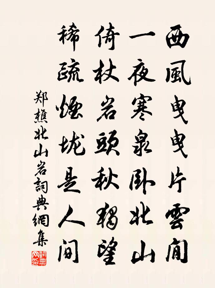 詩詞名句歷史字典書法欣賞書法字典國語詞典說文解字康熙字典古漢語字典標 題 作 者 詩 句 北山岩作者:鄭樵 朝代:宋代北山岩原文西風曳曳片雲閒,一夜寒泉臥北山。倚杖岩頭秋獨望,稀疏煙壠是人間。詩詞問答問:北山岩的作者是誰?答:鄭樵問:北山岩寫於哪個朝代?答:宋代鄭樵北山岩書法欣賞北山岩書法作品詩詞推薦元和聖德詩韓愈〔唐代〕皇帝即阼,物無違拒。曰暘而暘,曰雨而雨。維是元年,有盜在夏。欲覆其州,以踵近武。皇帝曰嘻,豈不在我。雪中會孫洙舍人飲王氏西堂戲成三絕蘇轍〔宋代〕南國高人真巨源,華堂邂逅接清樽。十年一見都如夢,莫怪終宵語笑喧。和左司張員外自洛使入京中路先赴長安逢立春日…諸公孫逖〔唐代〕拜郎登省闥,奉使馳車乘。遙瞻使者星,便是郎官應。台妙時相許,皇華德彌稱。二陝聽風謠,三秦望形勝。此中病中示兒輩陸游〔宋代〕去去生方遠,冥冥死即休。狂思攘鬼手,危至服丹頭。有劍知誰與?無香可得留。惟應勤孝謹,事事監恬侯。西湖素公愛余泊黍小詩畫為扇子姜特立〔宋代〕老子詩中那有畫,阿師畫裡自兼詩。我非今世王摩詰,子豈前身李伯詩。煙月正臨青嶂落,灘聲惟許白鷗知。可憐游琴台墨池吳中復〔宋代〕尋春景物乍晴暄,連月余寒花未繁。犬子琴台余古寺,揚雄墨沼但空園。池邊宿草交加綠,林外鳴禽相鬥喧。秀麥夕雨宋庠〔宋代〕春溜簷聲細,層波幕影斜。雷車陳後館,雲枕楚王家。桂凝霞杯蟻,蓮空蜜炬花。莫漂枝上蝶,幽夢在天涯。恭南道中有感晁公溯〔宋代〕西風夜驚林,木葉下寒浦。大江未收潦,黃流尚奔注。起看曙光開,忽已暗煙霧。靄靄空谷雲,冥冥秋江雨。昏霾與馬通判曹勛〔宋代〕皖山邃密常若春,中有仙士久隱淪。幅巾嘯傲喜接物,仿佛白鶴乘孤雲。朅來帝所暫戾止,亹亹清言償所喜。內慚陳次賈歸以二詩言別和韻送之李曾伯〔宋代〕手袖朱弦綠綺琴,身雖湖海調山林。家園千進而歸切,朋友中年別恨深。國事艱難殫我力,世情巧令聽渠任。海門嘲賀將仕二首華岳〔宋代〕吾身西圛拘猶少,君腹東床坦已多。我欲屠牛窮建節,君從歡燕小登科。冬晴臘月南州不類冬,梨花飄粉小桃紅。秋懷三十六首邵雍〔宋代〕晴窗日初曛,幽庭雨乍洗。紅蘭靜自披,綠竹閒相倚。榮利若浮雲,情懷淡如水。身非天外人,意眾天外起。江夕崔道融〔唐代〕江心秋月白,起柁信潮行。蛟龍化為人,半夜吹笛聲。鷗渚亭次韻茂洪西湖三詩張鎡〔宋代〕老了看山今益工,只憐雲氣不憐峰。抬頭斗餉無人說,自向波心汎短篷。秋胡行 其二曹操〔魏晉〕願登泰華山,神人共遠遊。願登泰華山,神人共遠遊。經歷崑崙山,到蓬萊。飄遙八極,與神人俱。思得神藥,萬讀陳公孟等伏闕書張埴〔宋代〕世故相驅入市藍,無情公用亦難堪。溫乎此豈神人肯,群也其如祖父慚。午夜天狐搖北斗,東風雨射滿江南。青山湖西雜感詩釋智圓〔宋代〕雪晴山院景堪躋,玉樹瓊樓照碧溪。日暮忽驚銷爍盡,百年豪富事還齊。蟬宋祁〔宋代〕曉腹清呼飽露津,本求仙蛻遠囂塵。貂溫范蜜非吾族,枉共花冠托此身。織婦嘆戴復古〔宋代〕春蠶成絲復成絹,養得夏蠶重剝繭。絹未脫軸擬輸官,絲未下車圖贖典。一春一夏為蠶忙,織婦布衣仍布裳;有布渡江雲·山陰久客一再張炎〔宋代〕山空天入海,倚樓望極,風急暮潮初。一簾鳩外雨,幾處閒田,隔水動春鋤。新煙禁柳,想如今、綠到西湖。猶記名句推薦為無為,事無事,味無味。老子《老子·德經·第六十三章》 楊柳散和風,青山澹吾慮。韋應物《東郊》 止戈為武。左丘明《左傳·宣公·宣公十二年》 敬他人,即是敬自己;靠自己,勝於靠他人。王永彬《圍爐夜話·第五七則》 一郡官閒唯副使,一年冷節是清明。王禹偁《清明日獨酌》 春朝物候妍,愁婦鏡台前。鄭愔《春怨》 微風搖紫葉,輕露拂朱房。沈約《詠芙蓉》 滿堂唯有燭花紅,歌且從容,杯且從容。辛棄疾《一剪梅·中秋元月》 天朗氣清,惠風和暢王羲之《蘭亭集序 / 蘭亭序》 池塘生春草,園柳變鳴禽。謝靈運《登池上樓》