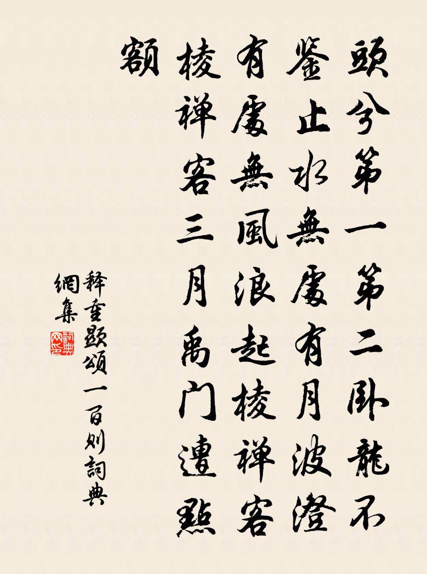 詩詞名句歷史字典書法欣賞書法字典國語詞典說文解字康熙字典古漢語字典標 題 作 者 詩 句 頌一百則作者:釋重顯 朝代:宋代頌一百則原文頭兮第一,第二臥龍。不鑒止水,無處有月。波澄有處,無風浪起。棱禪客,棱禪客,三月禹門遭點額。詩詞問答問:頌一百則的作者是誰?答:釋重顯問:頌一百則寫於哪個朝代?答:宋代釋重顯頌一百則書法欣賞頌一百則書法作品詩詞推薦贈道士蹇拱辰賀鑄〔宋代〕嘗觀妙手御風圖,想像斯人世所無。今識黃冠葆光子,爽氣飄颻畫不如。岷峨東來九千里,眼飽高山與流水。乘春送范道卿赴省試晁公溯〔宋代〕君之先世真文雄,異時奏賦蓬萊宮。誰傳副墨過沙漠,至今猶稱長嘯公。芝蘭不乏後來秀,謂將褎然為舉首。至音題天童舒坦〔宋代〕日日青鞋踏白沙,未應泛艇即靈槎。雨溪清越鳴哀玉,風蔓蜿蜓動暗蛇。曉潤芝{上竹下差}挑秀茁,午香茶灶煮偈傾一百六十九首釋智朋〔宋代〕柏山高,秋風高。打失登山屐,吹落炙脂帽。應節應不及,登高登不到。旅次衡陽裴說〔唐代〕欲往幾經年,今來意豁然。江風長借客,岳雨不因天。戲鷺飛輕雪,驚鴻叫亂煙。晚秋紅藕里,十宿寄漁船。採桑子晏幾道〔宋代〕心期昨夜尋思遍,猶負殷勤。齊斗堆金,難買丹誠一寸真。須知枕上尊前意,占得長春。寄語東鄰,似此相看有幾次韻崔同年馬上口占二首李新〔宋代〕柳花榆莢半飛空,燕子銜來盡落紅。日與長安俱未遠,可能提榼問東風。邵考功遺鮆魚及鮆醬梅堯臣〔宋代〕已見楊花撲撲飛,鮆魚江上正鮮肥。早知甘美勝羊酪,錯把蓴羹定是非。塞垣春陳允平〔宋代〕草碧鋪橫野。帶暝色、歸鞍卸。煙葭露葦,滿汀鷗鷺,人在圖畫。漸一聲雁過南樓也。更細雨、時飄灑。念徽容、廣州童謠佚名〔唐代〕羊頭二四,白天雨至。昭君詞李端〔唐代〕李陵初送子卿回,漢月明時惆悵來。憶著長安舊遊處,千門萬戶玉樓台。龍女祠後塘自生荷花數權與史誠之更相酬和司馬光〔宋代〕賀監家居逸興民,枝分鑒水闊容舠。穿荷宜去邀漁叟,共醉船頭半榼醪。題寶岩寺寒碧亭二首王安石〔宋代〕風吹洞口雲,水動山頭月。野老時問人,前村多少雪。酬李景章先輩馬戴〔唐代〕平生詩句忝多同,不得陪君奉至公。金鏑自宜先中鵠,鉛刀甘且學雕蟲。鶯啼細柳臨關路,燕接飛花繞漢宮。九陌泛小舟姑熟溪口陸游〔宋代〕姑溪綠可染,小艇追晚涼。棹進破樹影,波浪搖星芒。荻深漁火明,風遠水草香。尚想錦袍公,醉眼隘八荒。坡陀偈頌六十首釋曇華〔宋代〕西天四七,唐土二三。盡向者裹釘椿搖櫓,新東林為你諸人解纜放船。未說超宗異目,若得齊眉共矚。亦可明窗下壽周提刑二首吳泳〔宋代〕分得濂溪一派清,皇皇仁義不貪名。金華學道行持到,禹穴題輿去就輕。一節以趨何簡易,十年不調轉光明。匡時宣甫隨行有端石茶匣甚佳道中為僕夫所損某見蘇頌〔宋代〕物重齎輕豈易持,何時登頓損瑰奇。曾為什襲緹巾寶,一見寒姿不忍遺。聞梅二授德興令戲書歐陽修〔宋代〕君家小謝城,為客洛陽里。綠髮方少年,青衫喜為吏。重湖亂山綠,歸夢寄千里。洛浦見秋鴻,江南老芳芷。自言湖上夜歸陸游〔宋代〕滿鏡新霜奈老何!扁舟日日醉顏酡。樂如逐兔牽黃犬,快似麾兵卷白波。霜近菊花猶未見,雨余橙子已堪搓。湖桑名句推薦落葉人何在,寒雲路幾層。李商隱《北青蘿》 五原秋草綠,胡馬一何驕。李白《塞上曲》 不足於行者,說過;不足於信者,誠言。荀子《荀子·大略》 水色淥且明,令人思鏡湖。李白《登單父陶少府半月台》 君子將說富貴,必勉於仁也。戴聖《大戴禮記·曾子制言中第五十五》 寂寞尊前席上,唯愁海角天涯。李清照《轉調滿庭芳·芳草池塘》 非學無以廣才,非志無以成學。諸葛亮《誡子書》 碧艾香蒲處處忙。誰家兒共女,慶端陽。舒頔《小重山·端午》 朕以天下為憂,豈直一 方耶?脫脫《宋史·本紀·卷六》 暮從碧山下,山月隨人歸。李白《下終南山過斛斯山人宿置酒》