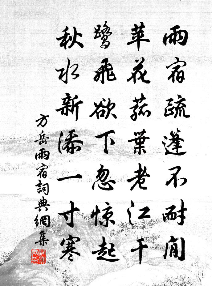 詩詞名句歷史字典書法欣賞書法字典國語詞典說文解字康熙字典古漢語字典標 題 作 者 詩 句 雨宿作者:方岳 朝代:宋代雨宿原文雨宿疏篷不耐閒,苹花菰葉老江乾。鷺飛欲下忽驚起,秋水新添一寸寒。詩詞問答問:雨宿的作者是誰?答:方岳問:雨宿寫於哪個朝代?答:宋代方岳雨宿書法欣賞雨宿書法作品詩詞推薦下元日詣會慶節所道場,呈余處恭尚書楊萬里〔宋代〕琳宮朝謁早追趨,漏盡銅壺殺點初。半縷碧雲橫界月,一規銀鏡裂成梳。自拈沉水祈天壽,散作非煙滿王虛。已被水調歌頭(和董彌大中秋)朱敦儒〔宋代〕偏賞中秋月,從古到如今。金風玉露相間,別做一般清。是處簾櫳爭卷,誰家管弦不動,樂世足歡情。莫指關山路黑水館李新〔宋代〕孤宦輪蹄消歲月,誰緣清賞慰蹉跎。曾行軒戶昔無處,見在江山今得多。雪色雲容通劍閣,鏡光池溜屬天河。本來夢遊仙/戚氏張鎡〔宋代〕歸興動,騎鶴下青冥。幾點山河浮 * ,一簪風露拂寒星。銀漢悄無聲。鸞嘯舞,仙樂送霓旌。摘得琪花飛散了,硤石遇赦李涉〔唐代〕天網初開釋楚囚,殘骸已廢自知休。荷蓑不是人間事,歸去滄江有釣舟。題新居呈王尹兼簡府中三掾白居易〔唐代〕弊宅須重葺,貧家乏羨財。橋憑川守造,樹倩府僚栽。朱板新猶濕,紅英暖漸開。仍期更攜酒,倚檻看花來。仆平日聞有此生待足何時足未老得閒方是閒之吳芾〔宋代〕寒士叨塵分已逾,不為歸計待何如。暮年光景那能久,浮世榮華總是虛。此去直須甘澹泊,箇中元自有乘除。因公冬日雜興趙蕃〔宋代〕節物他鄉晚,風聲大壑俱。深愁木斯拔,寧慮蔓難圖。杜老衣何短,顏公米已無。可憐雞瑟縮,倖免鼠睢盱。徐遜綿題三賢祠堂詩有雲士死惟留姓與名天下方回〔宋代〕黌宇祠堂塑像新,兩朝邦伯間邦民。沒身不朽緣何事,異世相知自有人。梅魄鶴魂招處士,松心鳳咮吊纍臣。宮牆屬事吟邵雍〔宋代〕鷦鷯分寄一枝巢,不信甘言便易驕。當力尚難超北海,去威何足動鴻毛。願將情意分明謝,肯把恩光取次燒。天寵留別成父弟以貧賤親戚離為韻五首趙蕃〔宋代〕人事苦好乖,咫尺當語離。及乎中年後,畏與親友辭。陶謝得道者,其言且如斯。況我乃疇人,嗚呼得無悲。偶成二首張耒〔宋代〕乍晴幽步踏斜陽,殘潦青苔曲徑荒。風擲落花填小塹,雨催芳草上空牆。贈善相程傑蘇軾〔宋代〕心傳異學不謀身,自要清時閱搢紳。火色上騰雖有數,急流勇退豈無人。書中苦覓元非訣,醉里微言卻近真。我似琴曲歌辭昭君怨梁氏瓊〔唐代〕自古無和親,貽災到妾身。胡風嘶去馬,漢月吊行輪。衣薄狼山雪,妝成虜塞春。回看父母國,生死畢胡塵。自樂城赴永嘉枉路泛白湖寄松陽李少府張子容〔唐代〕西行礙淺石,北轉入谿橋。樹色煙輕重,湖光風動搖。百花亂飛雪,萬嶺疊青霄。猿掛臨潭筱,鷗迎出浦橈。惟應偈頌一百五十首釋心月〔宋代〕德山一棒,臨濟一喝。家貧難辦素,事忙不及草。三千里外見譊訛,未免蝦跳不出斗。永遇樂危復之〔宋代〕早葉初鶯,晚風孤蝶,幽思何限。檐角縈雲,階痕積雨,一夜苔生遍。玉窗閒掩,瑤琴慵理,寂寞水沈煙斷。悄無初至葉縣黃庭堅〔宋代〕白鶴去尋王子晉,真龍得慕沈諸梁。千年往事如飛鳥,一日傾愁對夕陽。遺老能名唐郡邑,斷碑猶是晉文章。浮雲惜芳時王哲〔元代〕甲經入火分明看。庚虎在、水中遊玩。往來相送同為伴。自然是、兩家拘管。善能調養成片段。里外更使成交換。巴陵送李十二王昌齡〔唐代〕搖曳巴陵洲渚分,清江傳語便風聞。山長不見秋城色,日暮蒹葭空水雲。名句推薦霧柳暗時雲度月,露荷翻處水流螢。張元乾《浣溪沙·山繞平湖波撼城》 吳宮花草埋幽徑,晉代衣冠成古丘。李白《登金陵鳳凰台》 螣蛇無足而飛,梧鼠五技而窮。荀子《荀子·勸學》 笑別廬山遠,何煩過虎溪。李白《別東林寺僧》 這次第,算人間沒個並刀,剪斷心上愁痕。黃孝邁《湘春夜月·近清明》 馬蕭蕭,人去去,隴雲愁。孫光憲《酒泉子·空磧無邊》 春酒香熟鱸魚美,誰同醉?纜卻扁舟篷底睡。李珣《南鄉子·雲帶雨》 五月雖熱麥風清,檐頭索索繰車鳴。王建《田家行》 才大者,望自大。人所服,非言大。李毓秀《弟子規·泛愛眾》 禮尚往來。往而不來,非禮也;來而不往,亦非禮也。戴聖《禮記·曲禮上》