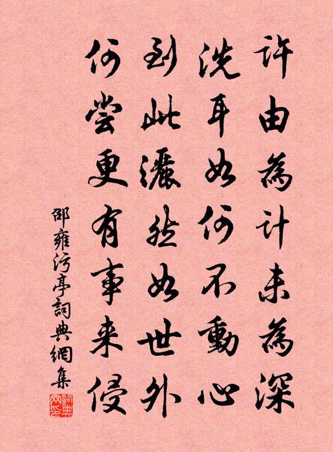 詩詞名句歷史字典書法欣賞書法字典國語詞典說文解字康熙字典古漢語字典標 題 作 者 詩 句 污亭作者:邵雍 朝代:宋代污亭原文許由為計未為深,洗耳如何不動心。到此洒然如世外,何嘗更有事來侵。詩詞問答問:污亭的作者是誰?答:邵雍問:污亭寫於哪個朝代?答:宋代邵雍污亭書法欣賞污亭書法作品詩詞推薦春日焦山觀瘞鶴銘吳琚〔宋代〕昔愛山樵書,今踏山樵路。江邊春事動,梅柳皆可賦。犖确石徑微,白浪灑衣履。臨淵魚龍驚,捫崖猿鳥懼。古刻逍遙堂二首王之道〔宋代〕獨坐虛堂寂,煙銷瓦博山。出遊魚自樂,飛倦鳥知還。花氣清風遠,槐陰白晝閒。逍遙入詩思,落筆笑談間。晏齋余自名也故常以榜自隨乃以名廳事之東偏趙蕃〔宋代〕此地何因著此君,藉之除掃簿書紛。山中為爾曾成隱,回首悠悠空暮雲。伯氏自儀真招寶覺師住持以詩促行王洋〔宋代〕白沙太守性多能,儒業箕裘祖佛燈。酒減三分留待客,草高一丈遠招僧。見成齋飯非長計,創立業林是大乘。好住題趙千里夜潮圖卷篤世南〔宋代〕風濤洶湧千堆雪,拍岩翻空倒銀闕。雁聲驚起一江秋,萬里無雲掛明月。旅泊吳門張賁〔唐代〕一舸吳江晚,堪憂病廣文。鱸魚誰與伴,鷗鳥自成群。反照縱橫水,斜空斷續雲。異鄉無限思,盡付酒醺醺。雍台歌溫庭筠〔唐代〕太子池南樓百尺,入窗新樹疏簾隔。黃金鋪首畫鉤陳,羽葆停幢拂交戟。盤紆闌楯臨高台,帳殿臨流鸞扇開。早雁賀新郎(再和前韻)劉克莊〔宋代〕夢斷鈞天宴。怪人間、曲吹別調,局翻新面。不是先生喑啞了,怕殺烏台舊案。但掩耳、蟬嘶禽囀。老去把茅依地荷花虞詔〔宋代〕晚來一棹鑑湖東,隊隊峰巒入短篷。一色藉花三十里,淡妝濃抹錦青紅。壯節亭二松趙崇鉘〔宋代〕壯節亭前野碧滋,髯龍飛去忽經時。只應黃犢蒼藤路,尚有清泉白石知。頌古一○一首釋子淳〔宋代〕瑞丱叢中懶欲眠,徐行處處迥翛然。披毛戴角人雖識,為報芒童不用鞭。南柯子(和洪丞相約賞荷花)趙磻老〔宋代〕世上淵明酒,人間陸羽茶。東山無妓有蓮花。隱隱仙家雞犬、路非賒。積靄猶張幕,輕雷似卷車。要令長袖舞胡靴樓居狂吟吳龍翰〔宋代〕胸次玲瓏著九垓,政須時復興崔巍。樓高手可捫星斗,移掇天河入酒杯。閒遊陸游〔宋代〕已破梅花一兩枝,並溪穿塢每歸遲。老軀健似中年日,鄉俗淳如太古時。上疏清狂非復昔,據鞍矍鑠欲夸誰?一端和樂天早寒劉禹錫〔唐代〕雨引苔侵壁,風驅葉擁階。久留閒客話,宿請老僧齋。酒瓮新陳接,書籤次第排。翛然自有處,搖落不傷懷。偈頌一百六十首釋宗杲〔宋代〕顛倒想生生死續,顛倒想滅生死絕。生死色處涅槃空,涅槃空處眼中屑。次韻酬季兄方岳〔宋代〕嗟哉蠹書魚,生死文字中。向來阿房賦,誰奏明光宮。長江一帆雨,半世雙鬢蓬。酒邊得吾子,擘蟹談秋風。江南如夢令譚處端〔元代〕鏡藥收來守拙。不遇知音難說。古鑒要予磨,點處便交光徹。歡悅。歡悅。袞出一輪明月。浪淘沙(次韻孫霽窗制參雨中海棠)張榘〔宋代〕春夢草茸茸。愁雨愁風。對花須拼酒頻中。莫遣枝頭銀燭暗,辜負嫣紅。推起簿書叢。何苦匆匆。慳吟卻訝少陵公呂氏春秋引鄙諺佚名〔先秦〕居者無載。行者無埋。黃金累千。不如一賢。名句推薦何計長來此,閒眠過一生。姚合《秋夜月中登天壇》 城上日出群烏飛,鴉鴉爭赴朝陽枝。柳宗元《跂烏詞》 俯皇都之宏麗兮,瞰雲霞之浮動。曹植《銅雀台賦》 殘日東風,不放歲華去。吳文英《祝英台近·除夜立春》 菩薩應如是布施。不住於相。鳩摩羅什譯《金剛經·妙行無住》 操吳戈兮被犀甲,車錯轂兮短兵接。屈原《國殤》 夫禮之初,始諸飲食戴聖《禮記·禮運》 前不見古人,後不見來者。陳子昂《登幽州台歌》 雲壓西村茅舍重,怕他榾柮同燒。陳維崧《臨江仙·寒柳》 梅落繁枝千萬片,猶自多情,學雪隨風轉。馮延巳《鵲踏枝·梅落繁枝千萬片》