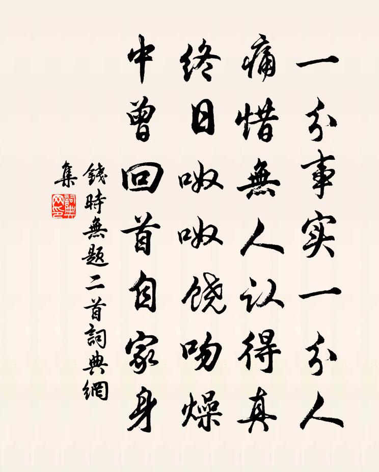 詩詞名句歷史字典書法欣賞書法字典國語詞典說文解字康熙字典古漢語字典標 題 作 者 詩 句 無題二首作者:錢時 朝代:宋代無題二首原文一分事實一分人,痛惜無人認得真。終日呶呶饒吻燥,中曾回首自家身。詩詞問答問:無題二首的作者是誰?答:錢時問:無題二首寫於哪個朝代?答:宋代錢時無題二首書法欣賞無題二首書法作品詩詞推薦董安員外之信州鉛山簿梅堯臣〔宋代〕古岸綠蒲老,春帆逆水輕。烹鮮聊以芼,泝險復兼程。可用茲時樂,無將遠道驚。曾為江上客,因贈北行人。使金傅諴〔宋代〕霜明玉節映寒流,馬渡蘆溝向上頭。萬里河山觀古塞,百年荊棘嘆神州。要臨瀚海銘燕石,石上新亭作楚囚。多少南嶽魏監廟曩自請奉祠恬於聲利十餘年來益閉牟巘五〔宋代〕阿囝離鸞嗟囑耳,誰陪老婦祭瓶盆。二雛幸足寬懷抱,共說河汾有外孫。送太常蕭博士棄官歸養赴東都劉禹錫〔唐代〕兄弟盡鴛鸞,歸心切問安。貪榮五彩服,遂掛兩梁冠。侍膳曾調鼎,循陔更握蘭。從今別君後,長憶德星看。夕月十首佚名〔宋代〕少採陳科,實日坎祭。禮備樂舉,嚴恭將事。於以奠之,嘉玉量幣。神兮昭受,陰騭萬彙。動植姜特立〔宋代〕動植湊東風,天機各自濃。花粘蜂股重,絮戀柳腰慵。王導宅馬之純〔宋代〕當時一馬渡江來,幕府山頭刈草萊。四海紛披都似此,一時締創亦艱哉。朝綱治具提還挈,國本人心壅更培。輔佐滕王閣章采〔宋代〕佩玉鳴鑾一笑空,至今華觀疊青穹。西山殘雨虹腰白,南浦驕陽雁背紅。幾度登臨添感慨,半生漂泊老英雄。檻前紫薇花杜牧〔唐代〕曉迎秋露一枝新,不占園中最上春。桃李無言又何在,向風偏笑艷陽人。子平寄惠希夷陳先生服唐福山藥方因戲作雜言文同〔宋代〕蜀江之東山色盡如赭,有道人云此是丹砂伏其下。煙雲光潤若洗濯,澗谷玲瓏如刻畫。我聞神仙草藥不在丹上生,贈朱推胡寅〔宋代〕淨綠環城亦何有,跳錦潛銀不容取。尚余翠蓋擁紅妝,兩兩三三早秋後。秋官公廨臨池傍,結筠為筏開軒窗。落日送鄭戶曹蘇軾〔宋代〕水繞袁城樓,山圍戲馬台。古來豪傑地,千載有餘哀。隆準飛上天,重瞳亦成灰。白門下呂布,大星隕臨淮。尚想次韻謝河內張明府來訪方回〔宋代〕此老良高誼,能來問故侯。人清嚴瀨水,家住沁園州。兀坐元無事,閒談幸少留。重逢定何日,歸夢在瓜疇。呈摺子明丈十首趙蕃〔宋代〕兒時已見葆真詩,寫誦抄藏不憚疲。白首始游衡岳寺,扶藜處處讀苔碑。宿范譓卿書房仇遠〔宋代〕蕙雪銷遲氣壓燈,偶然素被共姜肱。老來頓悟妻兒累,卻羨山中有發僧。幽意李新〔宋代〕綠帢纏頭錦束腰,陣前誰數霍嫖姚。何人與掃紅蕖嶂,留得周郎伴小喬。哭連州凌員外司馬柳宗元〔唐代〕廢逐人所棄,遂為鬼神欺。才難不其然,卒與大患期。凌人古受氏,吳世夸雄姿。寂寞富春水,英氣方在斯。六學小蘇家佚名〔宋代〕雙月謳訁亞輾秋碧,細風斜掩神仙宅。麥門冬長馬鬣青,茱萸蕊綻蠅頭赤。流蘇斗帳懸高壁,彩鳳盤龍繳香額。堂賀蘇邛州移鼎州兼呈八座四絕史堯弼〔宋代〕雲海相望定渺然,已驚別夢不成圓。他年勝處煩推轂,此道滄洲好待看。青門路劉駕〔唐代〕青門有歸路,坦坦高槐下。貧賤自恥歸,此地誰留我。門開送客去,落日懶回馬。旅食帝城中,不如遠遊者。舟成名句推薦見說馬家滴粉好,試燈風裡賣元宵。符曾《上元竹枝詞》 秋寂寞,秋風夜雨傷離索孫道絢《憶秦娥·季溫老友歸樵陽人來閒書因以為寄》 狗馬飾雕文,土木被緹繡。范曄《後漢書·列傳·宦者列傳》 握手西風淚不乾,年來多在別離間。納蘭性德《於中好·送梁汾南還為題小影》 紫塞門孤,金河月冷,恨誰訴?朱彝尊《長亭怨慢·雁》 豆蔻連梢煎熟水,莫分茶。李清照《攤破浣溪沙·病起蕭蕭兩鬢華》 天門中斷楚江開,碧水東流至此回。李白《望天門山》 片雲天共遠,永夜月同孤。杜甫《江漢》 大丈夫處世,當埽除天下范曄《後漢書·列傳·陳王列傳》 有過必悛,有不善必懼左丘明《國語·楚語·藍尹亹論吳將斃》