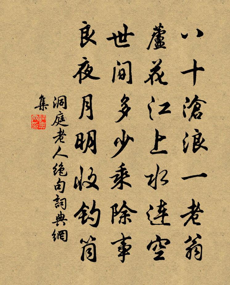 詩詞名句歷史字典書法欣賞書法字典國語詞典說文解字康熙字典古漢語字典標 題 作 者 詩 句 絕句作者:洞庭老人 朝代:宋代絕句原文八十滄浪一老翁,蘆花江上水連空。世間多少乘除事,良夜月明收釣筒。詩詞問答問:絕句的作者是誰?答:洞庭老人問:絕句寫於哪個朝代?答:宋代洞庭老人絕句書法欣賞絕句書法作品詩詞推薦白雲端和尚贊二首釋宗杲〔宋代〕少處更減,多處又添。達磨不會,卻反西天。楊柳枝詞二首皇甫松〔唐代〕爛漫春歸水國時,吳王宮殿柳絲垂。黃鶯長叫空閨畔,西子無因更得知。春入行宮映翠微,玄宗侍女舞菸絲。如今挽高孺人劉克莊〔宋代〕泝源高適譜,作媲鄭虔家。賢子搴丹桂,高才補白華。病猶觀冕輅,沒不待笄珈。阡表堪傳遠,何須挽誄加。上陽宮辭吳融〔唐代〕苑路青青半是苔,翠華西去未知回。景陽春漏無人報,太液秋波有雁來。單影可堪明月照,紅顏無奈落花催。誰能賢者之孝二百四十首魏孝子林同〔宋代〕念母嗟陟豈,思親徒望雲。可憐魏孝子,不比狄參軍。陪留守余處恭、總領錢進思、提刑傅景仁游清楊萬里〔宋代〕山自新亭走下來,化為一虎首重回。平吞雪浪三江水,臥對雨花千丈台。點檢故城遺址在,淒涼浩嘆宿雲開。六朝滄洲亭懷古林之奇〔宋代〕瀟水悠悠天際來,夾江古木抱山回。柵中人物不滿把,日晏市散多蒼苔。九疑巉天古雲埋,遙想帝子龍車回。心衰景祐孟冬祭神州地祗二首佚名〔宋代〕有煒彌文,克隆宏杓。貽此燕謀,具膺多祐。嶰律吹莩,償尊奠酒。佐乃沈潛,永祈同末。冶師行楊維楨〔元代〕湖中冶師緱長弓,有如漢代陶安公。七月七日與天通,朱雀飛來化青童。且莫隨仙踏飛鴻。道人鐵笛已在手,鐵冠答馬子山節推見寄文同〔宋代〕曾陪參畫從橐鞬,文雅當時最盛傳。玉掛好風橫飲簟,翠漪明月漾吟船。石渠金馬余何者,綠水紅蓮子尚然。好養芝贊黃庭堅〔宋代〕不生甘泉銅池邊,一莖九葉媚神天。伴余西去御魑魅,馬湖江上看蠻船。烏石山僧舍盛松坡〔宋代〕小徑通山寺,飛檐抹曉霞。松風驚蝶夢,梵磬雜蜂衙。僧臘菩提樹,禪心菡萏花。詩成因抵掌,飛起欲棲雅。游叔祖次對宅南新園計張鎡〔宋代〕入門疑是洞中天,有此人間事兩全。深窈高明俱要景,安閒榮盛未衰年。軒窗處鶴千層竹,風雨催詩十畝蓮。聞道頌古二十首釋道顏〔宋代〕三十二應不思議,十四無畏如流水。男子身中入定時,女子身中從定起。和鄧慎思未試即事難書率用秋日同文館為首句耿南仲〔宋代〕藹藹儒冠至,恢恢賢路開。才須金鑑別,人自玉山來。謝客書千卷,嵇康酒一杯。如君富術業,當與雉為媒。平旦釋文珦〔宋代〕平旦氣偏清,境界復深窔。初日上東溟,高峰最先照。會意髮長吟,何似蘇門嘯。不必諧宮商,自是山中調。口占寄林子六陳藻〔宋代〕日月相催不放遲,寄詩又是去年時。近來未省開懷否,遠似從前尚皺眉。秋夕有感二首呈督視參政岳珂〔宋代〕湯湯南紀重喉衿,縱敵來年患已深。七十萬家財與力,六千里地古猶今。薇屯正自憂無給,桑土當思徹未陰。用力南歌子呂渭老〔宋代〕遠色連朱閣,寒鴉噪夕陽。小爐溫手酌鵝黃。掩亂一枝清影、在寒窗。念遠歌聲小,嗔歸淚眼長。纖腰今屬冶遊郎新秋即事金朋說〔宋代〕池塘高柳噪新蟬,庭館秋風初入弦。撫罷瑤琴金井畔,不堪梧吉落翩翩。名句推薦彩線輕纏紅玉臂,小符斜掛綠雲鬟。蘇軾《浣溪沙·端午》 今春看又過,何日是歸年。杜甫《絕句二首》 空將漢月出宮門,憶君清淚如鉛水。李賀《金銅仙人辭漢歌》 民之從事,常於幾成而敗之。老子《老子·德經·第六十四章》 紫泉宮殿鎖煙霞,欲取蕪城作帝家。李商隱《隋宮》 回首昭陽辭落日,傷心銅雀迎秋月文天祥《滿江紅·代王夫人作》 沾衣欲濕杏花雨,吹面不寒楊柳風。志南《絕句》 故國梅花歸夢,愁損綠羅裙。孔夷《南浦·旅懷》 梅子留酸軟齒牙,芭蕉分綠與窗紗。楊萬里《閒居初夏午睡起》 銀鞍照白馬,颯沓如流星。李白《俠客行》