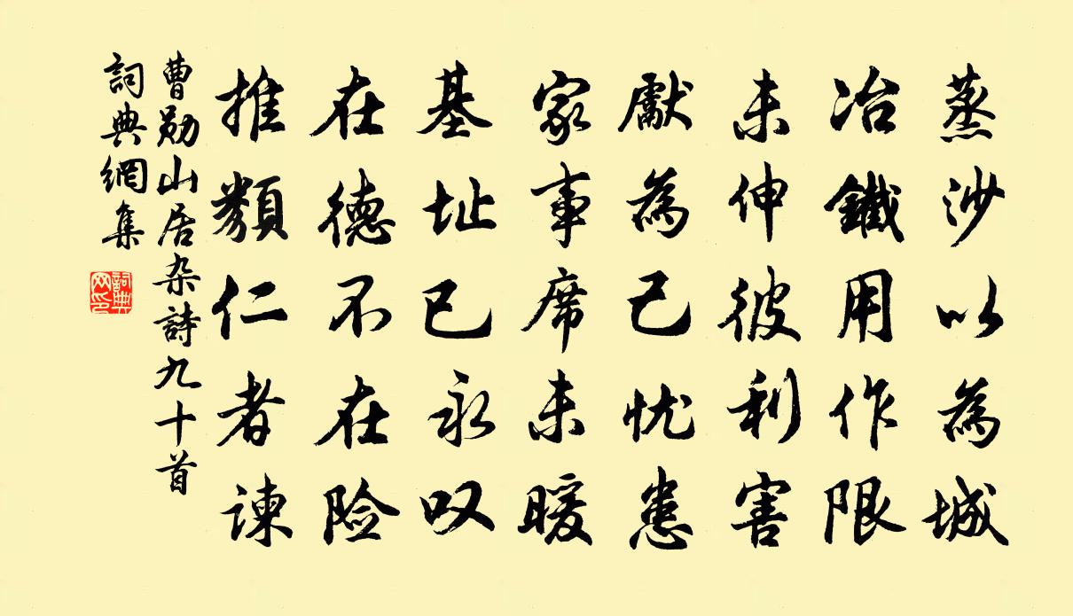 詩詞名句歷史字典書法欣賞書法字典國語詞典說文解字康熙字典古漢語字典標 題 作 者 詩 句 山居雜詩九十首作者:曹勛 朝代:宋代山居雜詩九十首原文蒸沙以為城,冶鐵用作限。未伸彼利害,先為己憂患。家事席未暖,基址已永嘆。在德不在險,推類仁者諫。詩詞問答問:山居雜詩九十首的作者是誰?答:曹勛問:山居雜詩九十首寫於哪個朝代?答:宋代曹勛山居雜詩九十首書法欣賞山居雜詩九十首書法作品詩詞推薦同泰寺楊備〔宋代〕佛事莊嚴國力疲,照天金碧倚欄危。沉檀爐上煙雲合,恰似當年煨燼時。賀林自知兄登第胡仲弓〔宋代〕賀客來遲休怪余,新篇準備暮春初。群兒得志誠逾望,一第於君非有餘。喜脫平生場屋債,飽看太古聖賢書。由來光風霽月觀鸕鶿聚灘下搜獵慈慘已而坐歲寒見錢時〔宋代〕出沒雲根上下浮,蘸蒲清溜十分幽。前灘烏鬼能撩亂,爭似盤魚得自由。有懷新筠州揚秘監寄贈八絕兼桂隱茶張鎡〔宋代〕諸子分鑣不待鞭,愈憐肥犬滿人前。何須妙處趨庭說,心學乘閒盡底傳。讀杜子美詩韓維〔宋代〕寒燈熠熠宵漏長,顛倒圖史形勞傷。取觀杜詩盡累紙,坐覺神氣來洋洋。高言大義經比重,往往變化安能常。壯哉和陶阻風於規林韻寄陳時中二首吳芾〔宋代〕退處固雲樂,未免嘆索居。賴有陳使君,情親如友於。自應長相見,豈謂各一隅。我雖事跧伏,閉門懶問塗。無日再和頤齋見寄胡仲弓〔宋代〕胸懷拍拍貯陽秋,萬里江山思遠悠。自笑半生行酒禁,可能一日免詩愁。圖書圍里誰分榻,風雨中濁獨倚樓。除卻焦山范同〔宋代〕客星底事犯宸居,輸與焦君臥草廬。萬樹遮山難覓寺,百川入海此歸墟。浮沉心事盟鷗鳥,獻替功名愧{上制下魚征婦吟陳淳祖〔宋代〕虜退沙場洗戰斑,誰家不上望夫山。江邊迤邐春無賴,楊柳枝垂人不還。樂府許棐〔宋代〕妾心如鏡面,一規秋水清。郎心如鏡背,磨殺不分明。【大石調】六國朝睢景臣〔元代〕收心長江浪險,平地風恬。恨世態柳顰頻眉,順人情花笑靨。烏兔東西急,白髮重添;寒暑往來侵,朱顏退染。穿明堂觀禮雜詠十三首回龍橋望駕王同祖〔宋代〕回龍橋上望龍顏,毅采英英仰視難。須信吾皇自神武,何憂中國不尊安。病起雜言陸游〔宋代〕國不可以無菑眚,身不可以無疢疾。無菑之國亂或更速,無疾之身死或無日。昆夷玁狁無害於周之王,辟士富國無送子文雜言范成大〔宋代〕隊谷雲低梅雨多,黃山滌源溪涌波。南風匝地送歸客,雙槳下瀨如投梭。嚴夫子,君舉酒,我其為君歌。萬山叢叢夜宿南山僧寺錢選〔宋代〕高樓一日賞新晴,白羽停揮倚繡楹。塵世可憐人易老,海門還見月長生。蓬瀛縹緲南山小,殿閣森羅北斗橫。今古題清泉院胡仲弓〔宋代〕孤僧如槁木,住處遠人煙。山有千年寺,名因一派泉。堂虛遺像暗,壁敗野藤穿。坐座空塵積,無人來叩禪。初入平低書院劉過〔宋代〕雪屋彈琴泛作聲,寂無人語紙窗明。倦遊識破諸緣妄,心與梅花一處清。教授未著作還梅堯臣〔宋代〕何以擬君子,雲鴻肅羽儀。將過上林苑,先集孝王池。唼藻有餘樂,漸磐方得時。野塘歸莫晚,白水遠連陂。次韻何學諭送行二首陳造〔宋代〕湖山迎客棹,觸目總宜詩。回首蓬萊近,平生汗漫期。衰年得奇觀,往事屬懷思。何日鴟夷去,扁舟共翠眉。奉和御製讀唐書夏竦〔宋代〕天祚文皇德,元成雅道施。納忠裨闕政,偃革致昌期。宴喜刀方解,人亡鑒遽隳。數行遺奏在,猶可動神祗。名句推薦君子無入而不自得焉。子思《中庸·第十四章》 山檣谷塹依然在,弱吐強吞盡已空。杜牧《題武關》 佳節清明桃李笑,野田荒冢只生愁。黃庭堅《清明》 人怕三見面,樹怕一墨線。佚名《增廣賢文·下集》 舉頭紅日白雲低,四海五湖皆一望。唐寅《伯虎扮乞兒,作詩騙酒》 君知妾有夫,贈妾雙明珠。張籍《節婦吟·寄東平李司空師道》 且樂生前一杯酒,何須身後千載名?李白《行路難三首》 暗相思,無處說,惆悵夜來煙月。韋莊《應天長·別來半歲音書絕》 樓前綠暗分攜路,一絲柳、一寸柔情。吳文英《風入松·聽風聽雨過清明》 憑欄久,黃蘆苦竹,擬泛九江船。周邦彥《滿庭芳·夏日溧水無想山作》